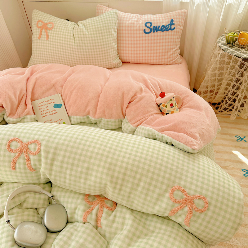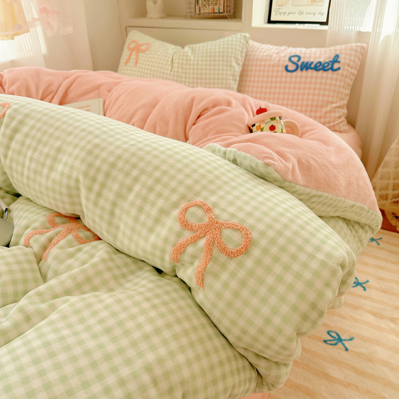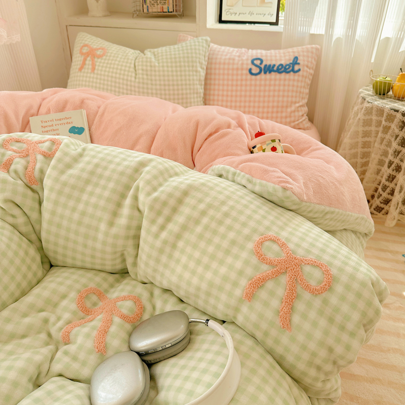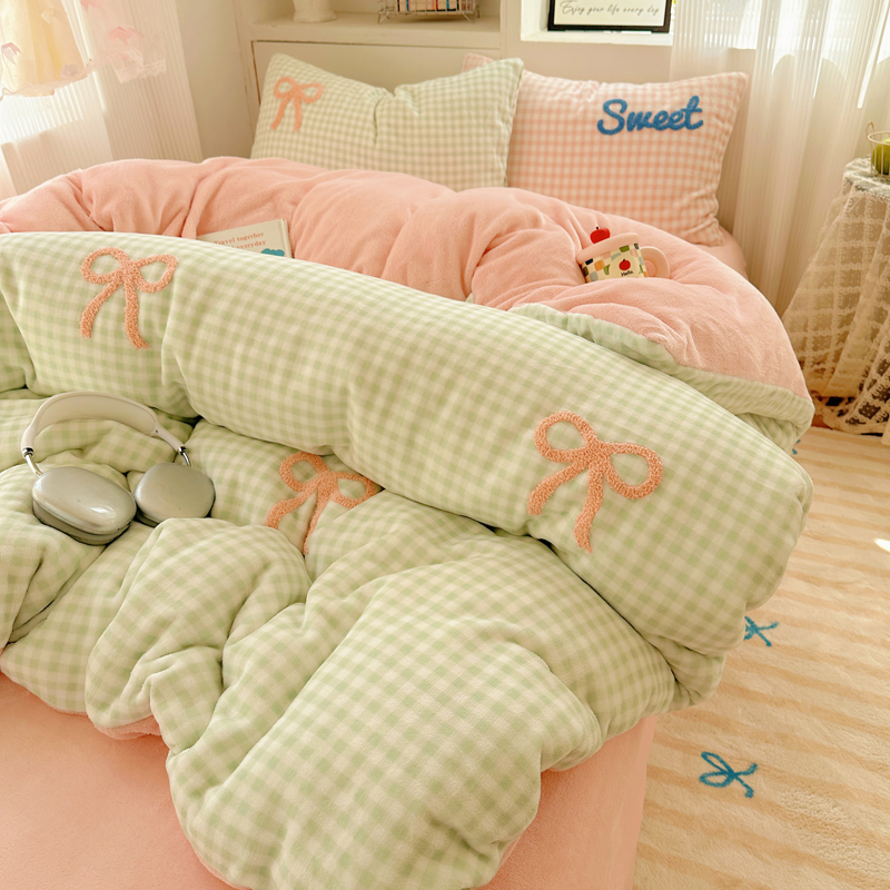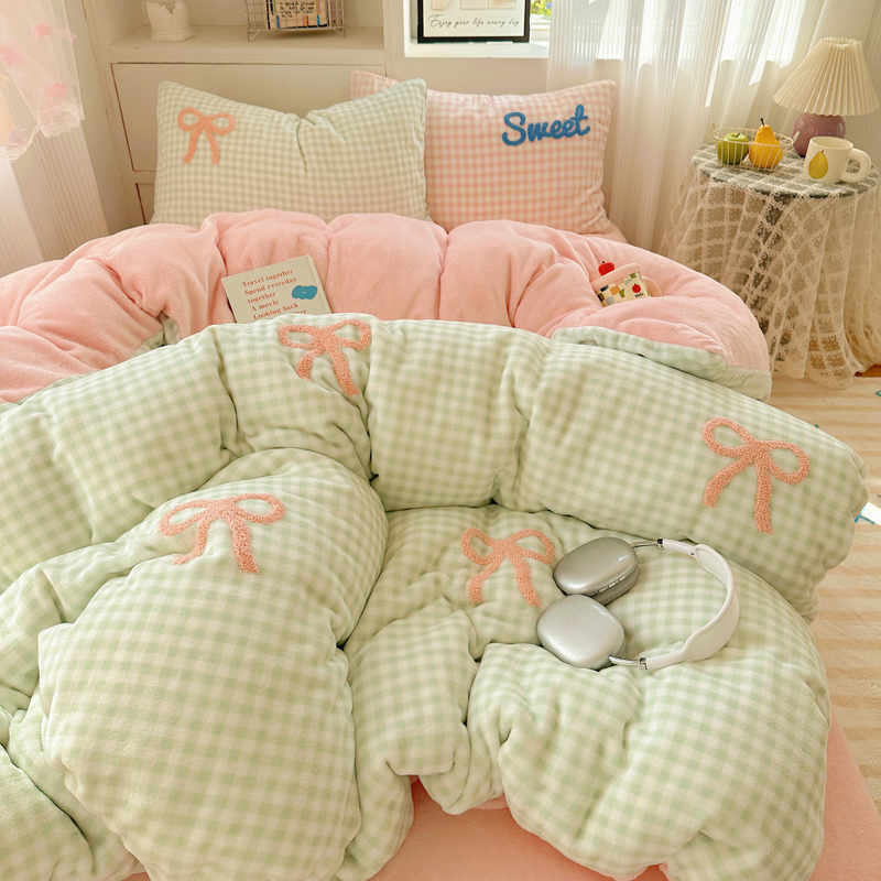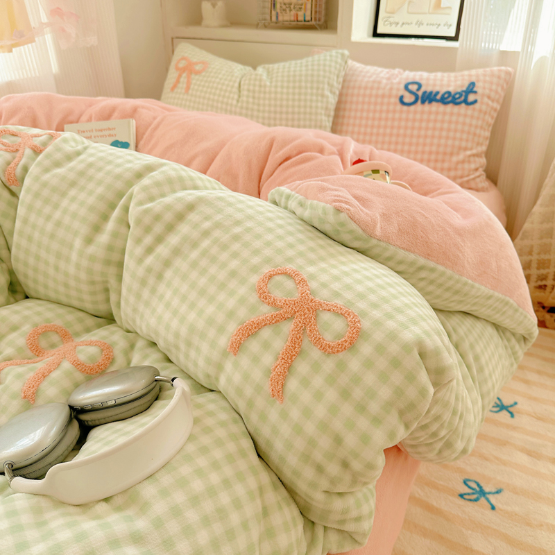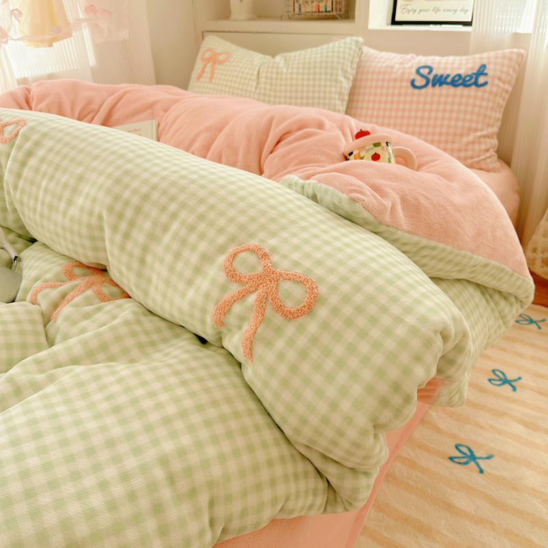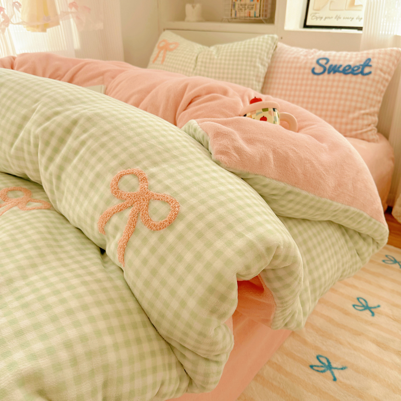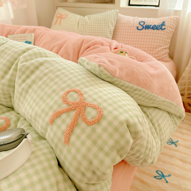 当前位置: 91家纺网 > 商品网购 > 床品套件 > 四件套 > 牛奶绒四件套 > 慕尚 2025新款可爱大眼睛蝴蝶结牛奶绒四件套 蝴蝶结绿格粉