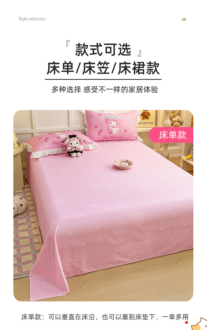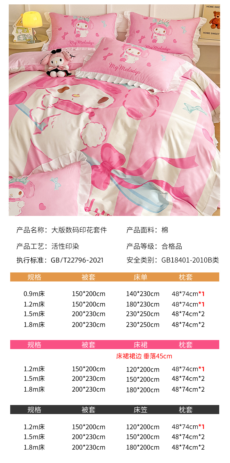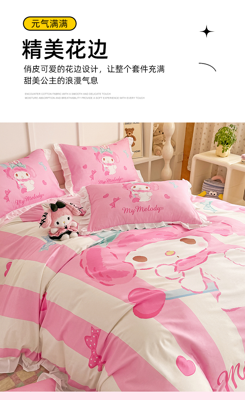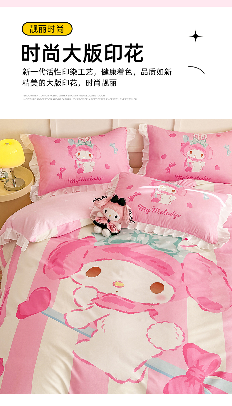 当前位置: 91家纺网 > 商品网购 > 床品套件 > 四件套 > 全棉普通四件套 > 玉元坊 2025年新款三丽鸥系列数码印花纯棉全棉床裙三件套四件套-花边款式 大版花边-甜心美乐蒂