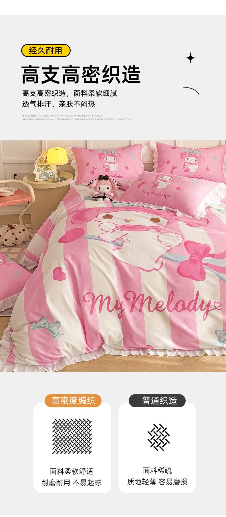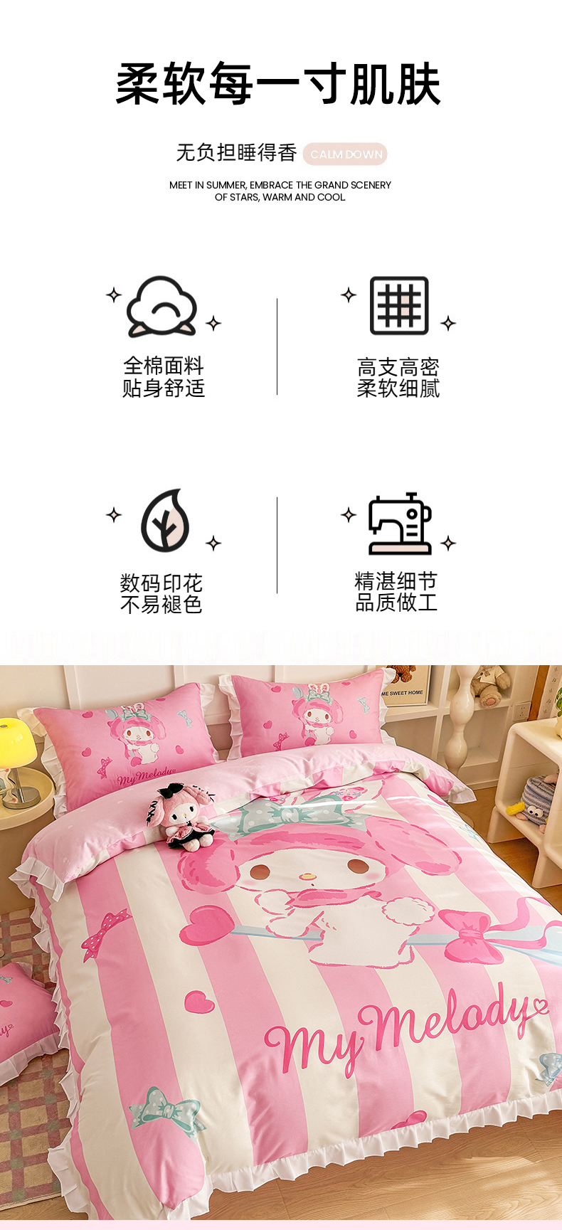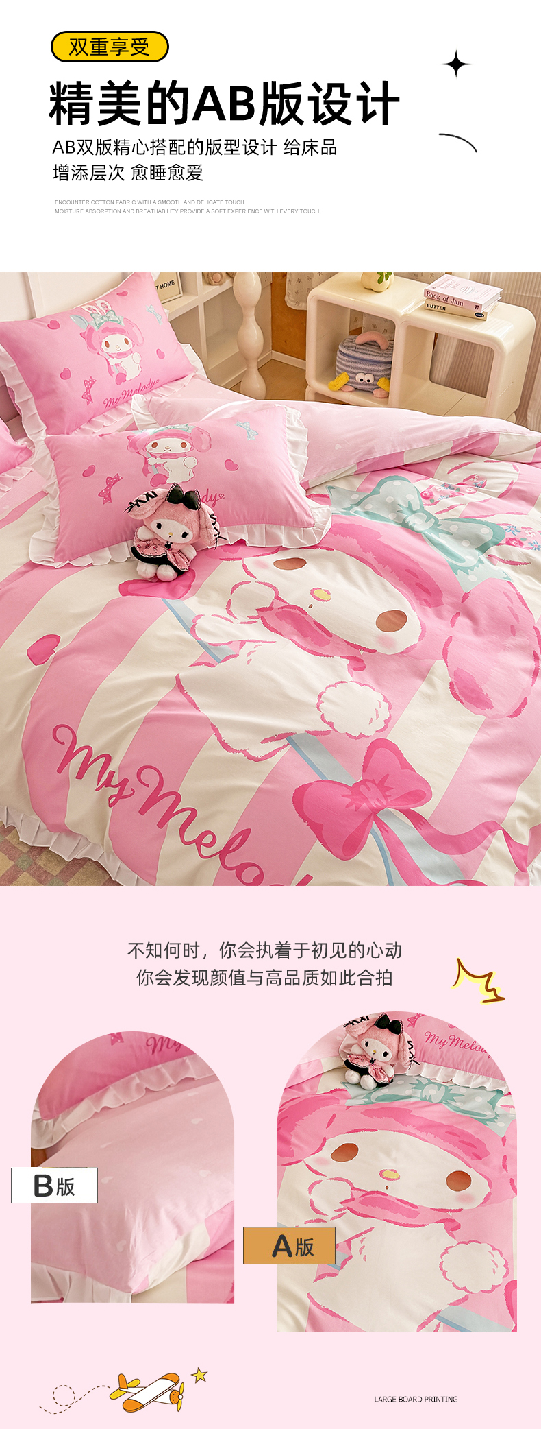 当前位置: 91家纺网 > 商品网购 > 床品套件 > 四件套 > 全棉普通四件套 > 玉元坊 2025年新款三丽鸥系列数码印花纯棉全棉床裙三件套四件套-花边款式 大版花边-甜心美乐蒂