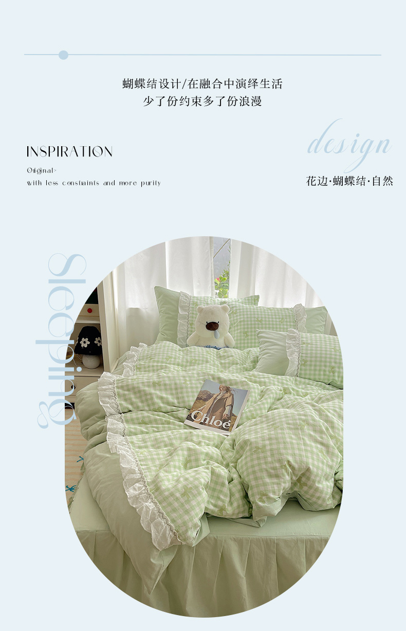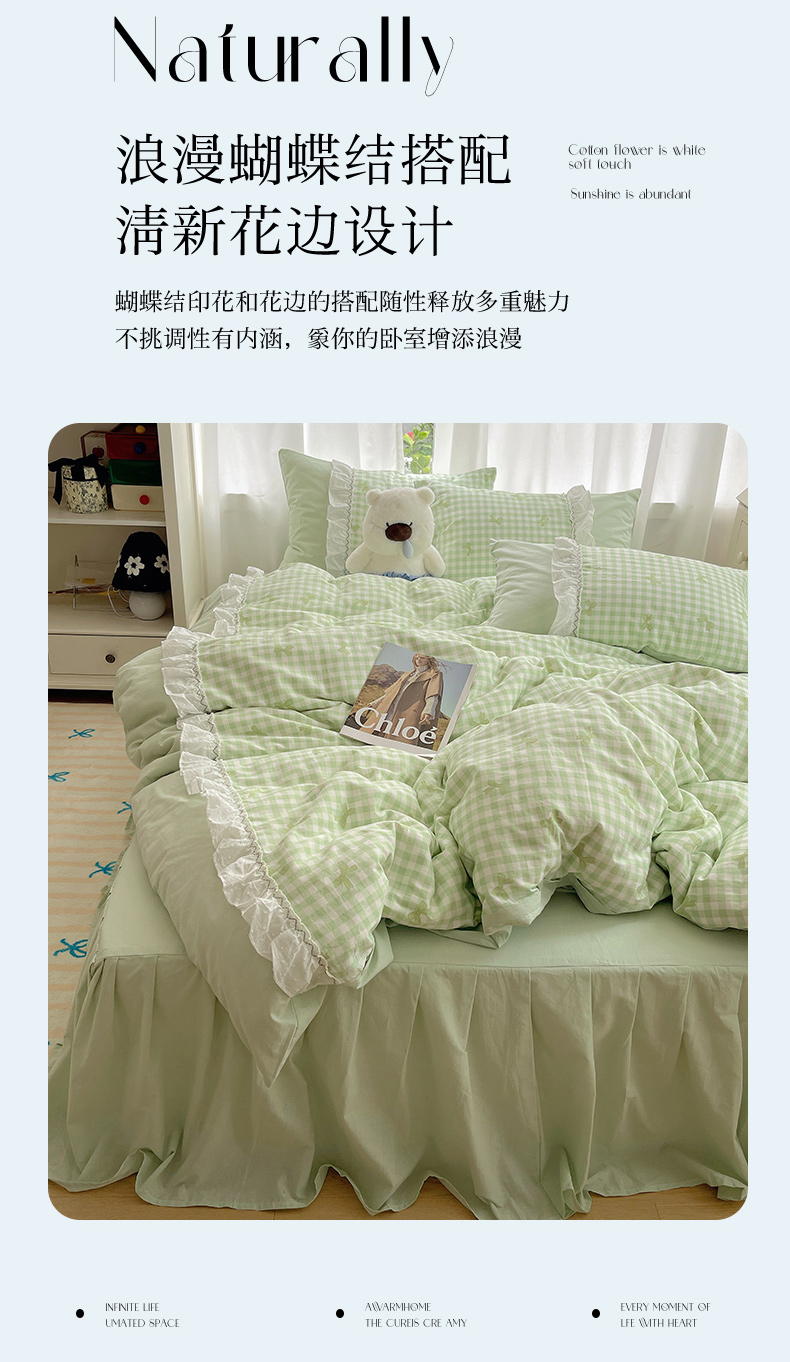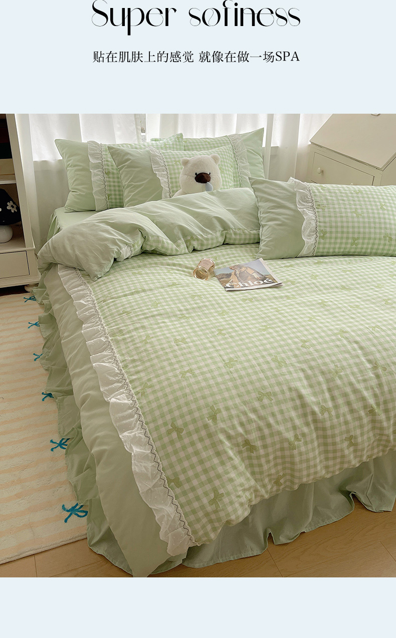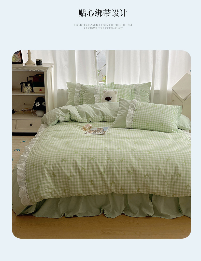 商品名称:瑞莱 2025冬季新款13372舞动花边全棉四件套系列 绿格蝴蝶结