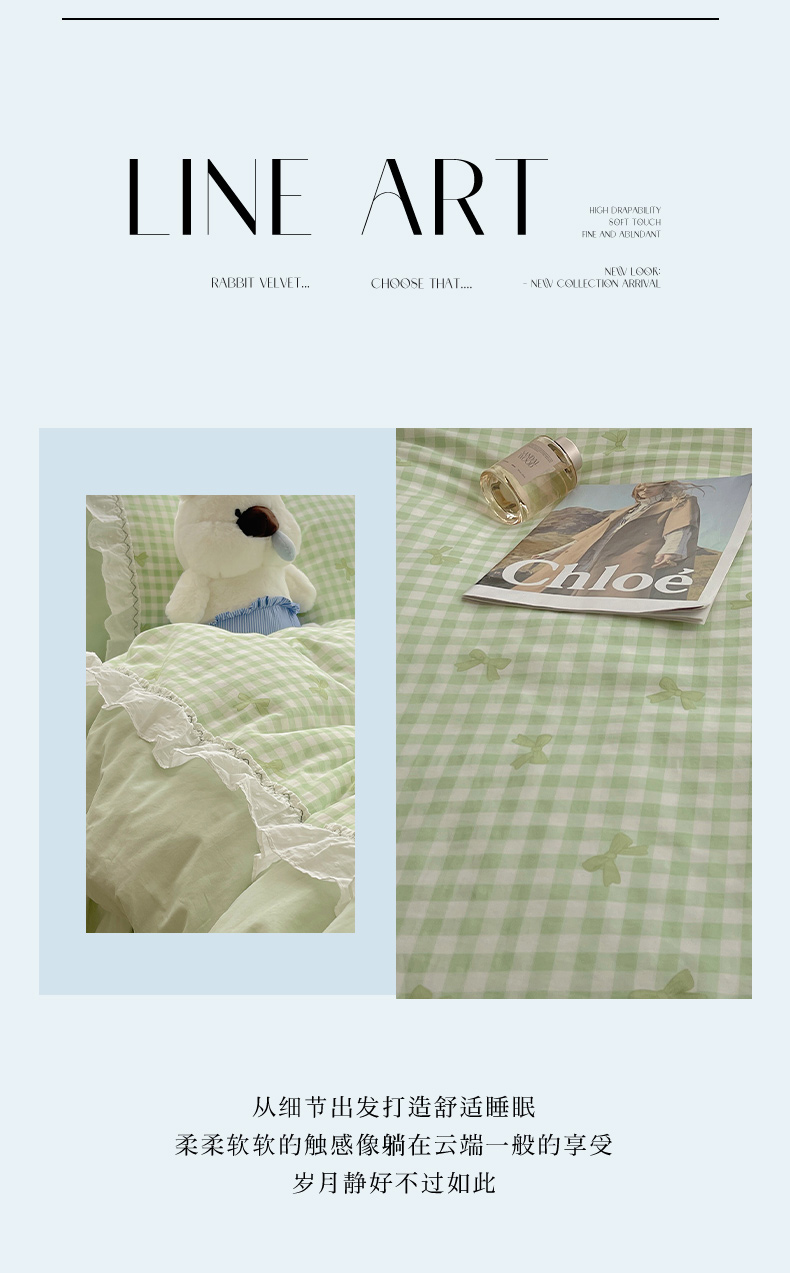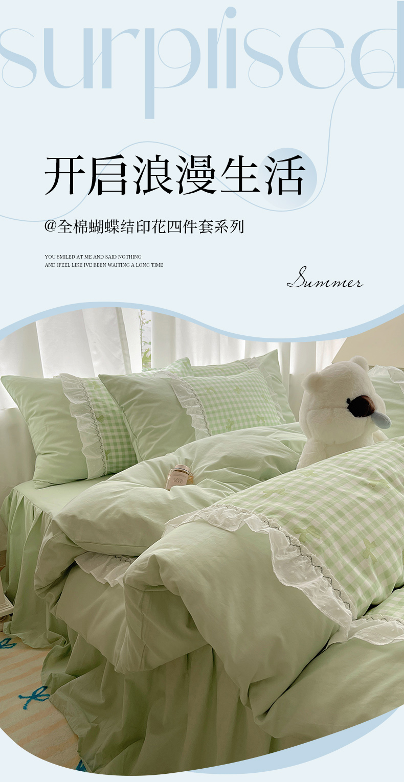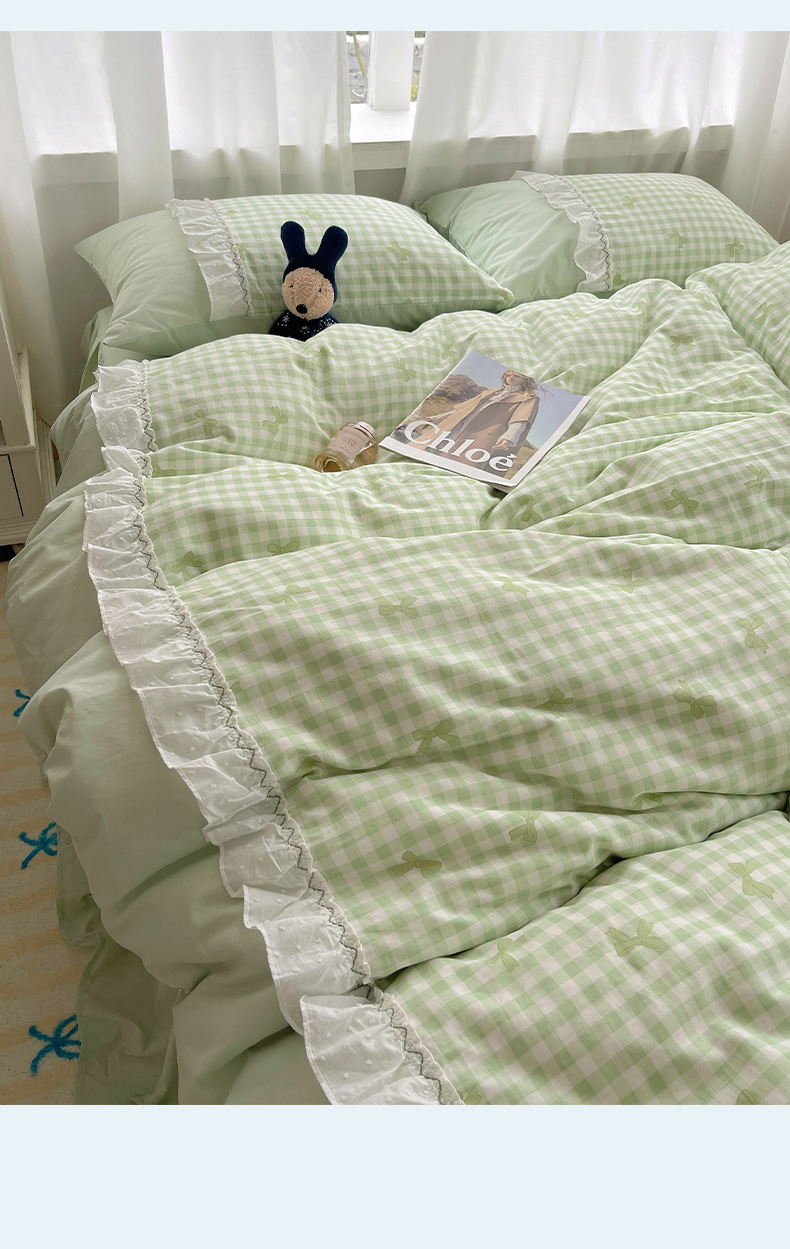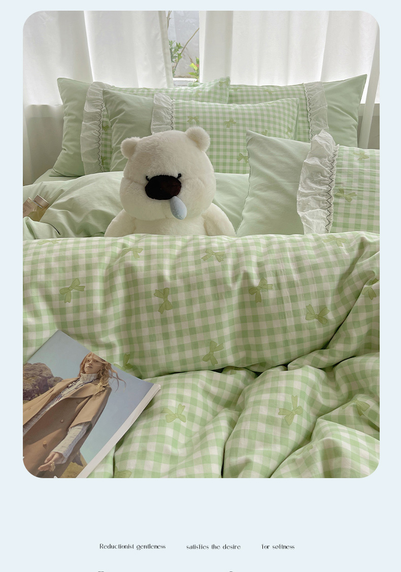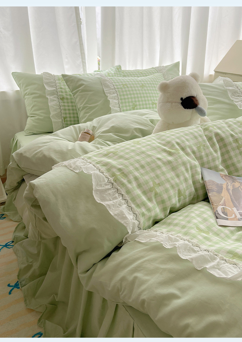 瑞莱 2025冬季新款13372舞动花边全棉四件套系列 绿格蝴蝶结