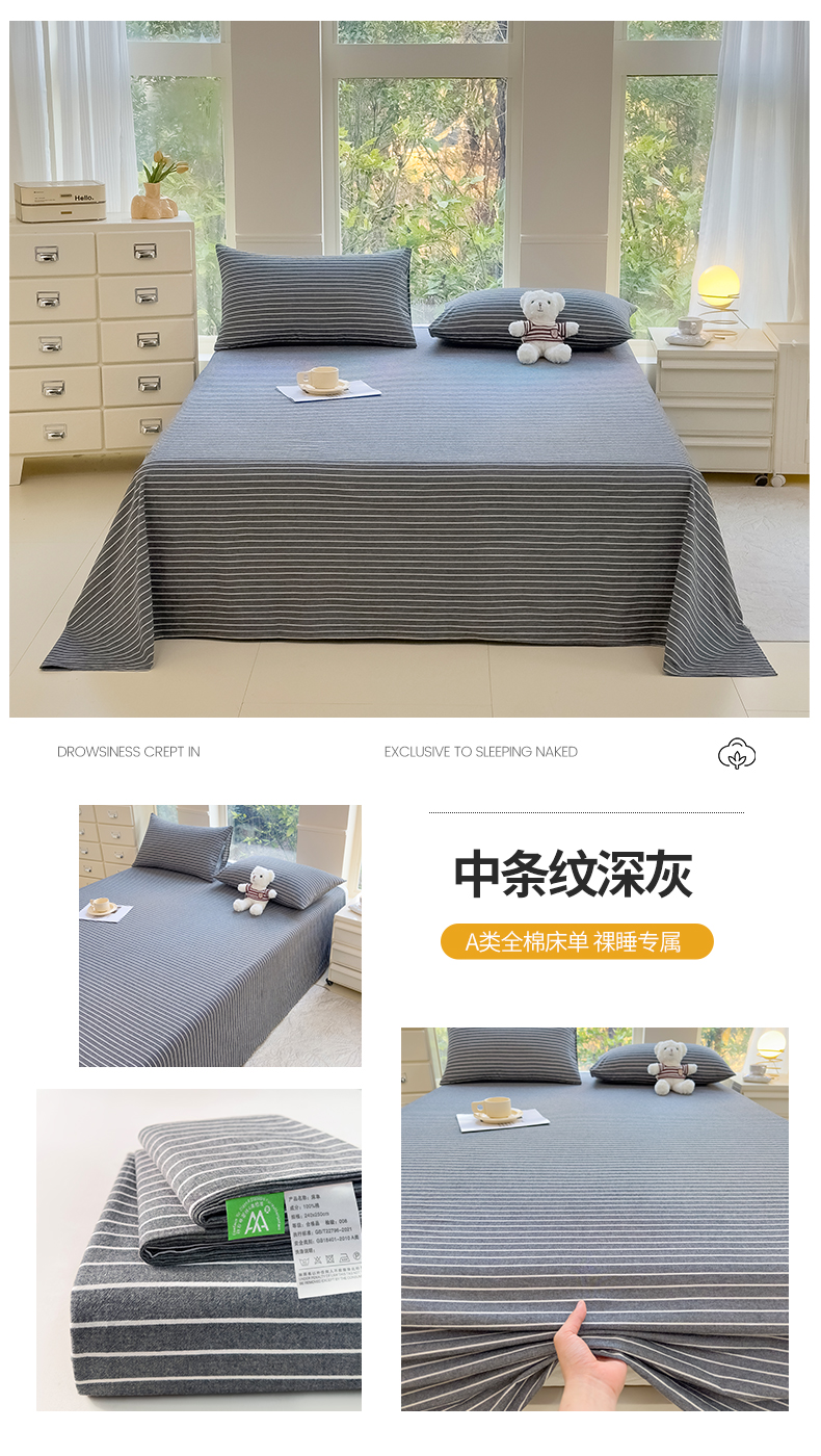 • 91家纺网 家纺一手货源 找家纺 柠萌家居 2025新款无印风全棉色织A类母婴级纯棉水洗棉床单 中条纹深灰