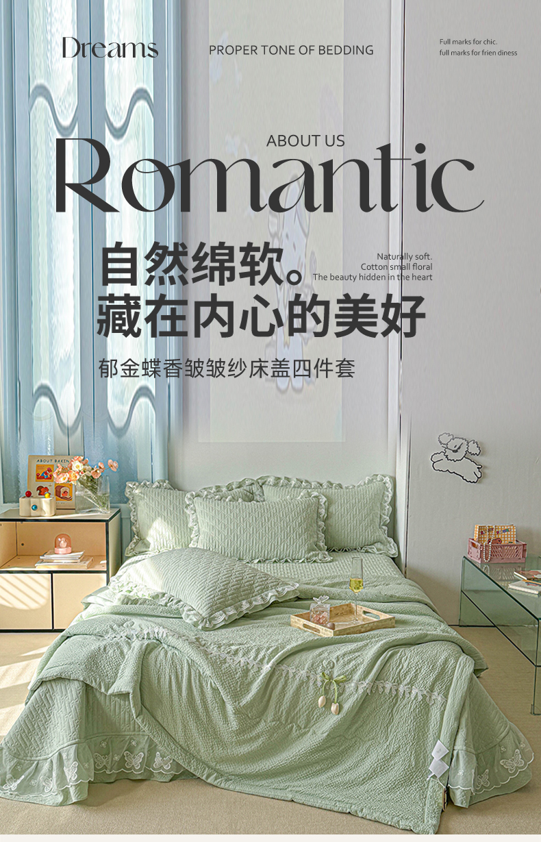 商品名称:源舜家纺 2025新款郁金蝶香皱皱纱床盖夏被四件套 绿色