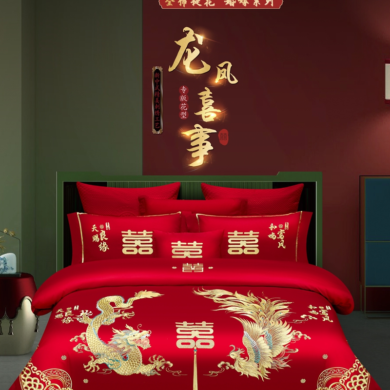 栩裕纺织 2025新款全棉刺绣婚庆四件套 龙凤喜事