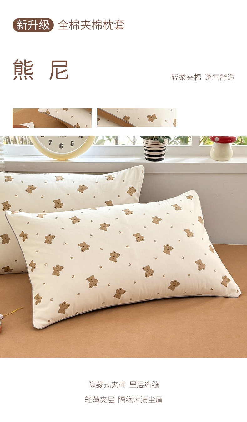 商品名称:元元被芯 2025新款40支13372全棉印花全棉隐藏式夹棉枕套 熊尼