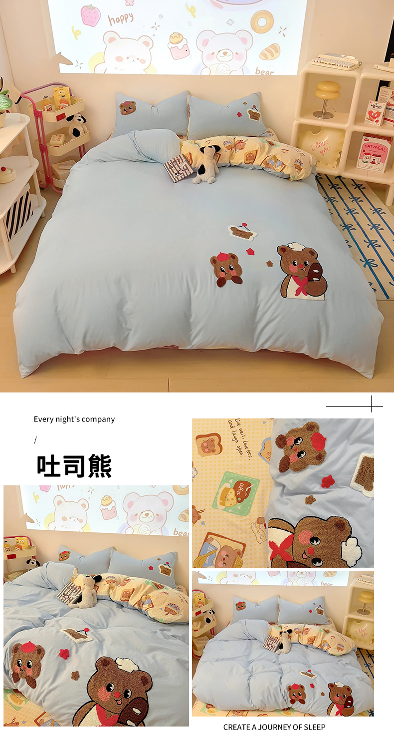 当前位置: 91家纺网 > 商品网购 > 床品套件 > 四件套 > 毛巾绣四件套 > 易辰美家纺2025新款超柔水洗棉印花毛巾绣四件套 吐司熊