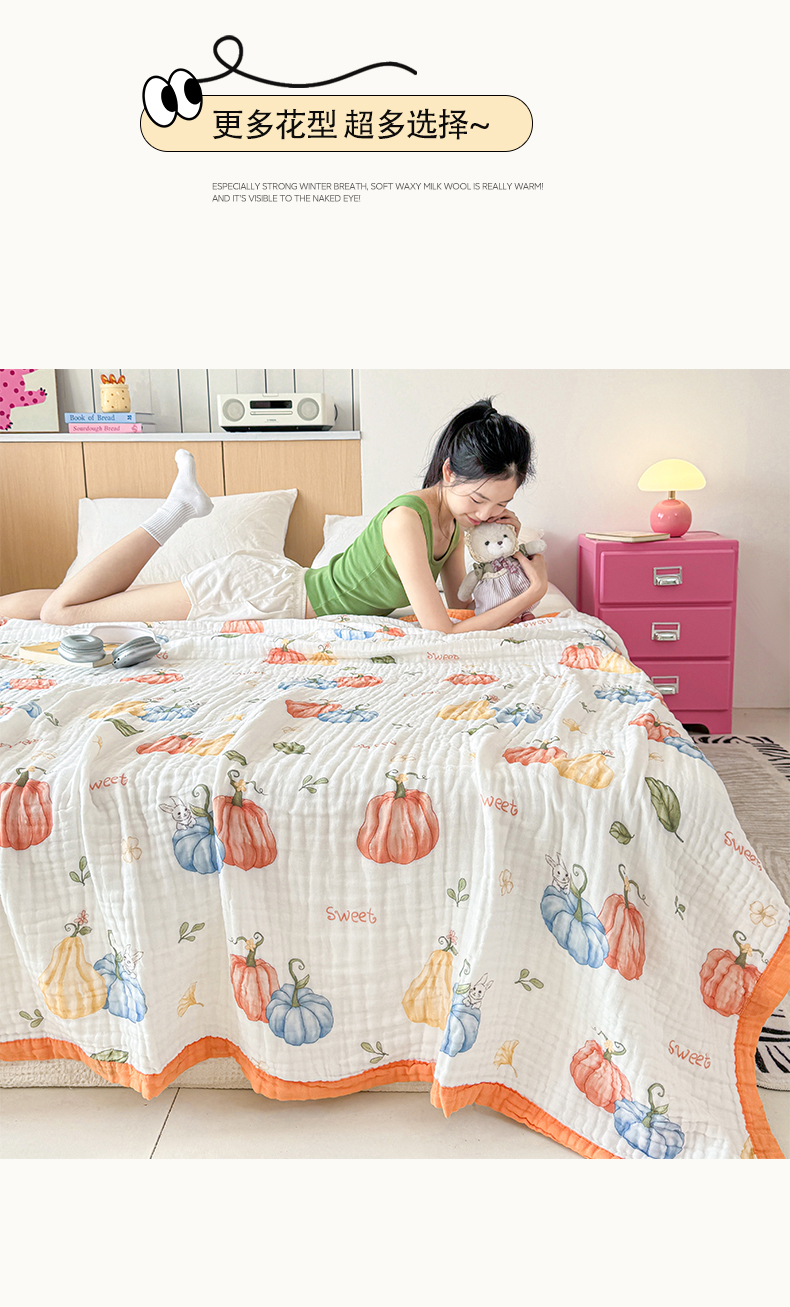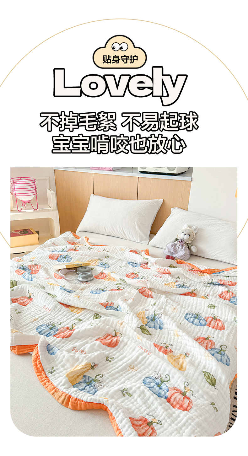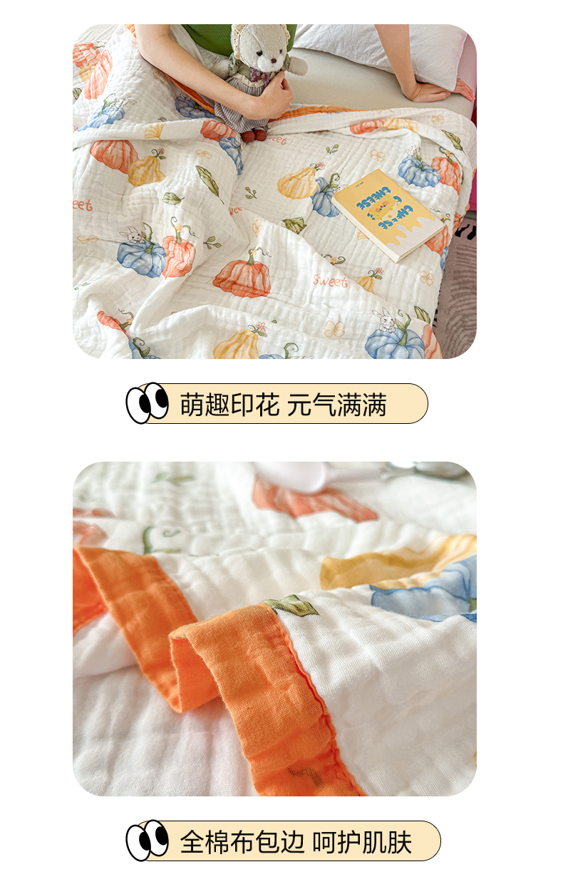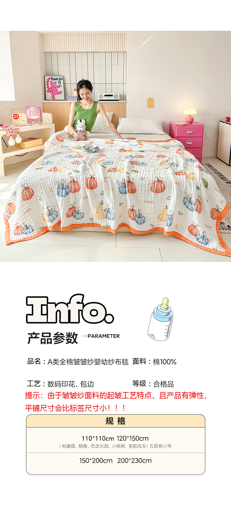商品名称:棠薇家纺 2025新款全棉六层皱皱纱婴幼毯泡泡纱印花盖毯包被浴巾 彩南瓜