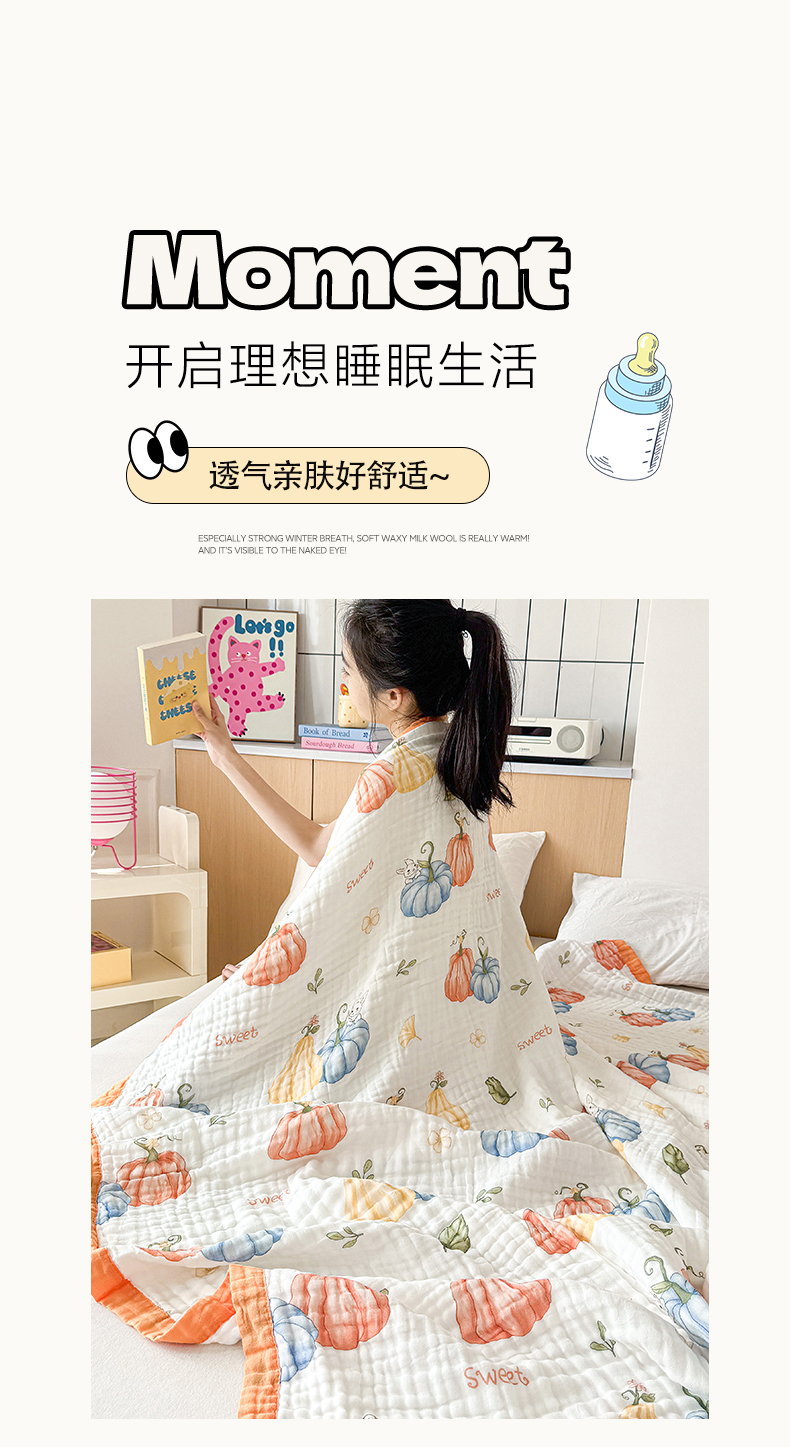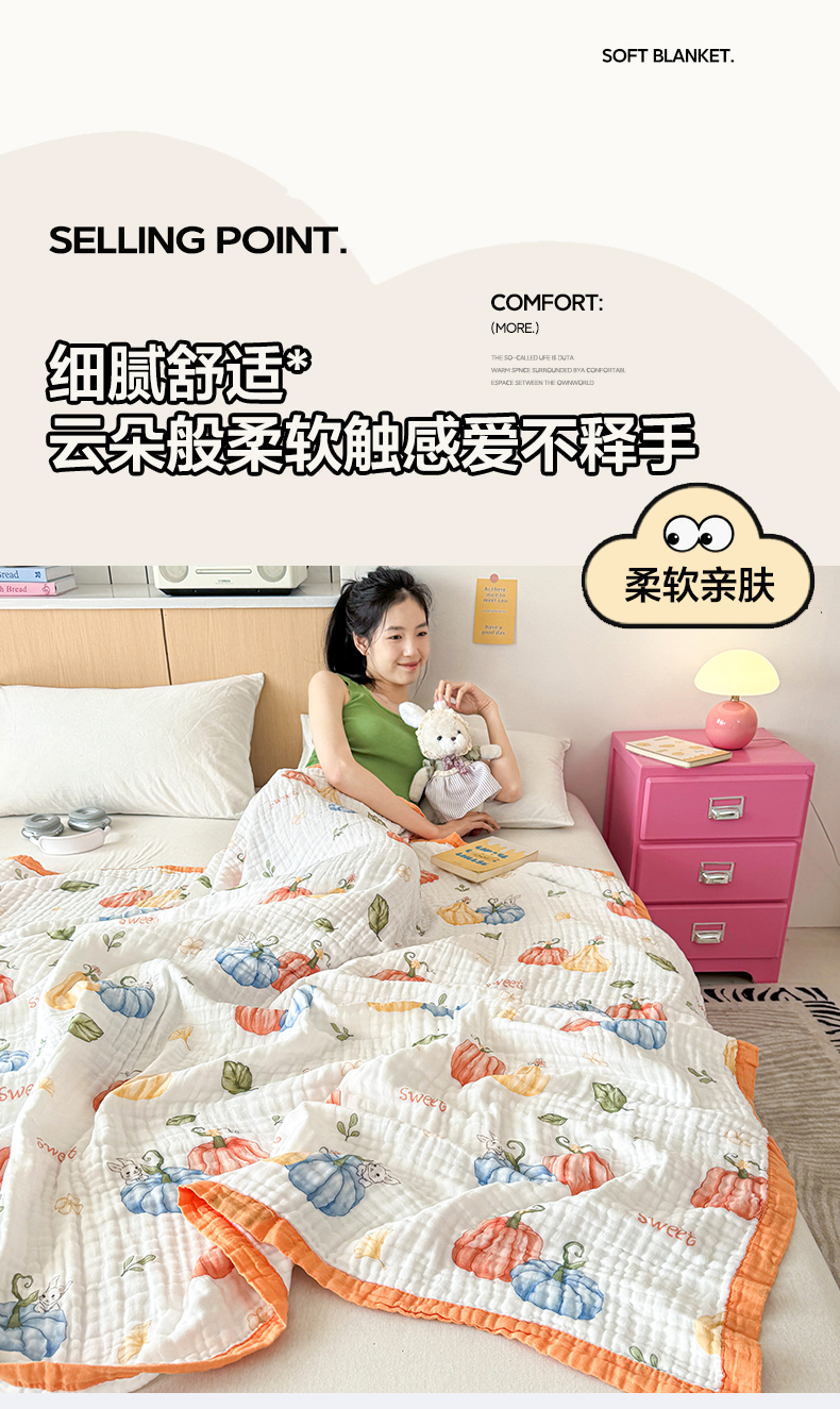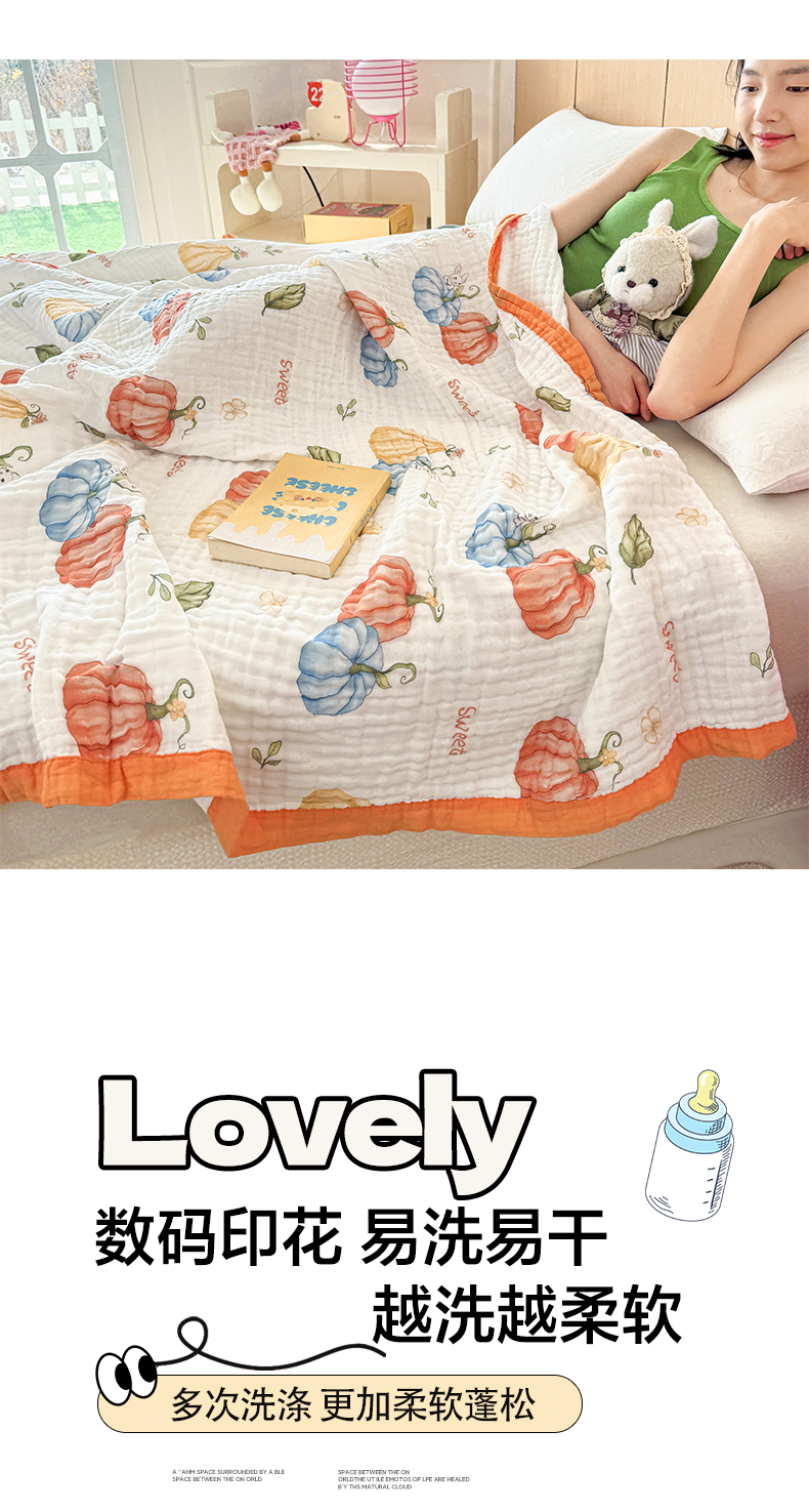 商品名称:棠薇家纺 2025新款全棉六层皱皱纱婴幼毯泡泡纱印花盖毯包被浴巾 彩南瓜