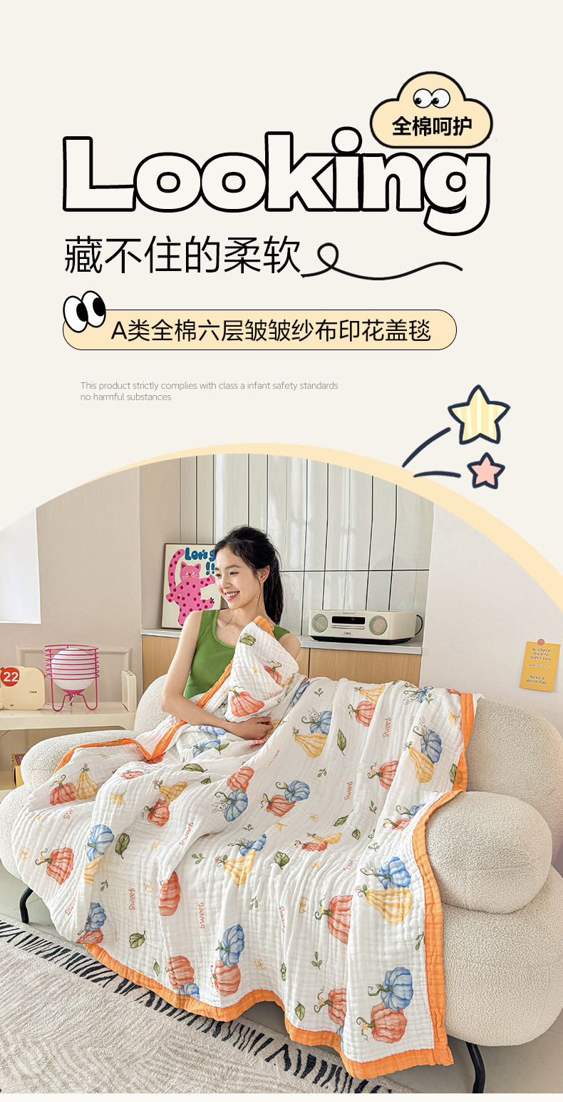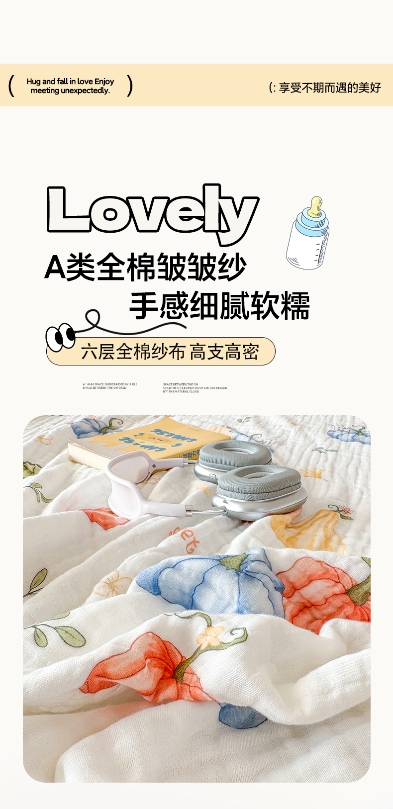 棠薇家纺 2025新款全棉六层皱皱纱婴幼毯泡泡纱印花盖毯包被浴巾 彩南瓜