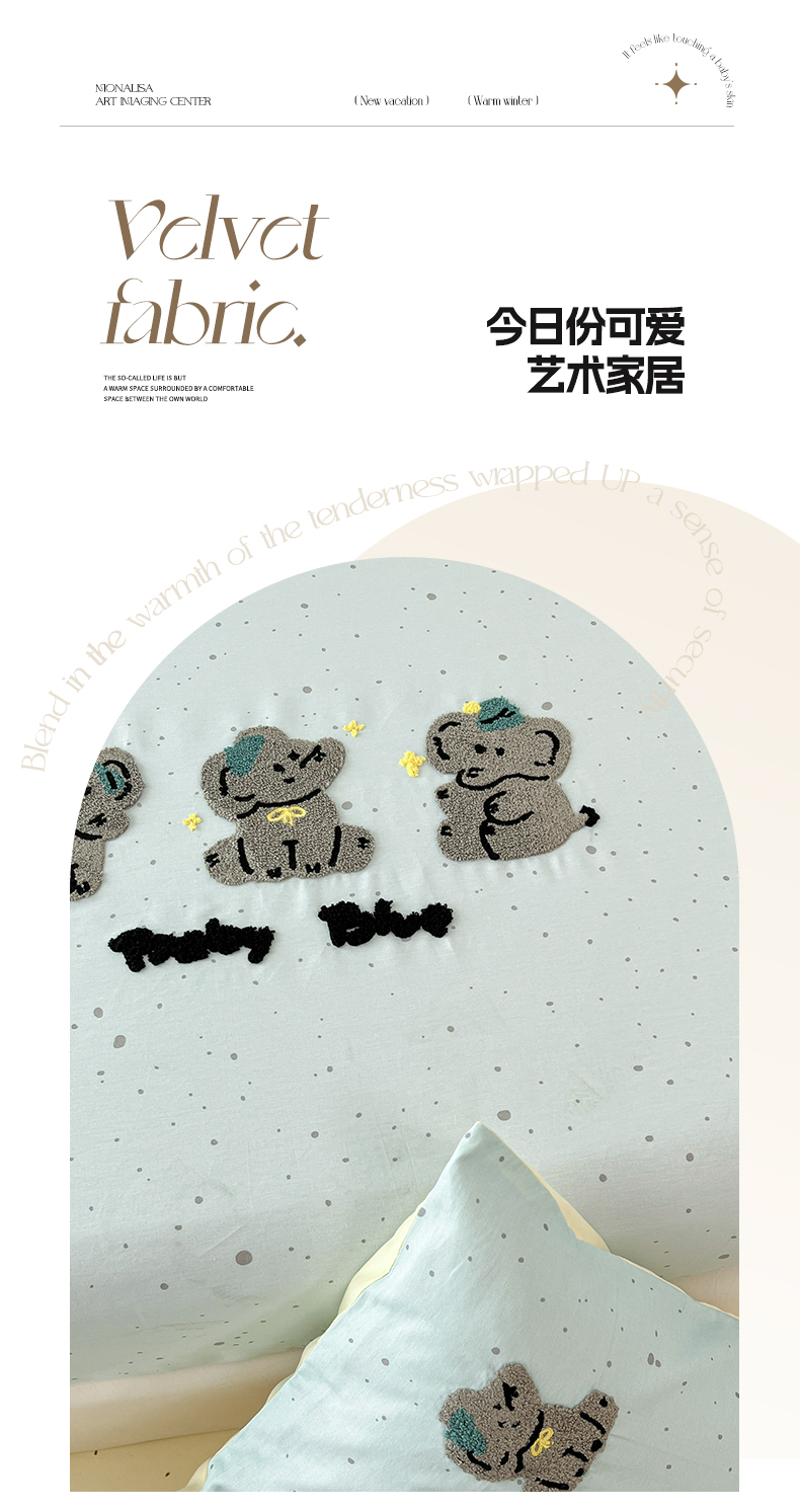 (总)雅居纺家纺 2026新款全棉双层纱毛巾绣四件套,蛋糕猫咪,红苹果小狗,萌宠甜品,早安兔兔