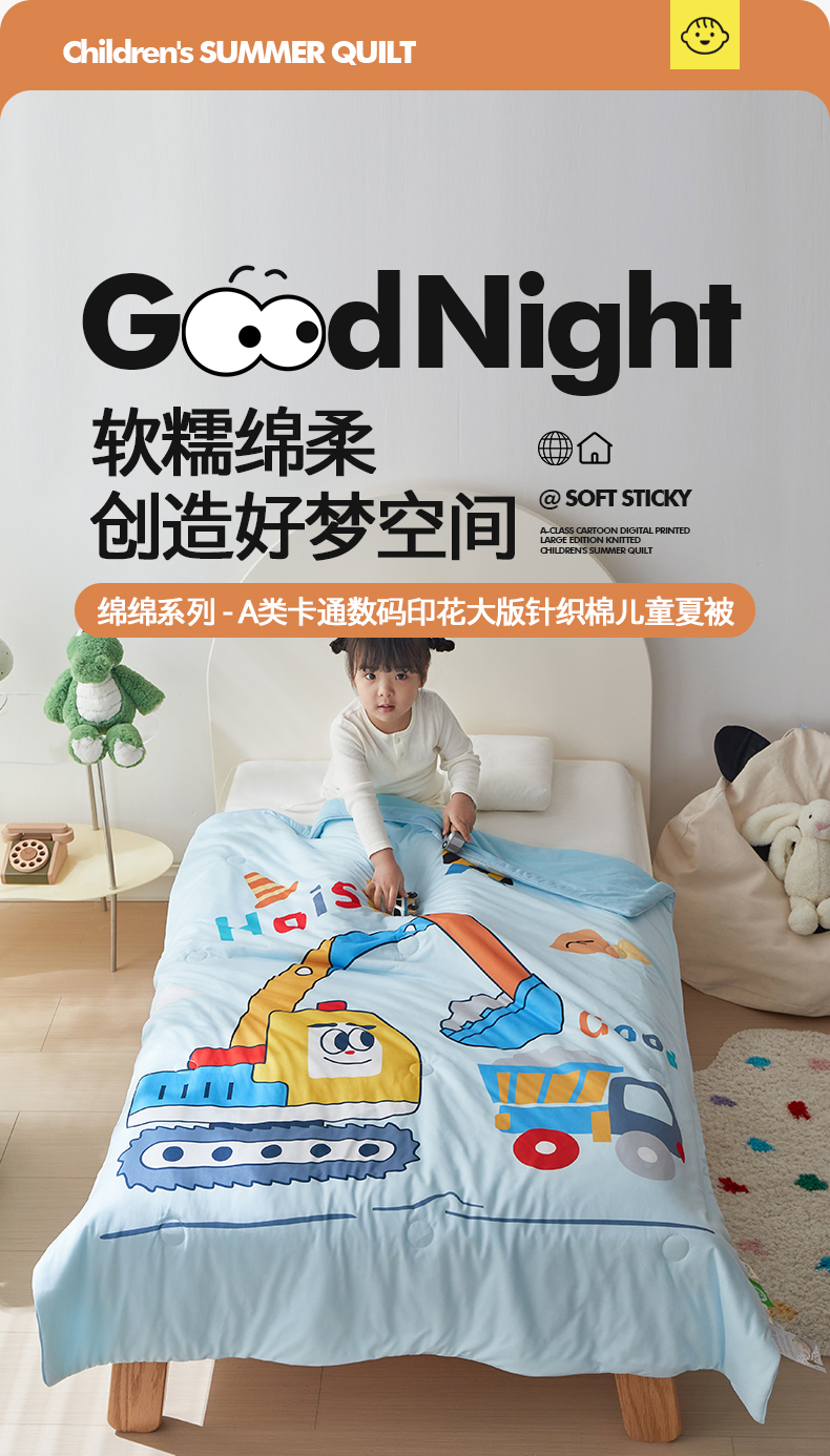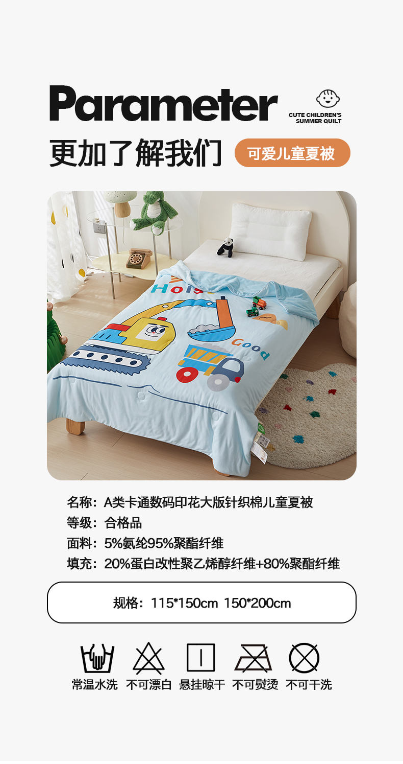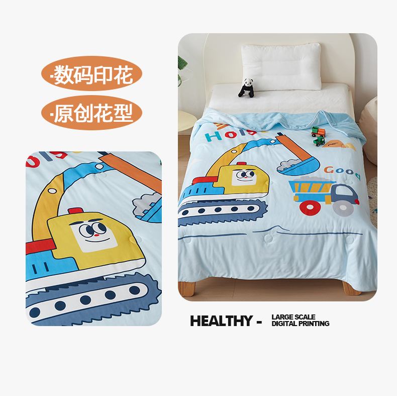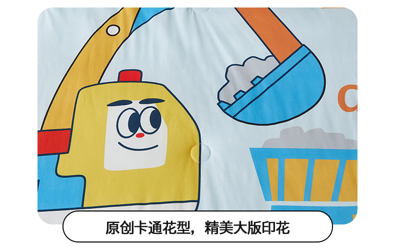商品名称:荷马之梦 2025新款卡通数码印花大版针织棉儿童夏被-绵绵系列 工程小车队