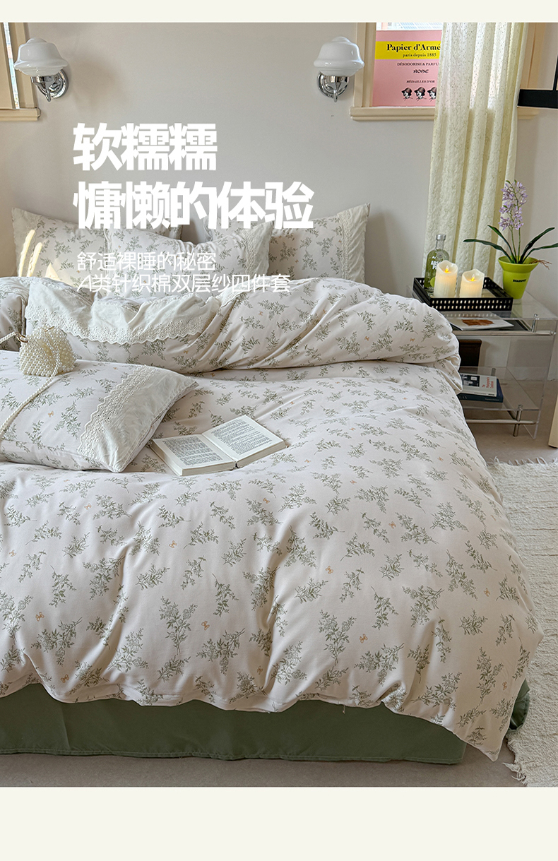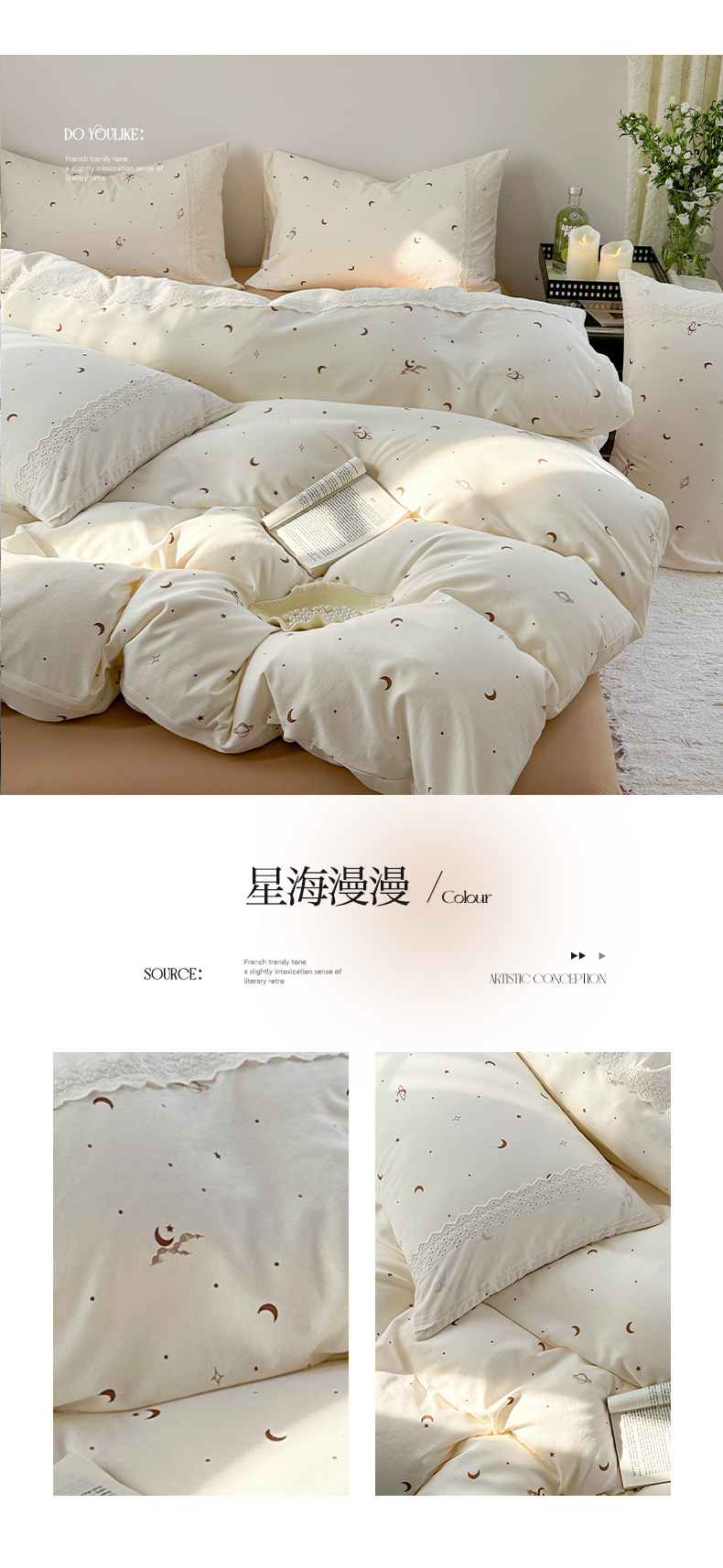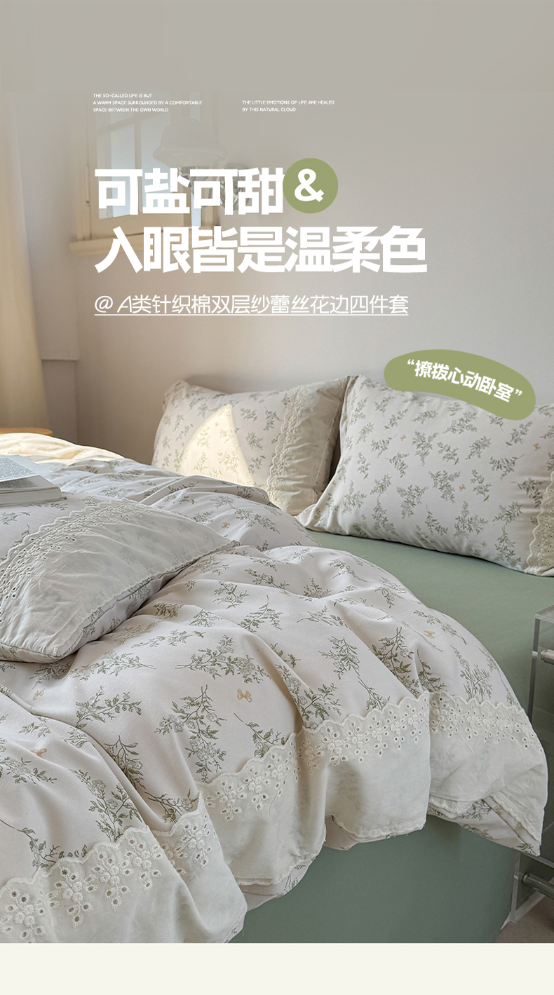 当前位置: 91家纺网 > 商品网购 > 床品套件 > 四件套 > 针织棉四件套 > 2025新款A类针织棉双层纱蕾丝花边四件套 随风摇曳