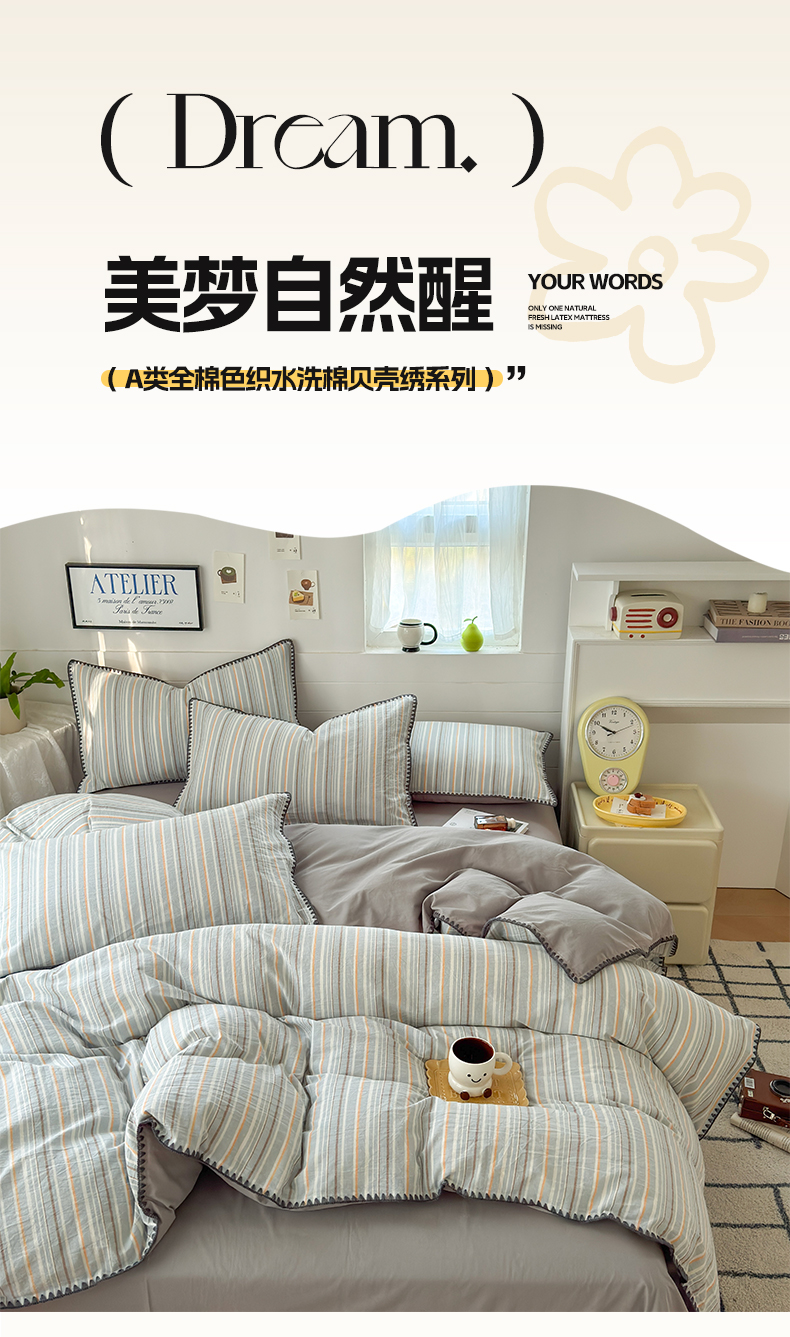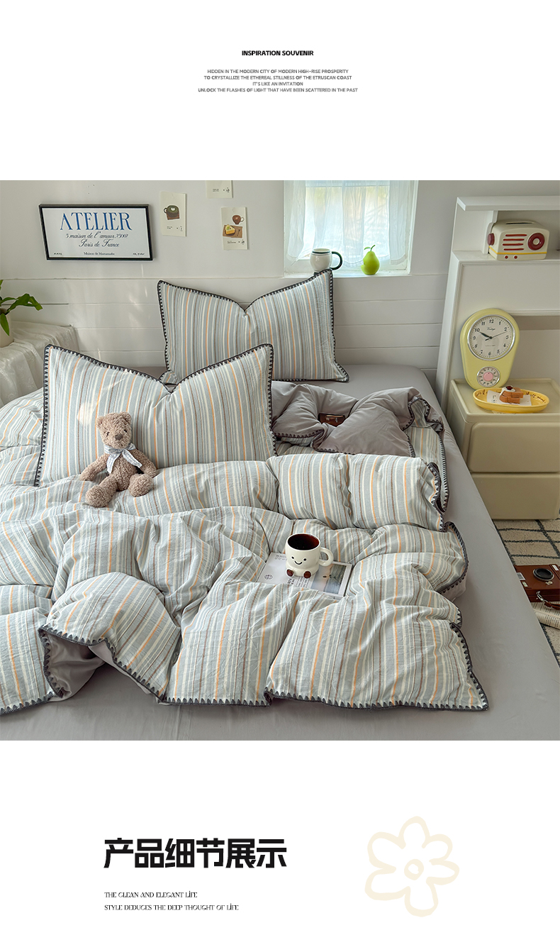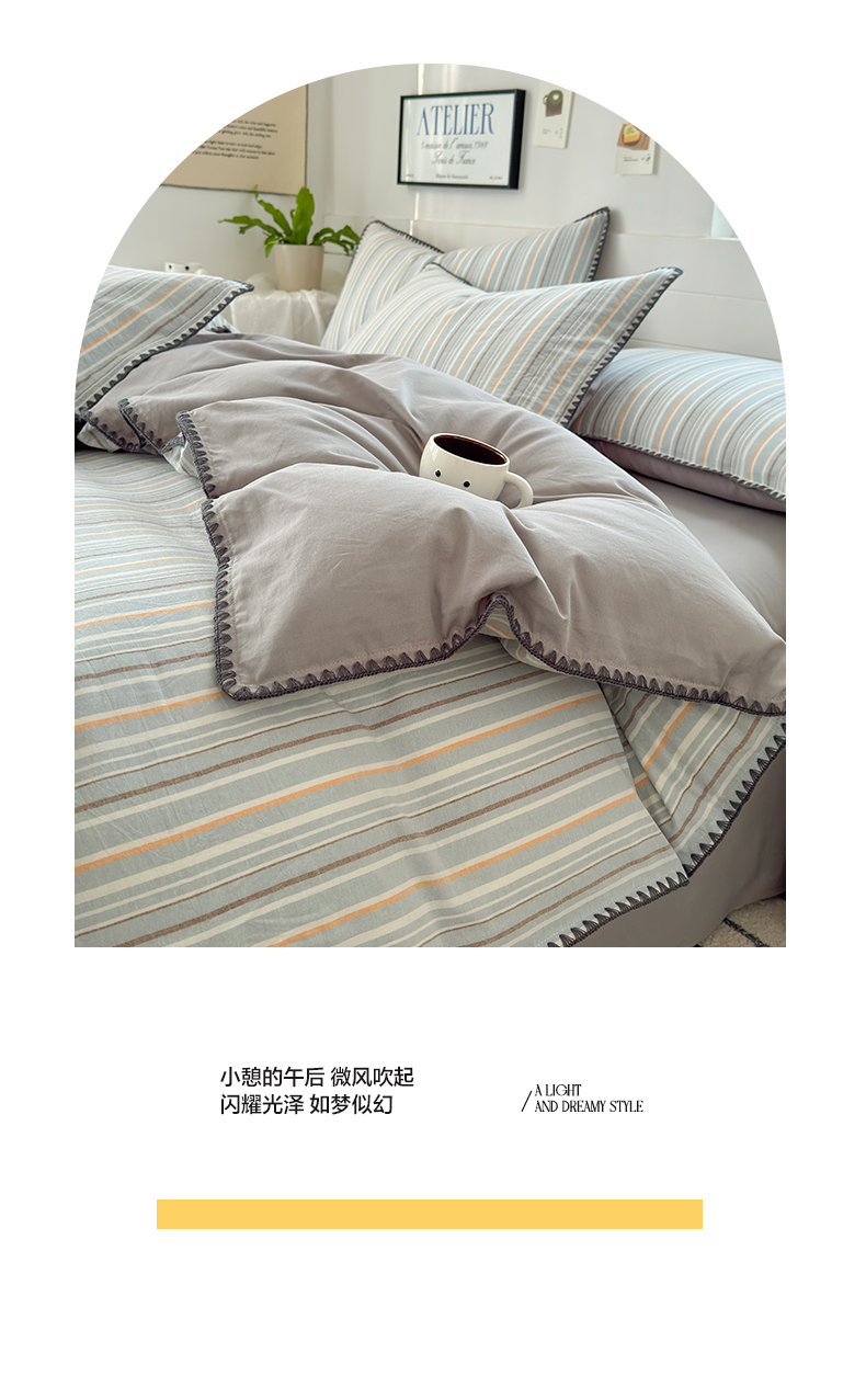 当前位置: 91家纺网 > 商品网购 > 床品套件 > 四件套 > 水洗棉四件套 > 2025新款A类全棉色织水洗棉贝壳绣条纹系列四件套 静谧浅灰