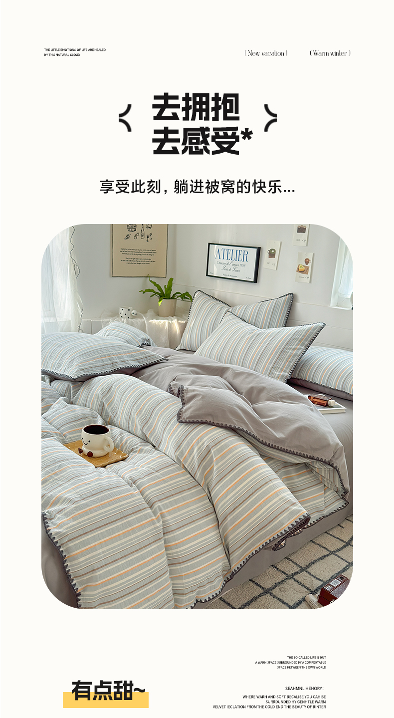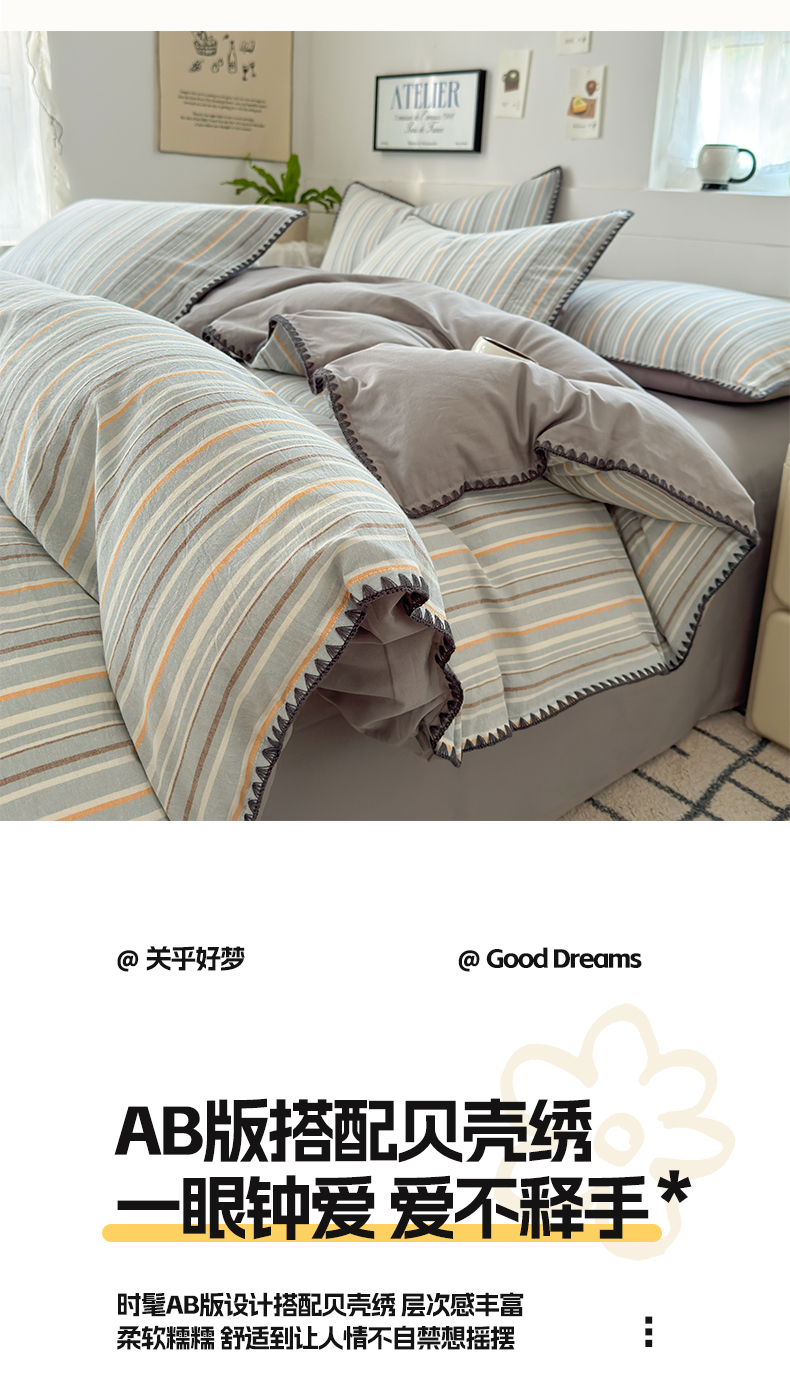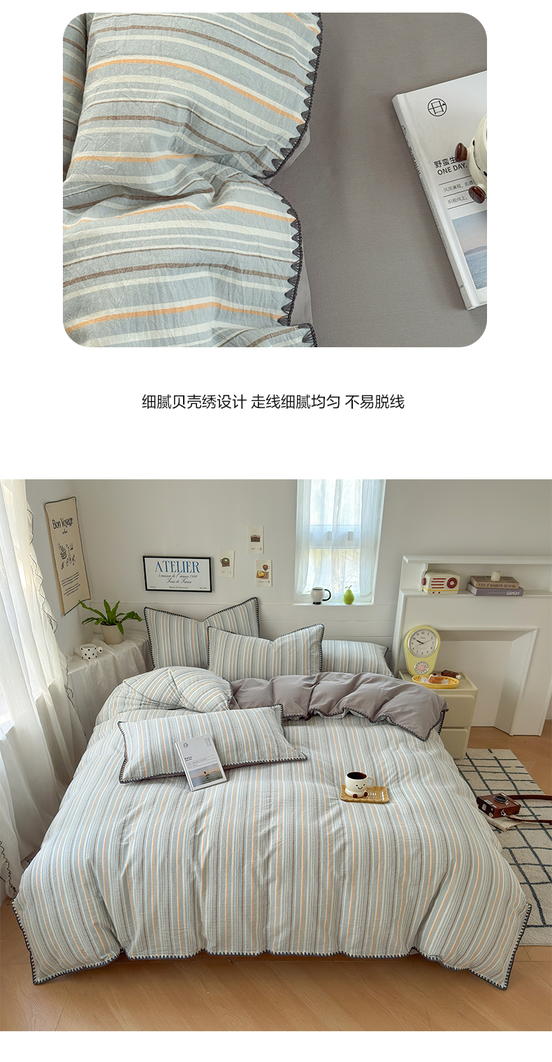 当前位置: 91家纺网 > 商品网购 > 床品套件 > 四件套 > 水洗棉四件套 > 2025新款A类全棉色织水洗棉贝壳绣条纹系列四件套 静谧浅灰