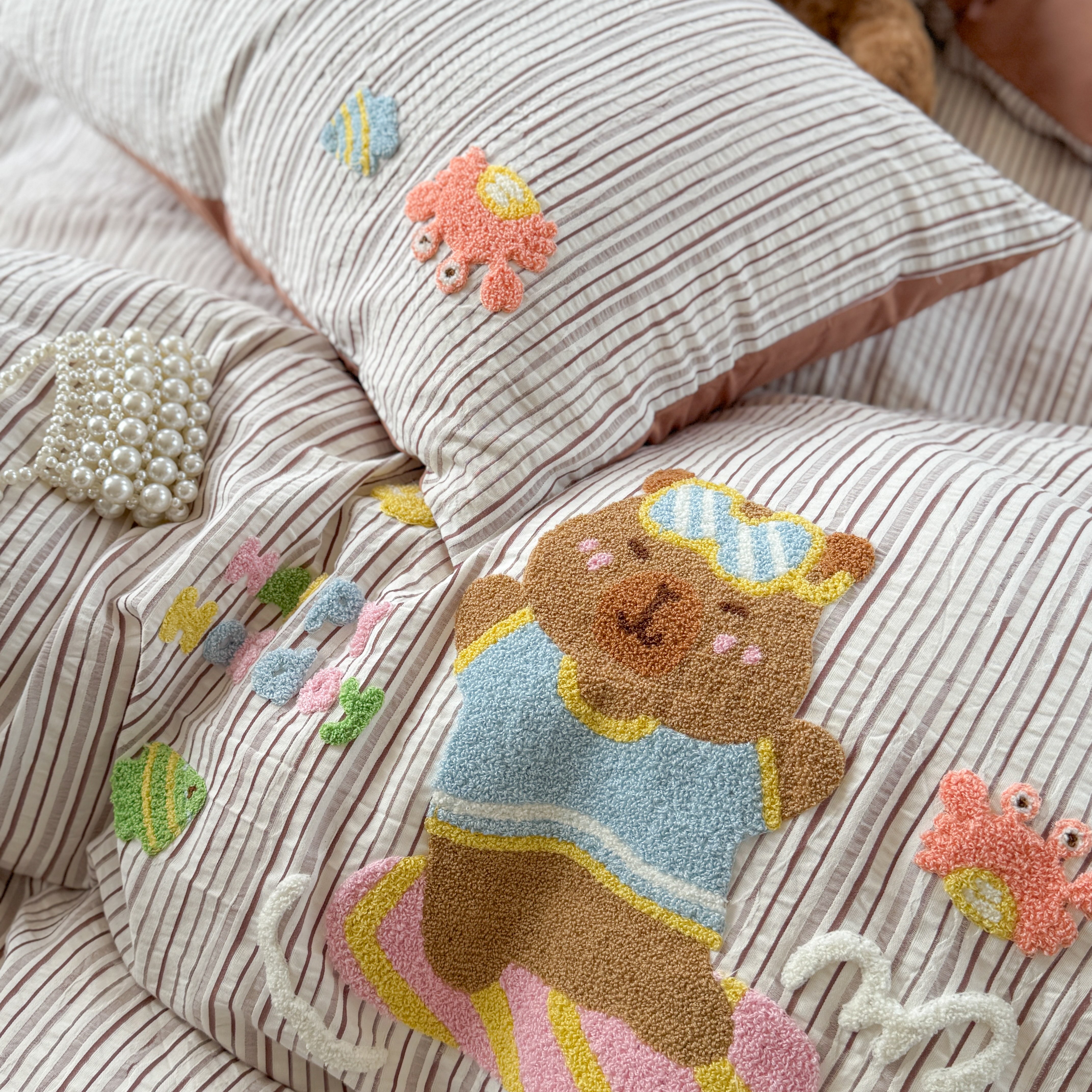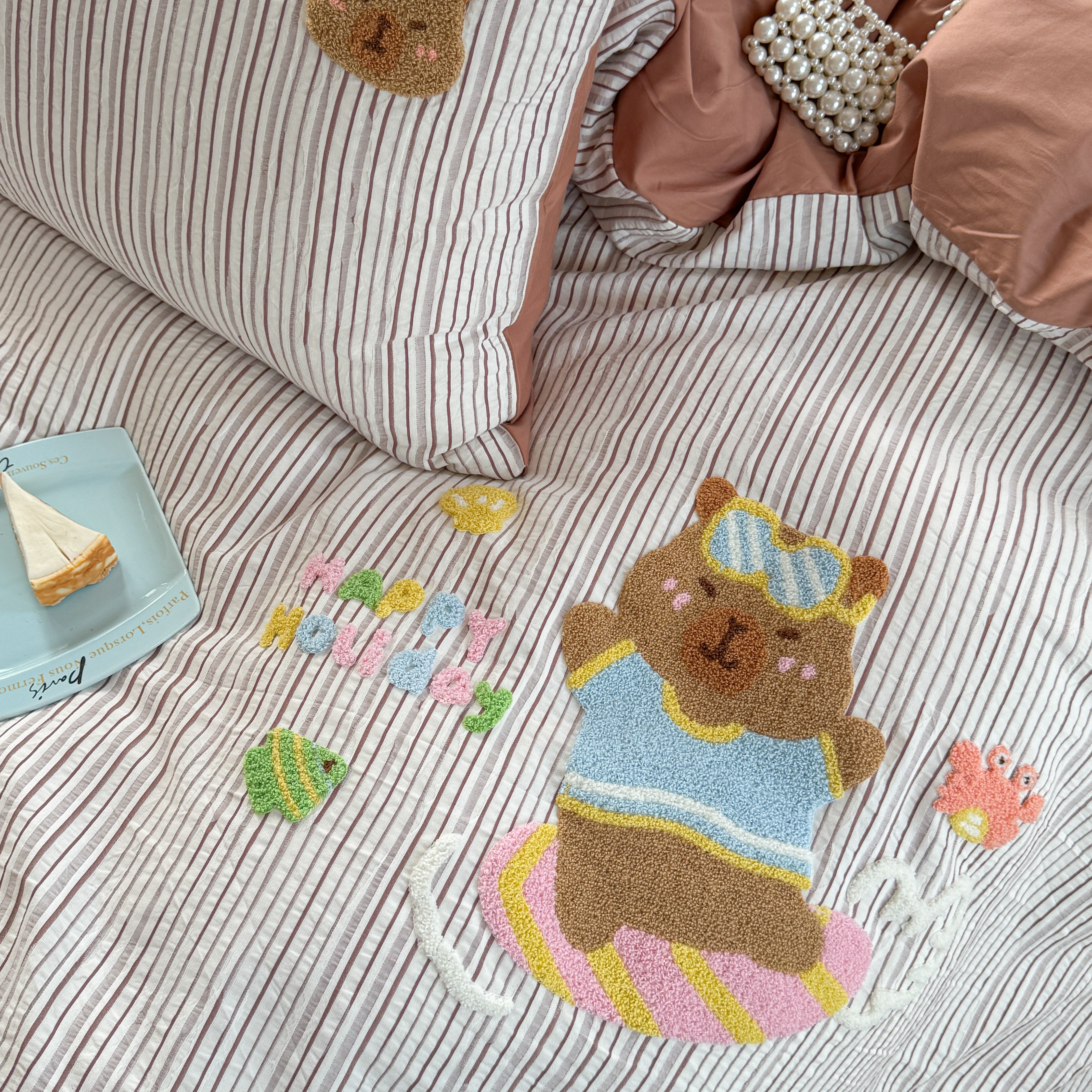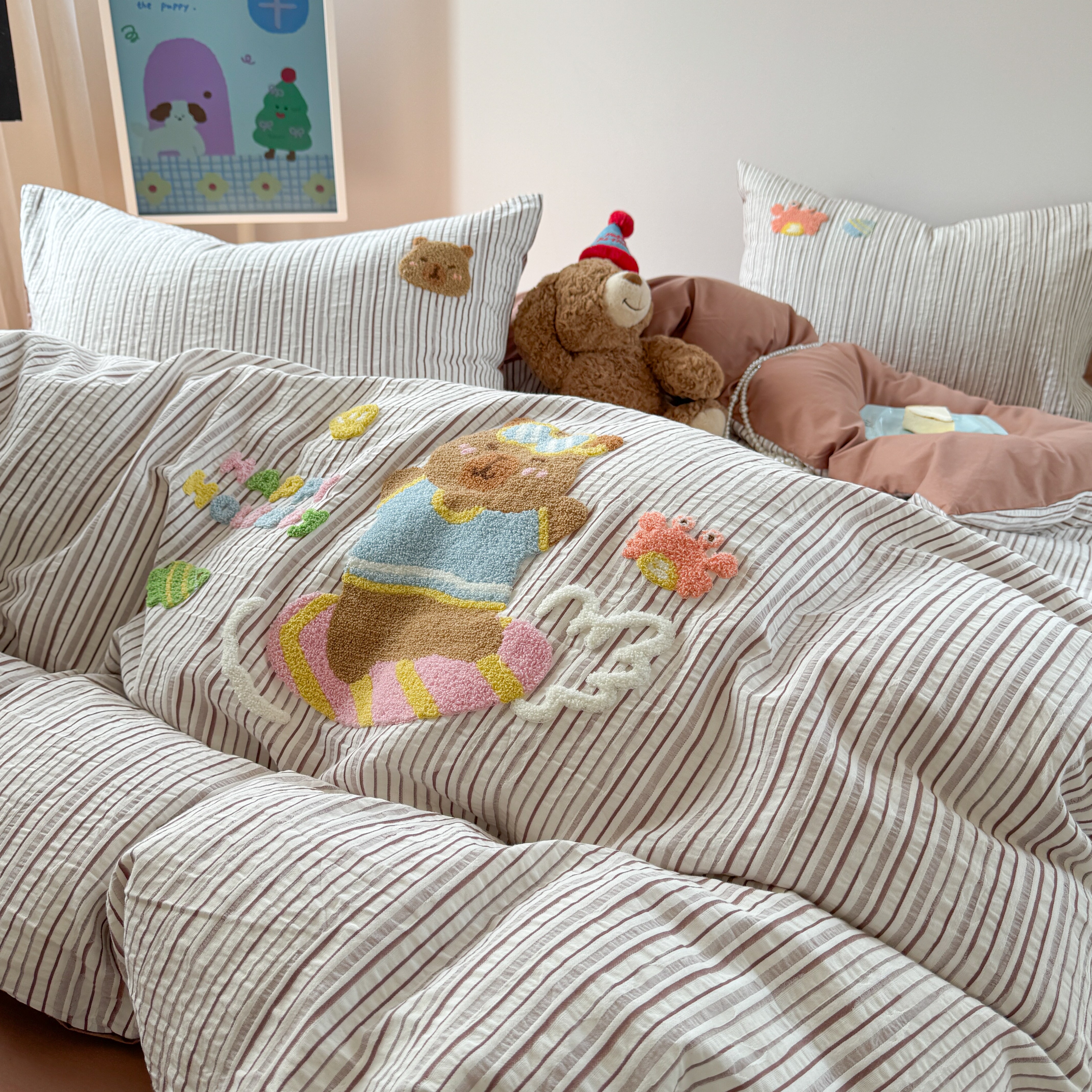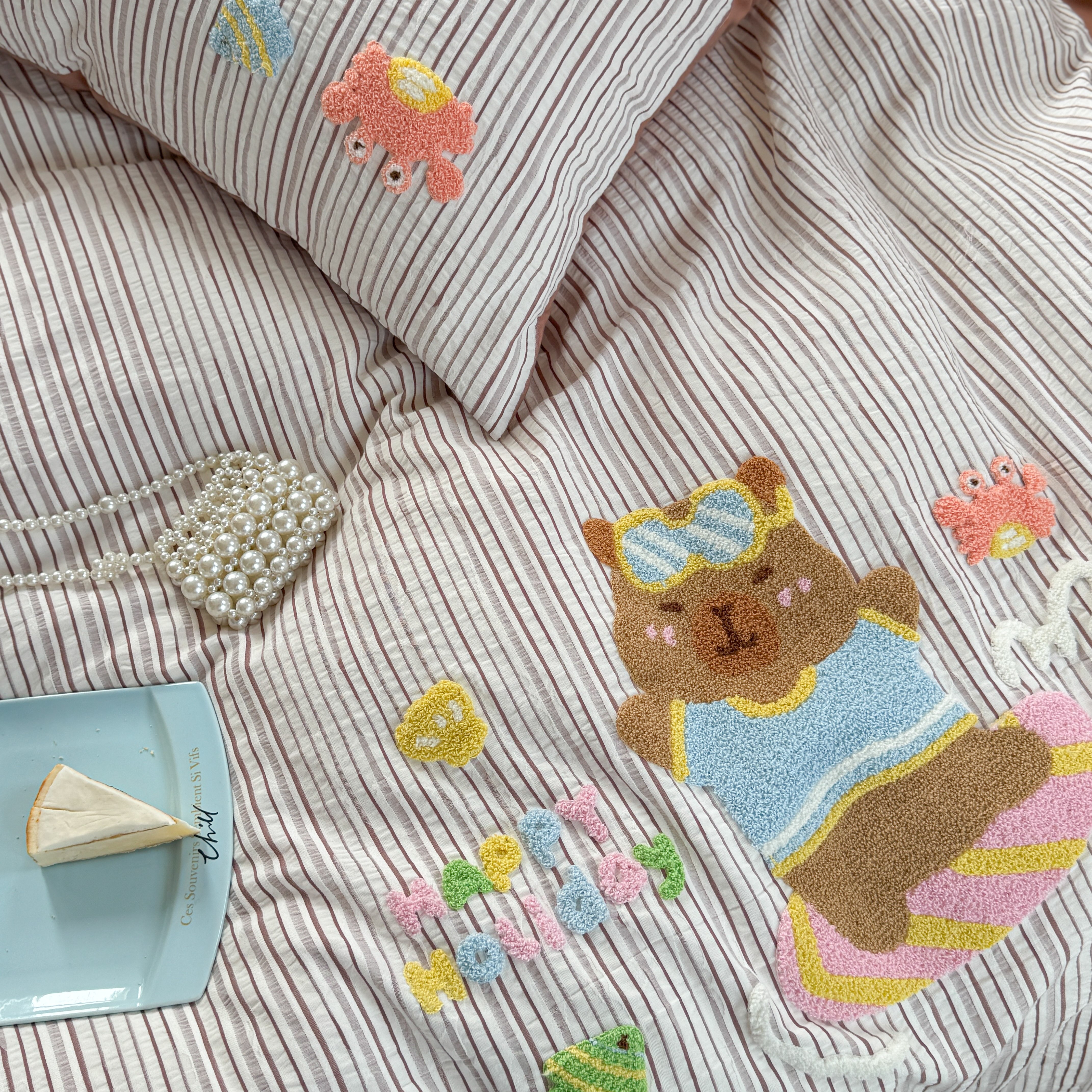 (总)柚子 2025春夏新款全棉纯棉双层纱毛巾绣四件套,河马,美蒂狗,麋鹿,苹果狗,水母,椰子卡皮巴拉
