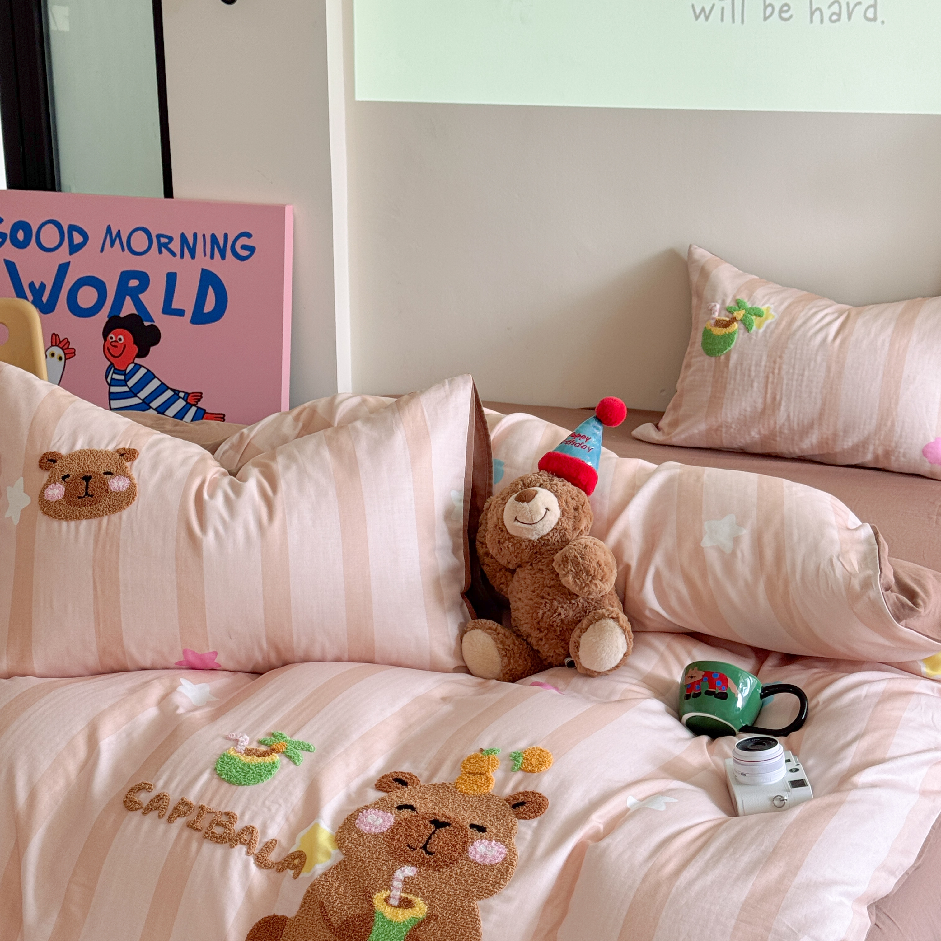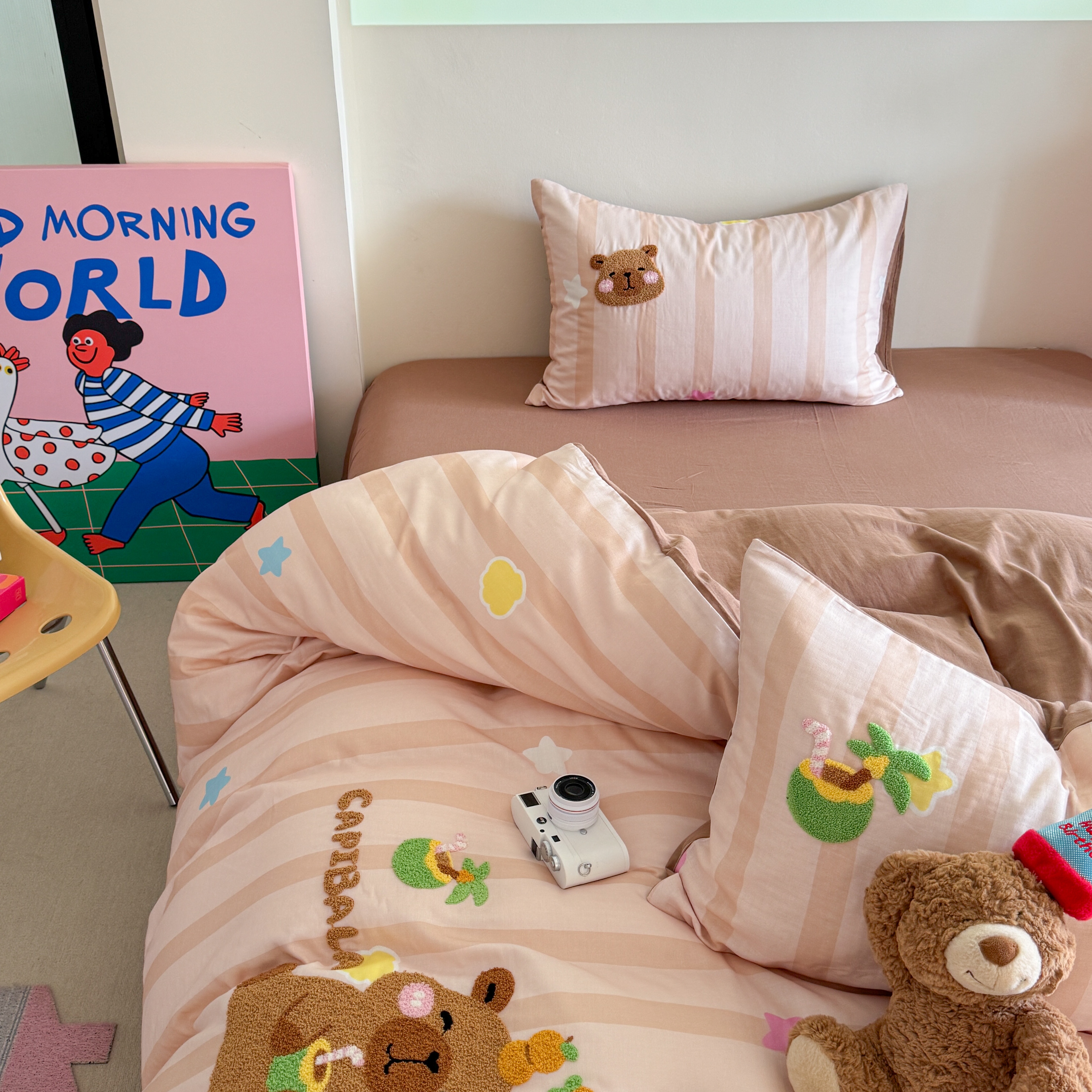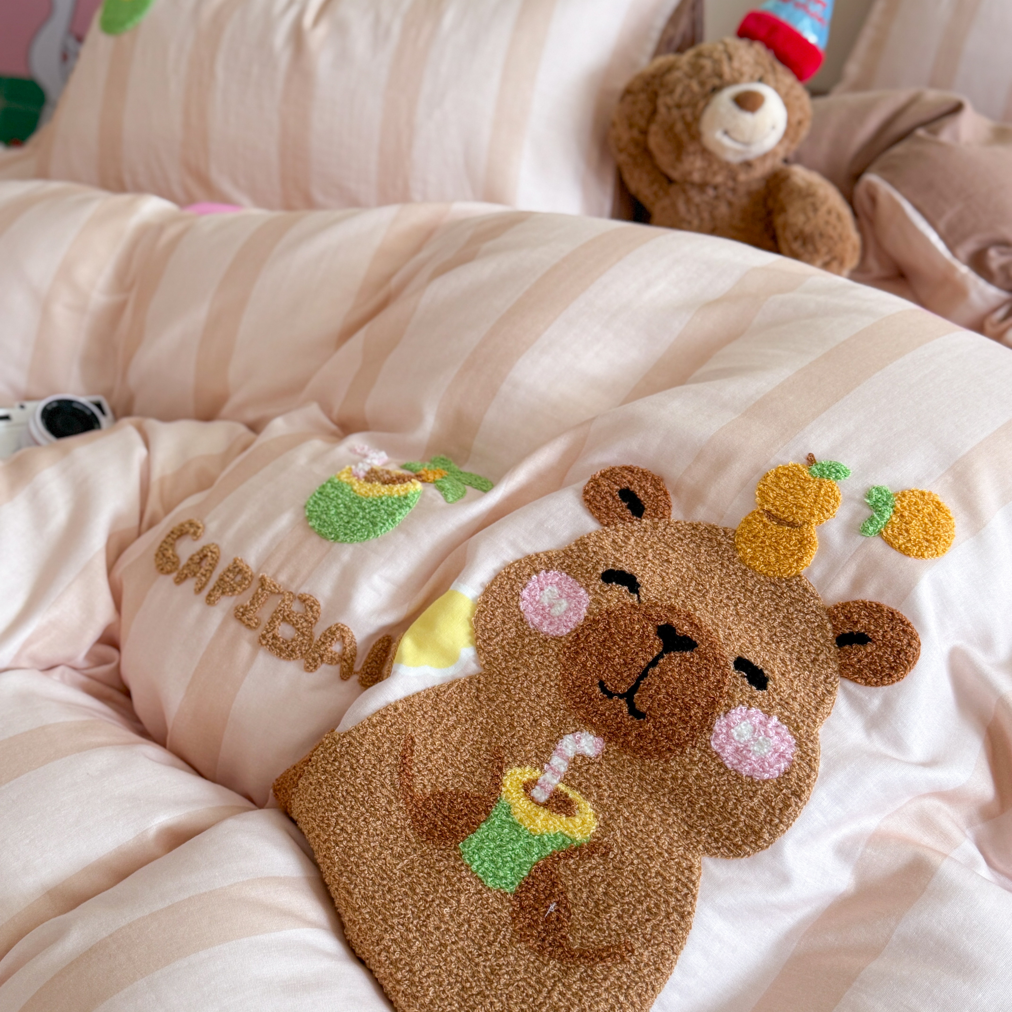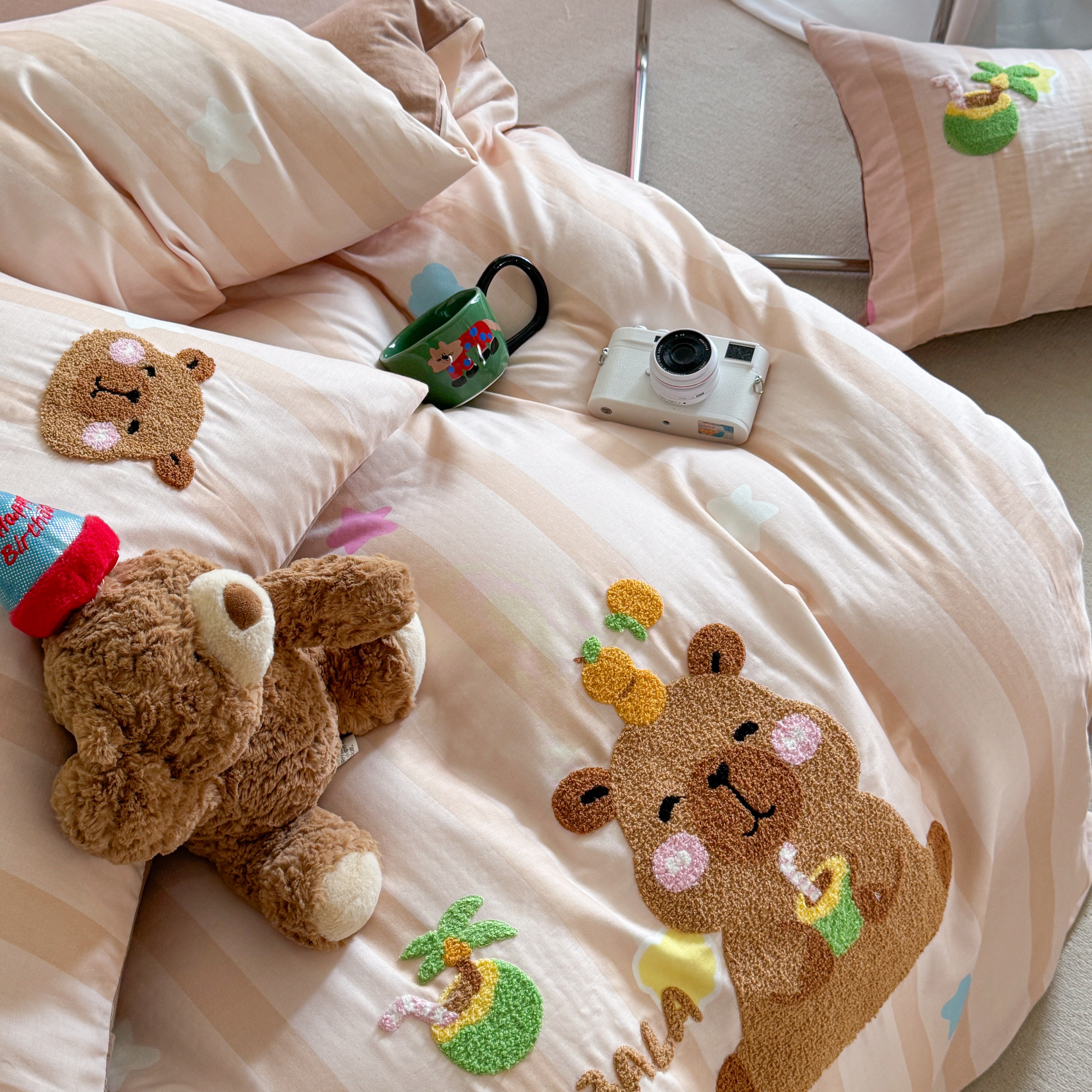 柚子 2025春夏新款全棉纯棉双层纱毛巾绣四件套 椰子卡皮巴拉