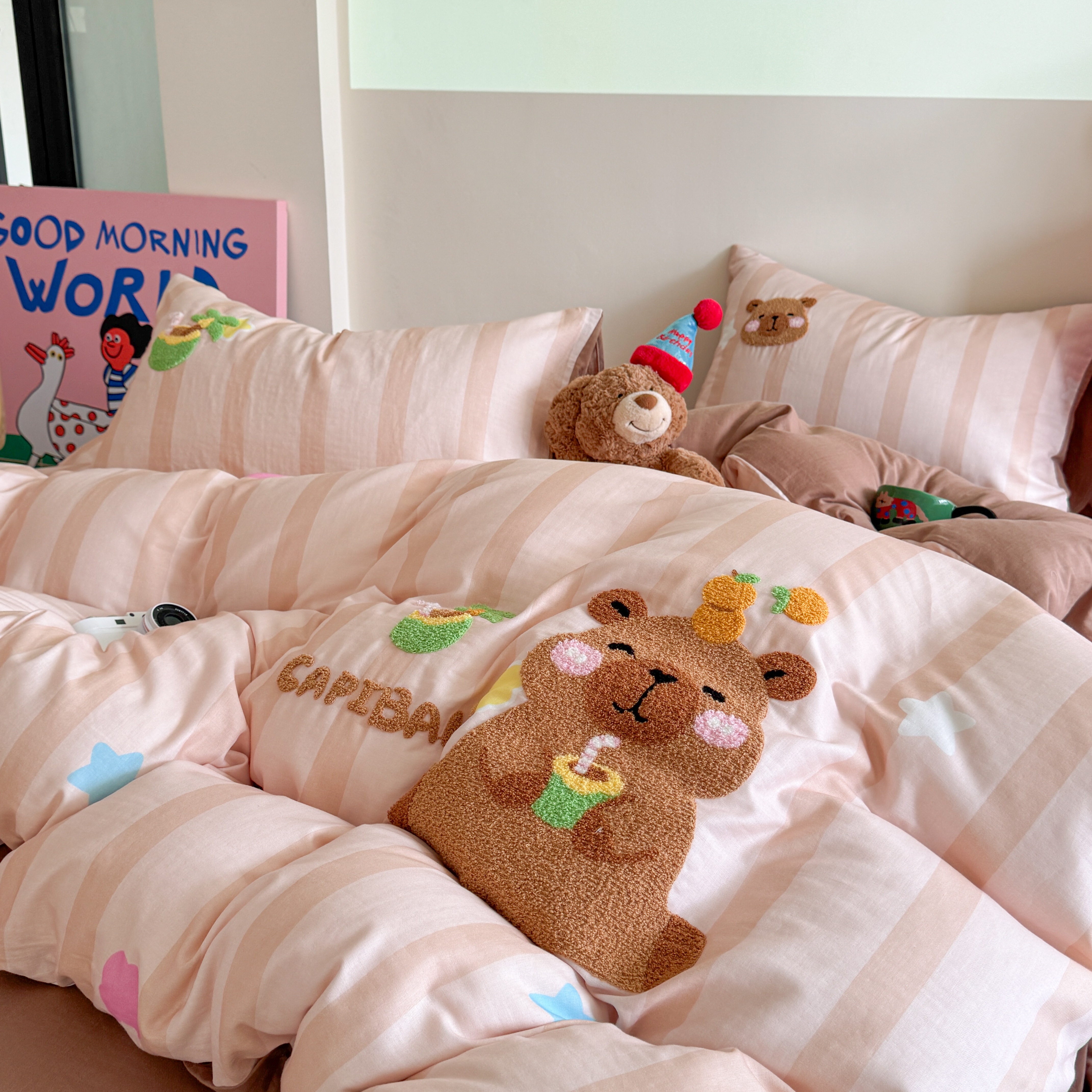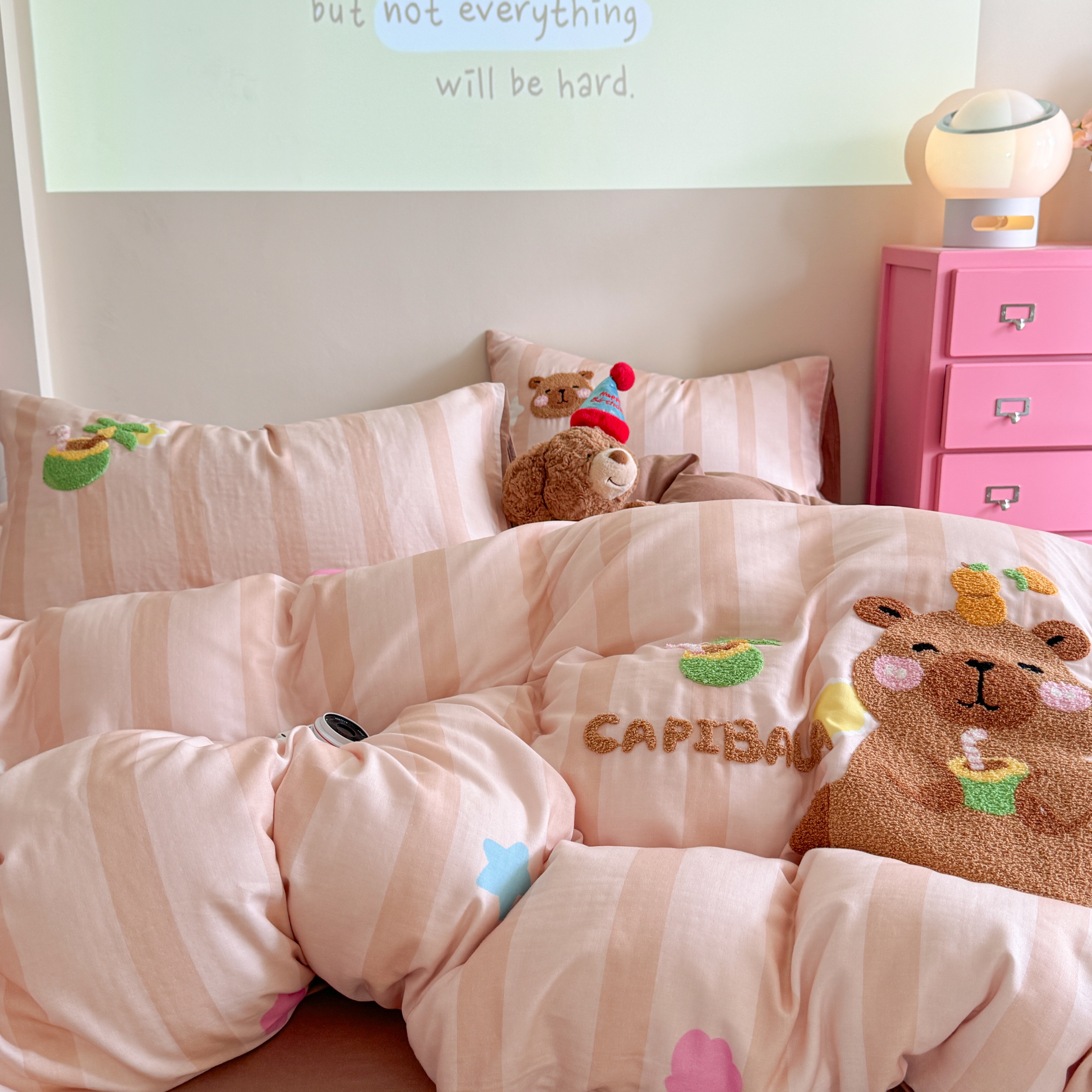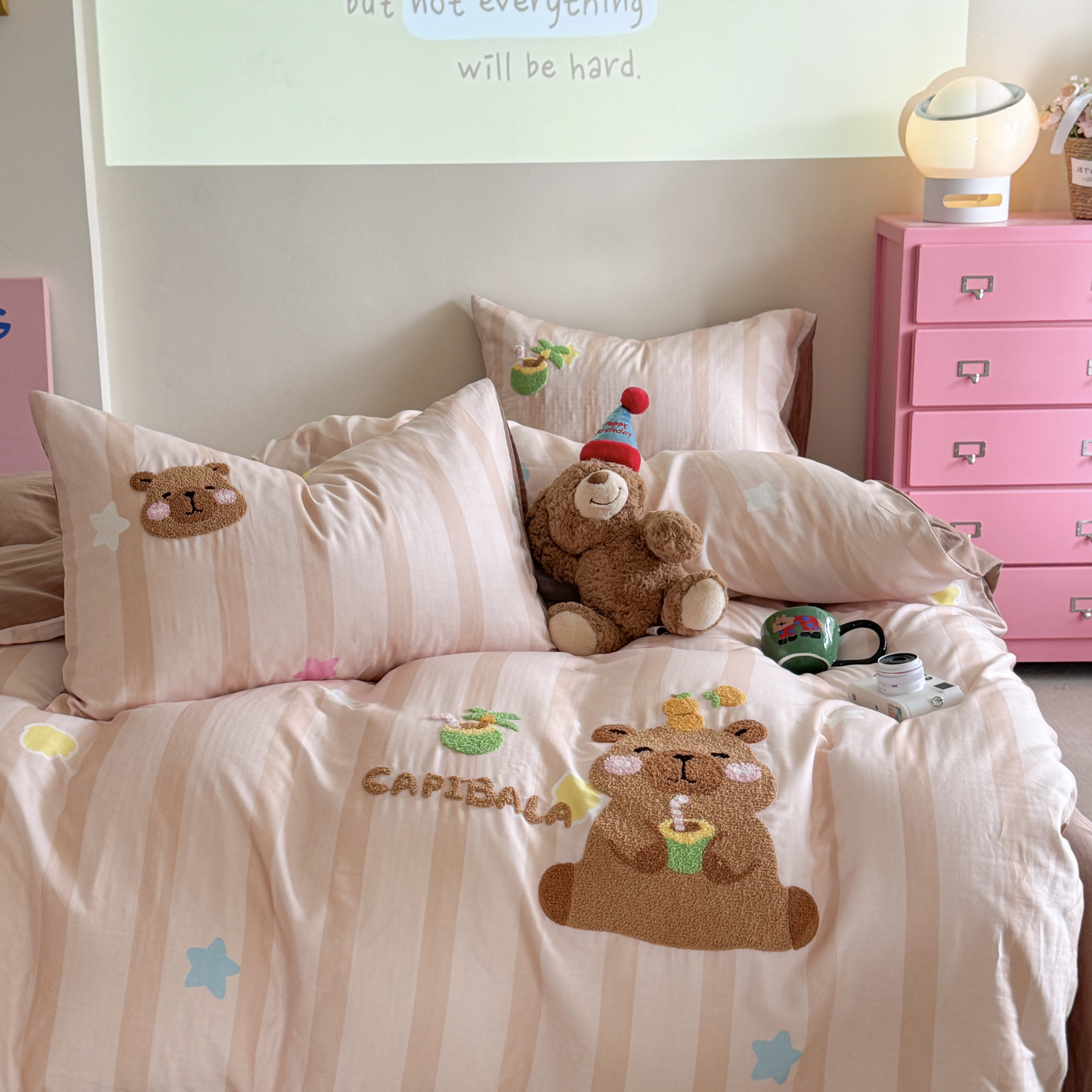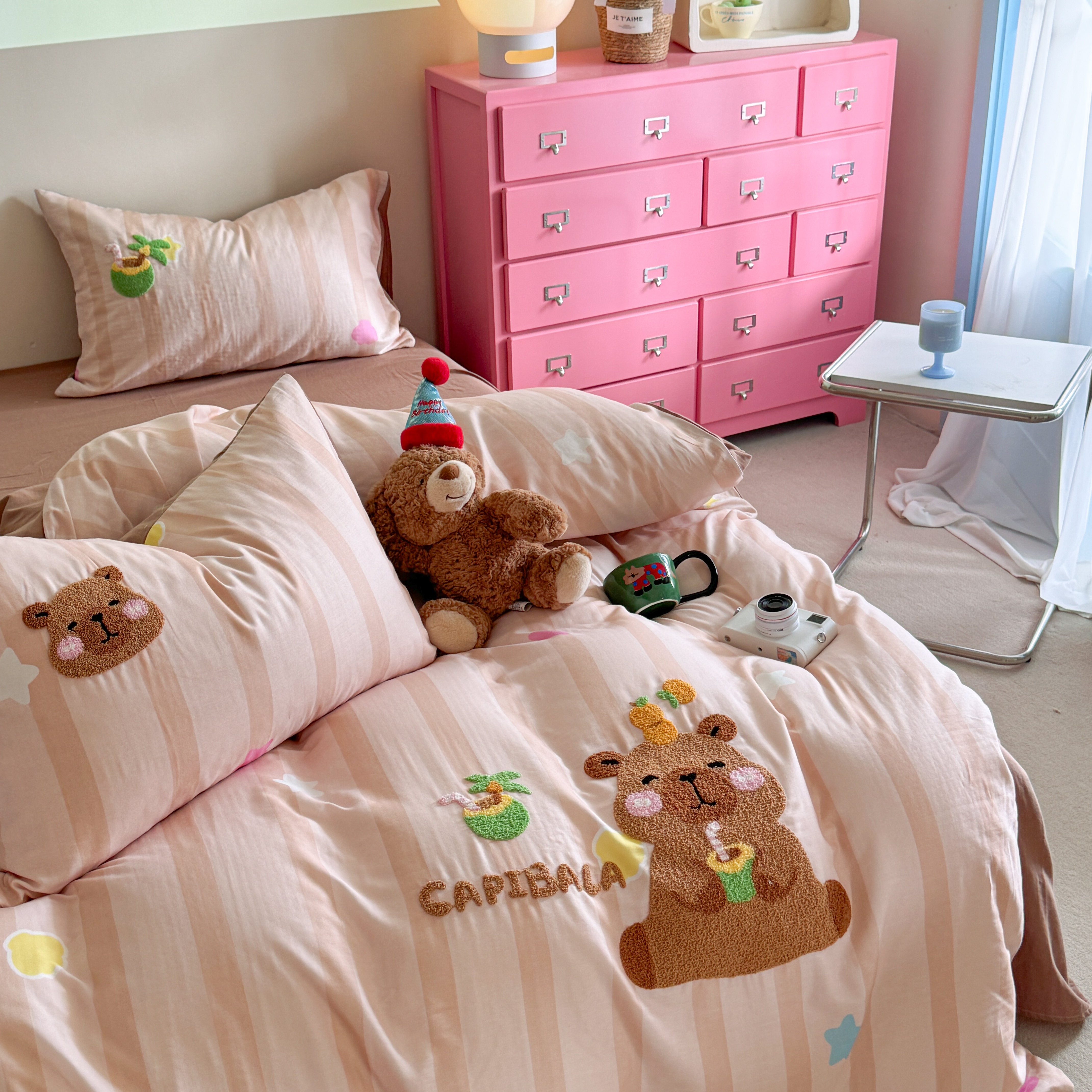 柚子 2025春夏新款全棉纯棉双层纱毛巾绣四件套 椰子卡皮巴拉