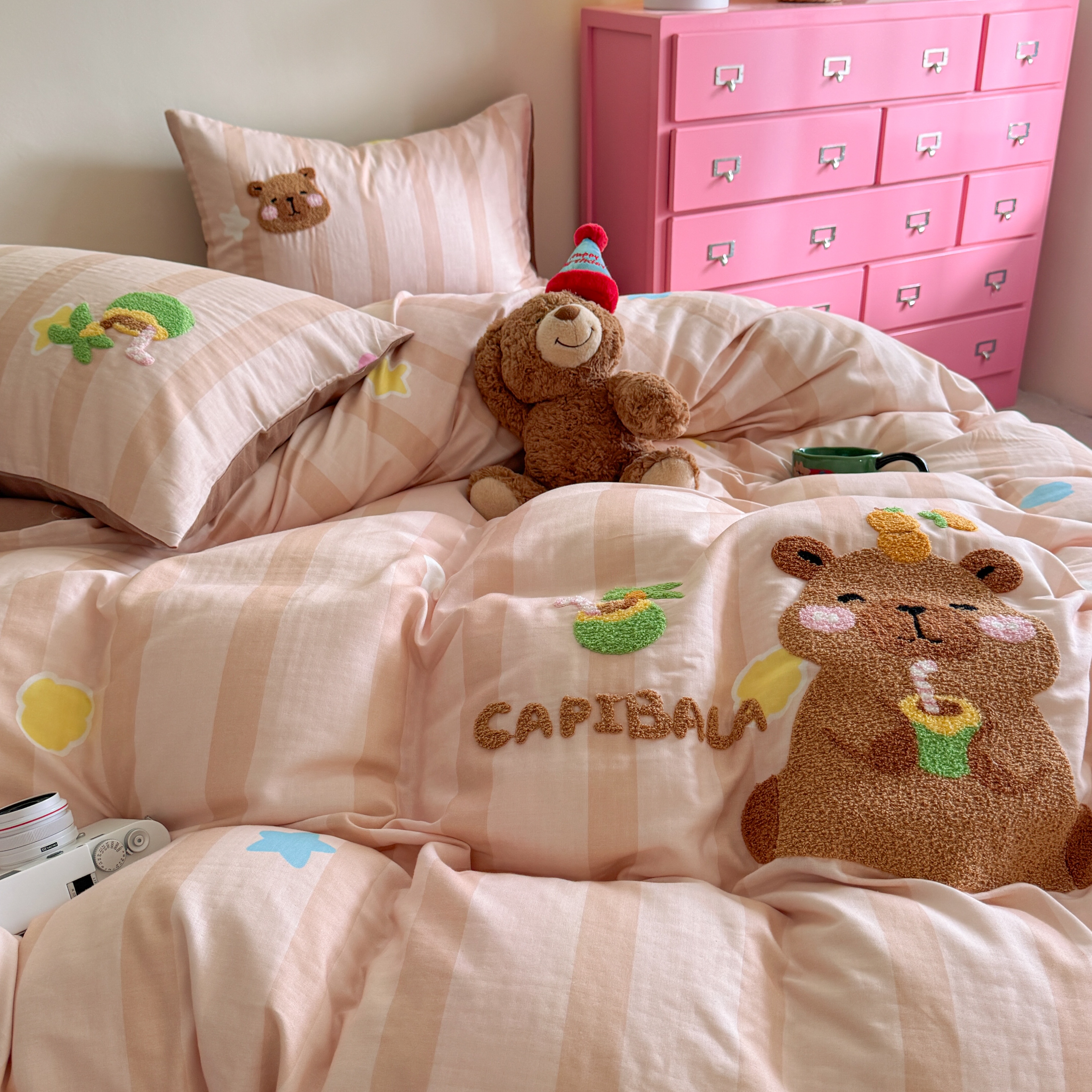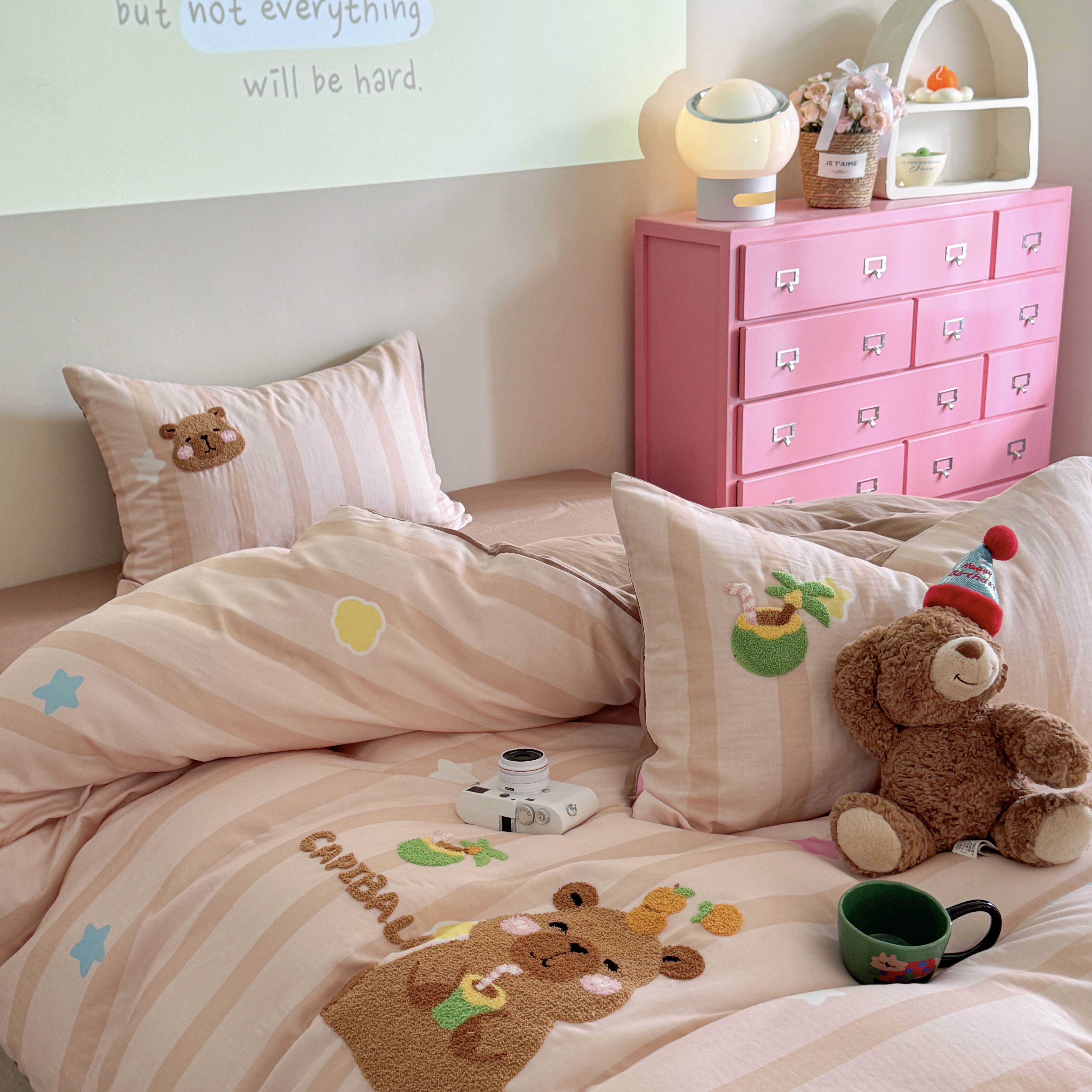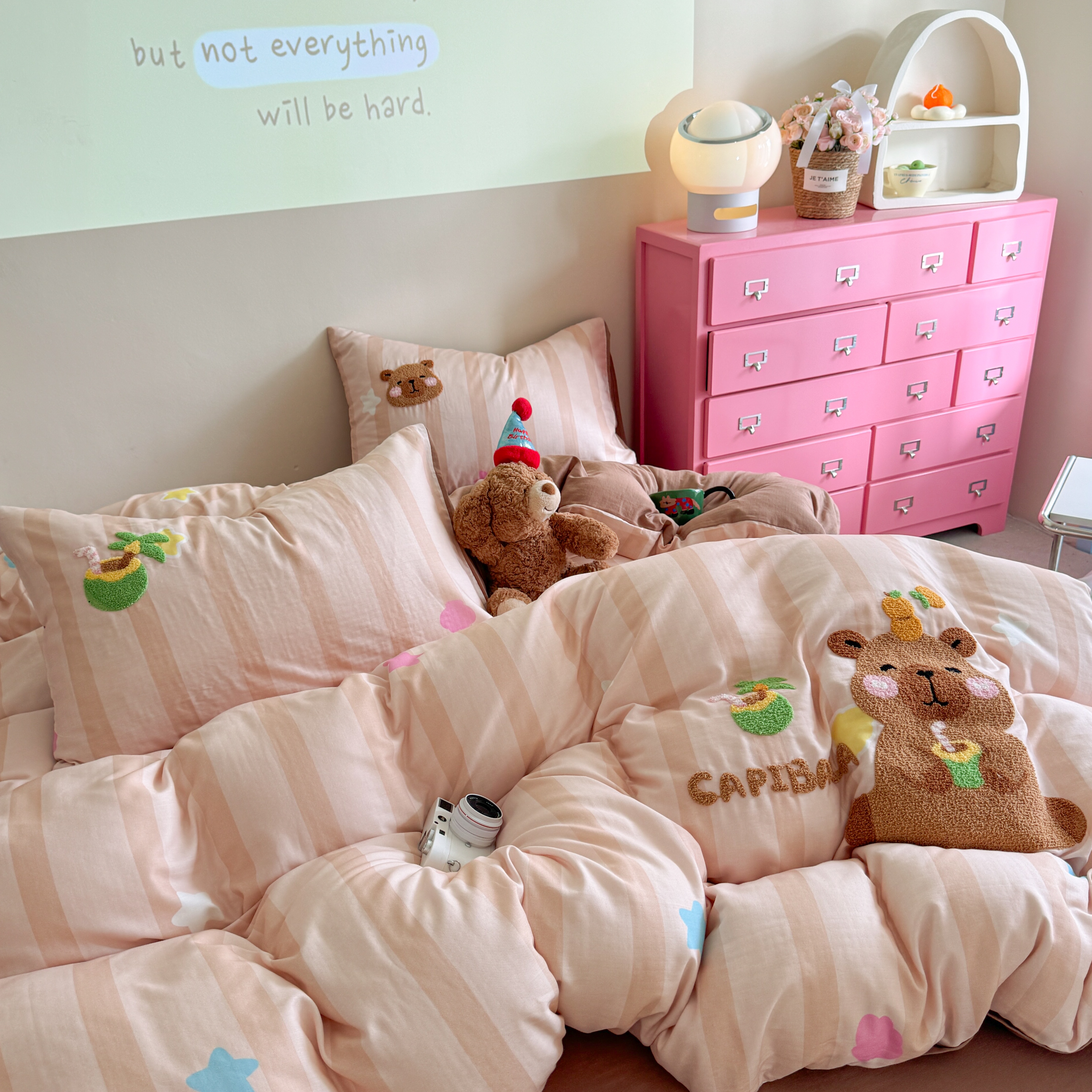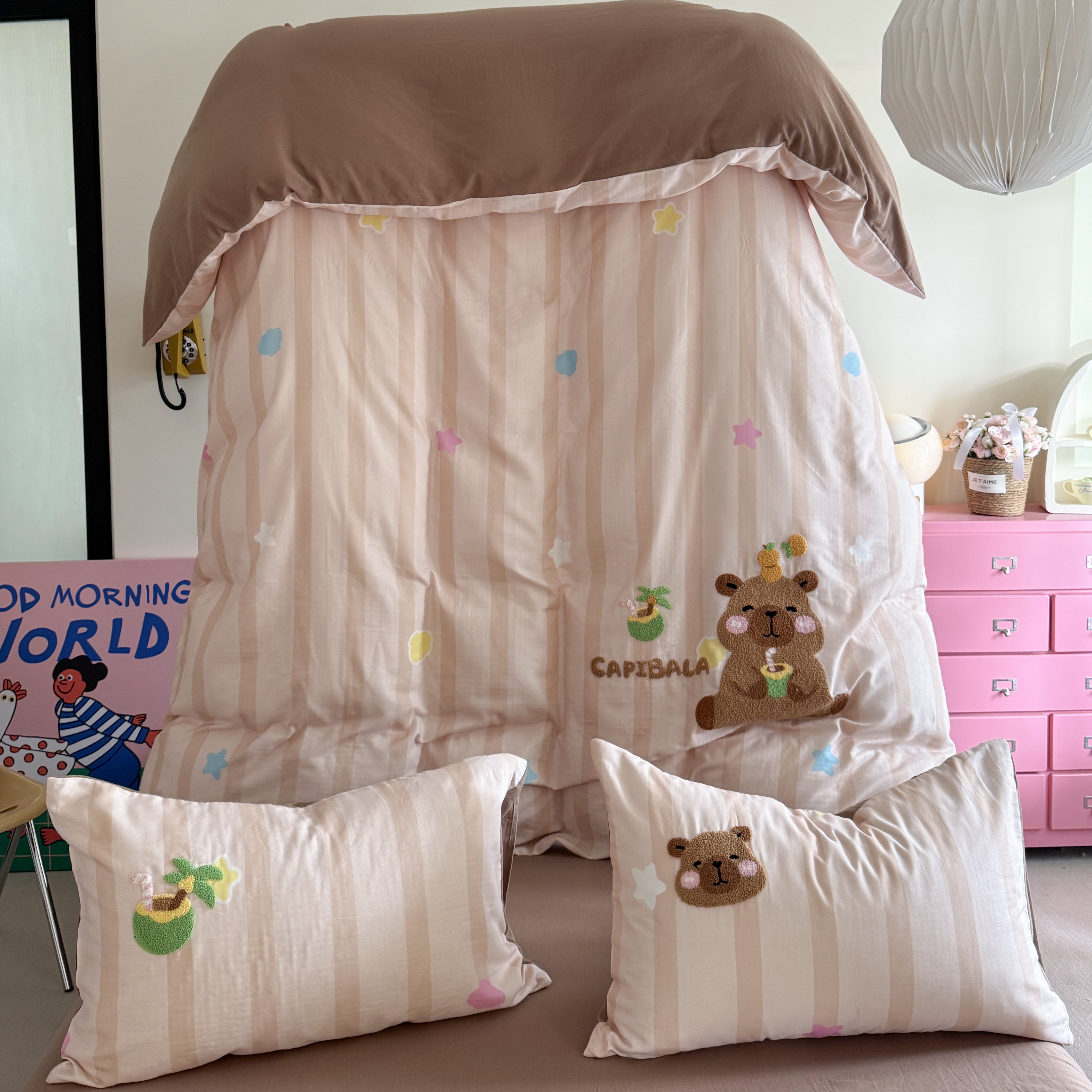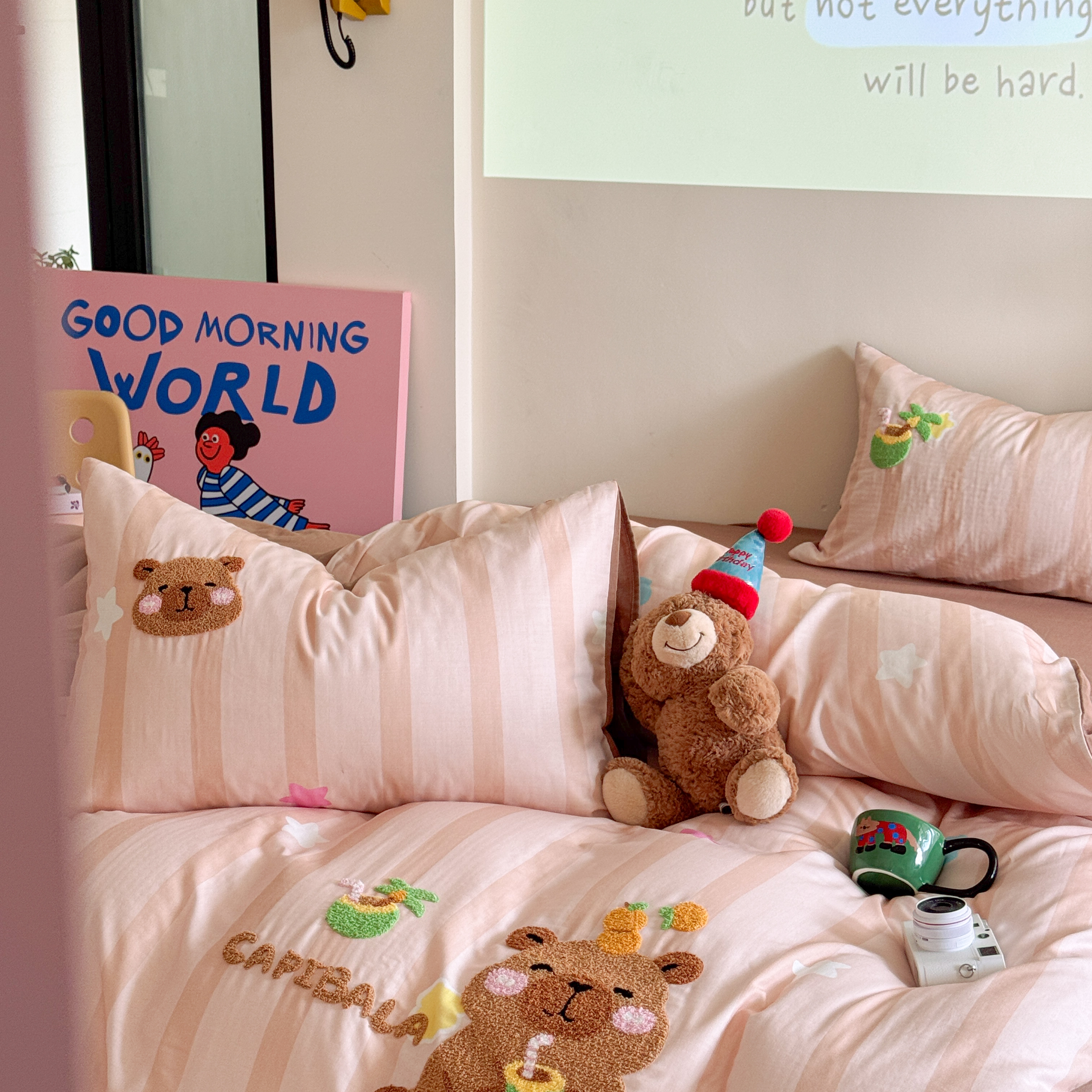 柚子 2025春夏新款全棉纯棉双层纱毛巾绣四件套 椰子卡皮巴拉