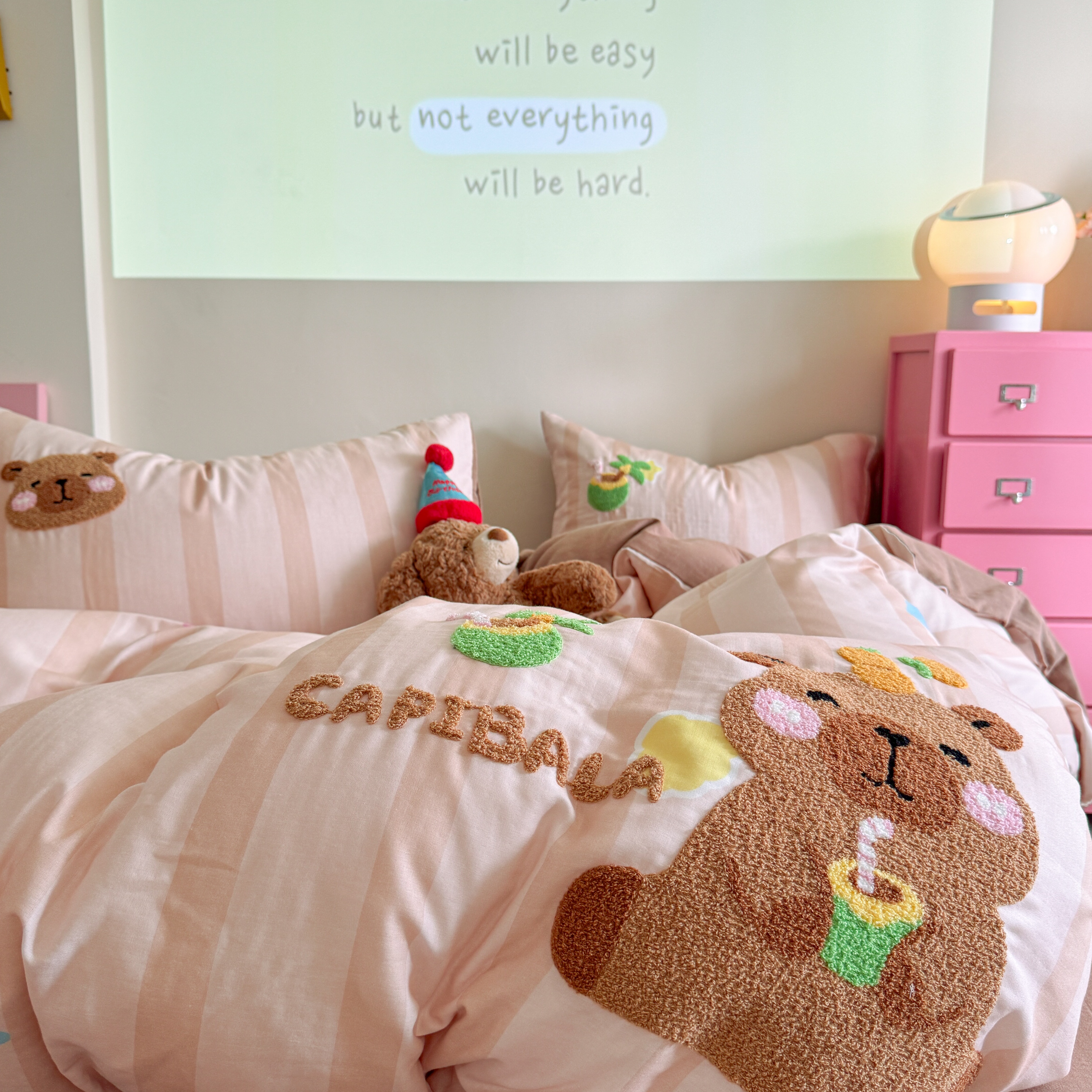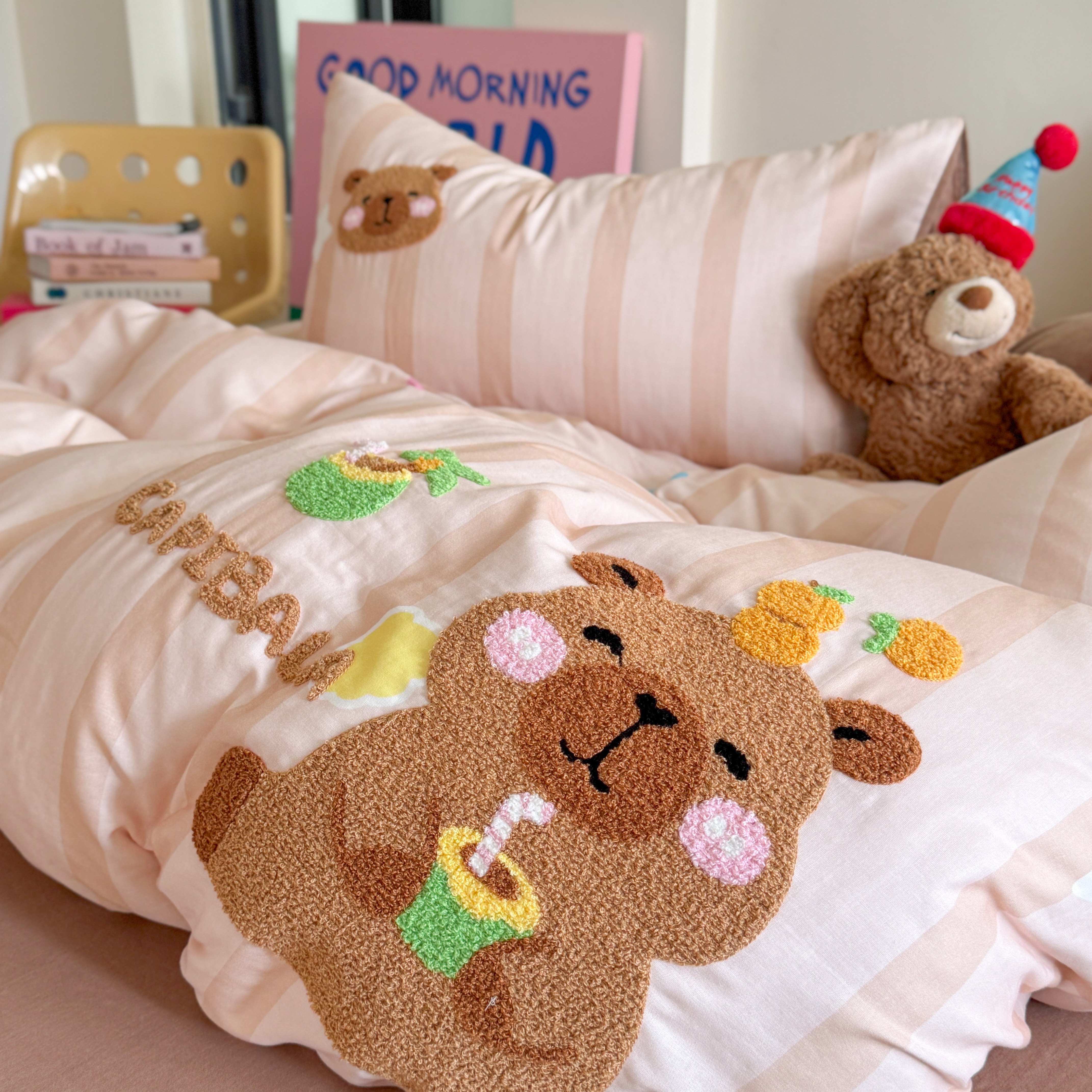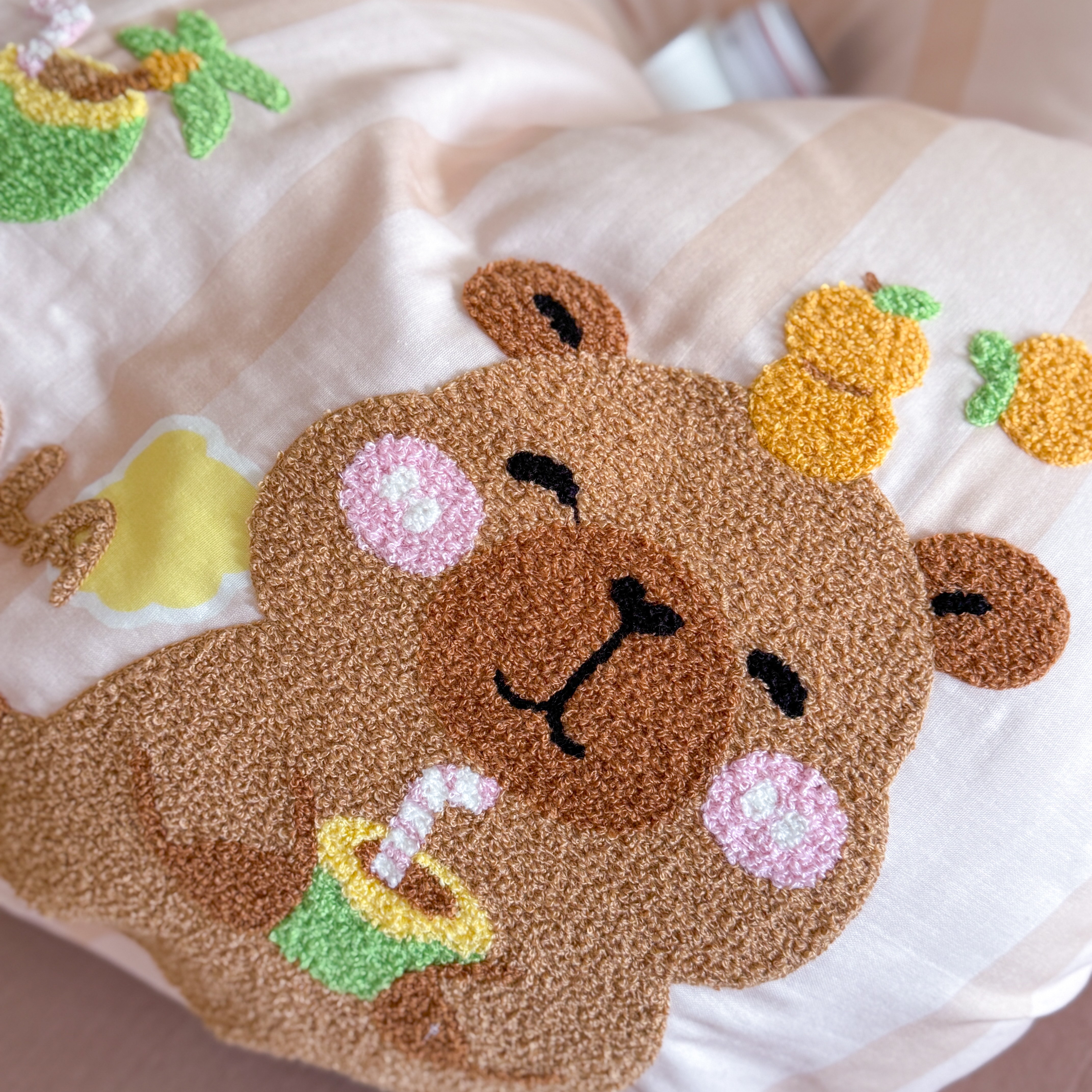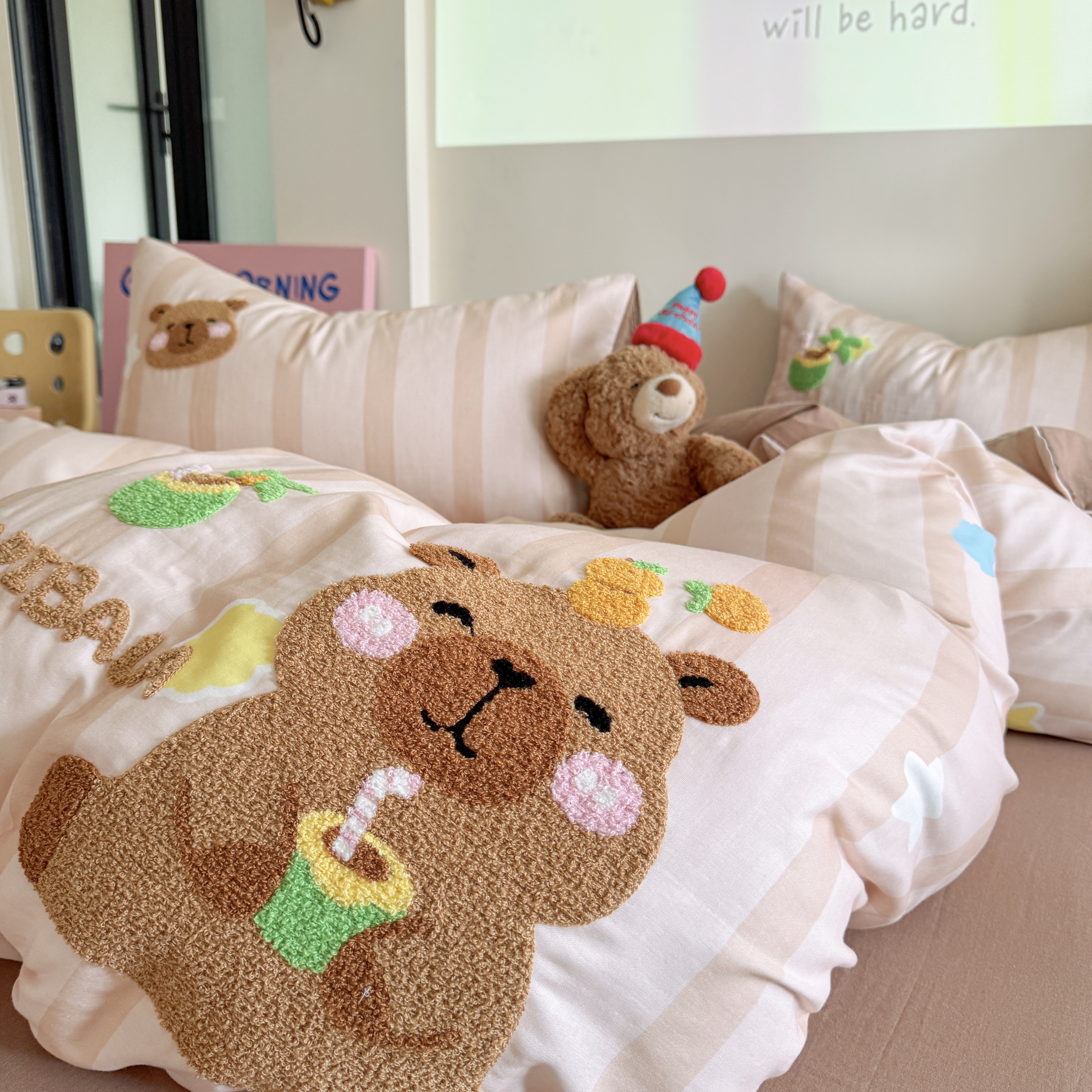 柚子 2025春夏新款全棉纯棉双层纱毛巾绣四件套 椰子卡皮巴拉
