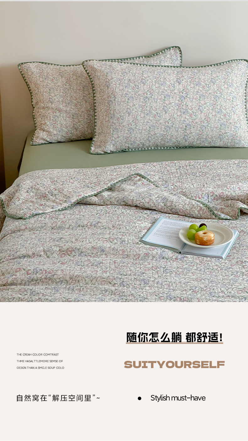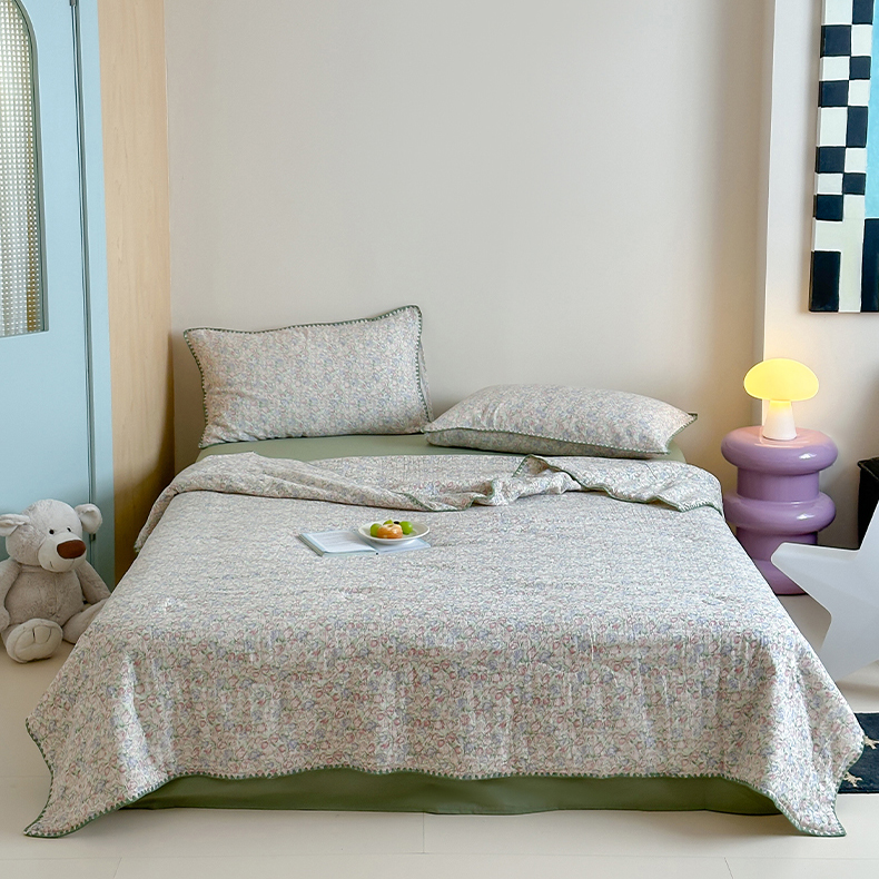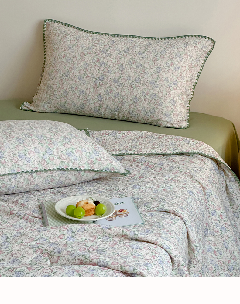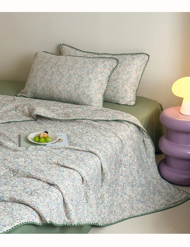 • 91家纺网 家纺一手货源 找家纺 三朵家纺 2025春夏新款全棉纯棉双层绉绉纱三角针夏被夏凉被空调被 午后花园