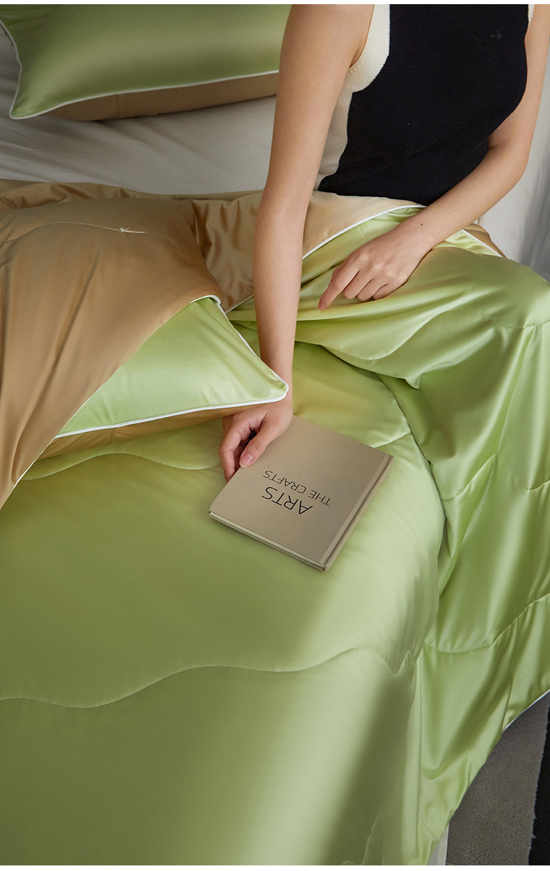 商品名称:头等舱 2025新款水光缎冰肌锦氨A类55植物大豆7A抗菌夏被配包装模特图 水光绿配香槟咖