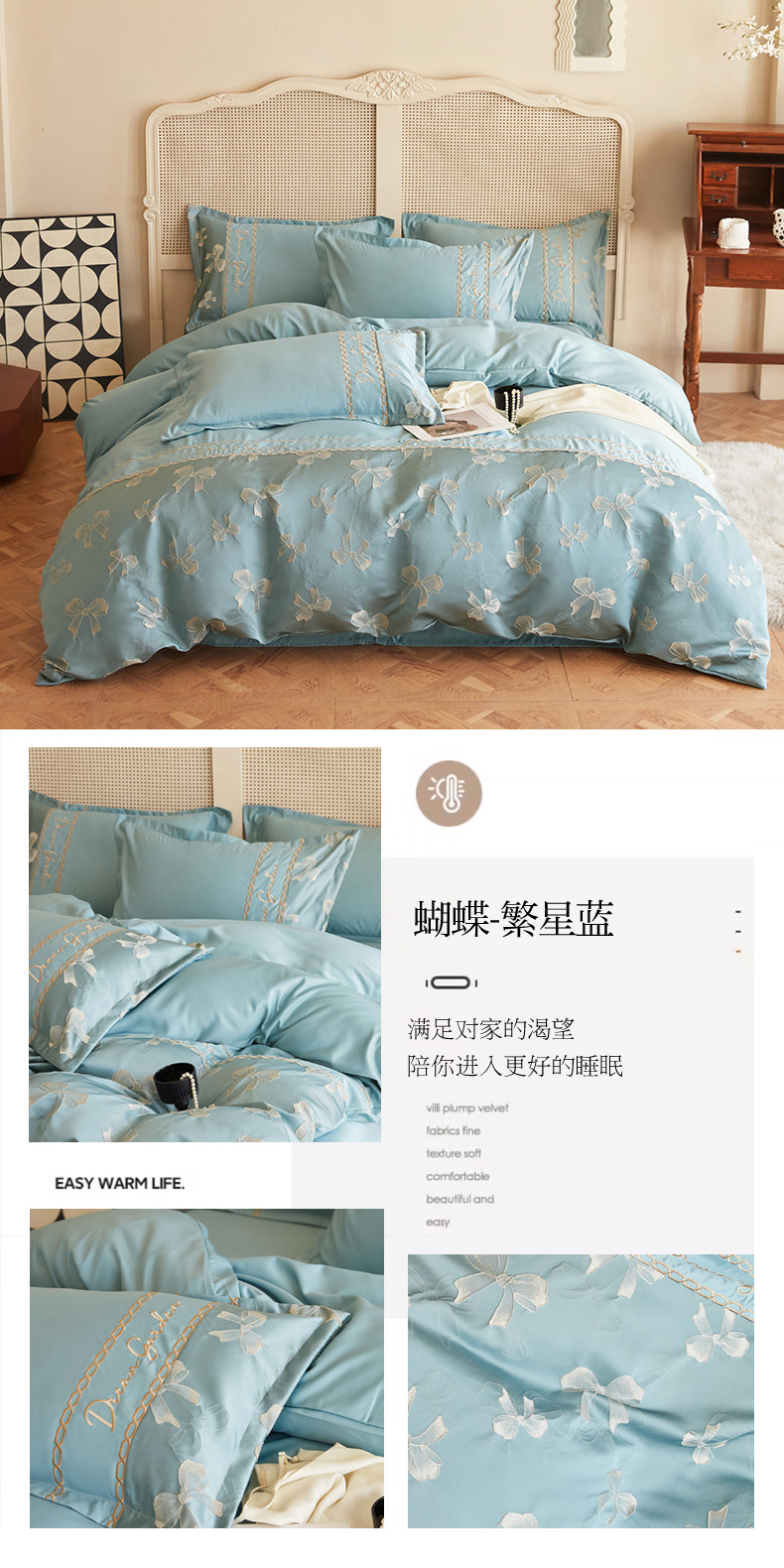 商品名称:菲儿2025新款冰丝浮雕提花绣花四件套 蝴蝶-繁星蓝