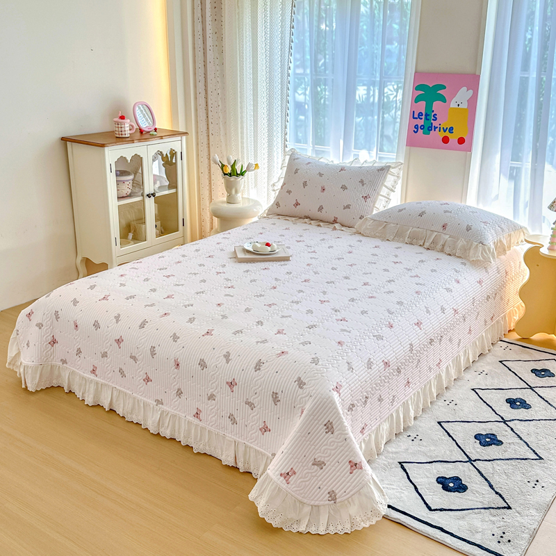 (总)岚吉家纺 2025新款全棉绗缝棉花床盖花边款三件套四件套,缤纷樱桃,草莓格子,花边兔,黄苏条,蓝美人,落落晨光,萌萌狮,蘑菇狗,秋日玫瑰,兔菲菲,向晚,小黑点点(米),游花间