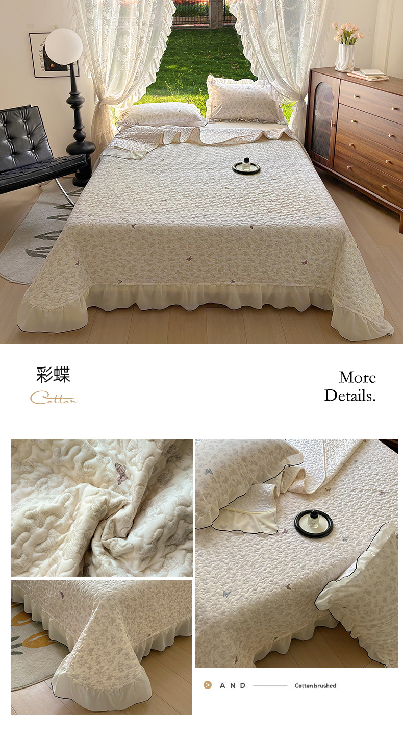 • 91家纺网 家纺一手货源 找家纺 韩秀家纺 2025新款韩版花边双层纱水洗棉夹棉床盖针织棉泡泡棉床盖三件套蕾丝花边枕套 彩蝶