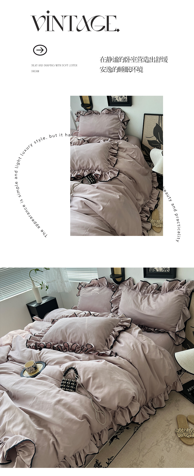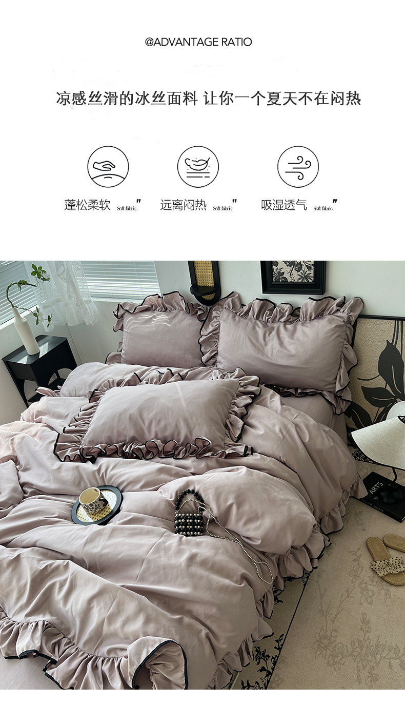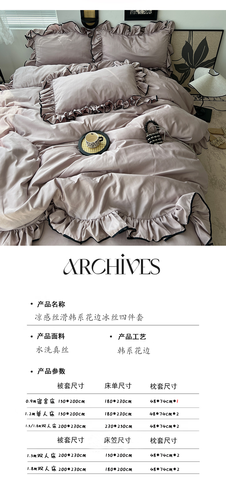 商品名称:原素 2025夏季冰丝韩系大花边水洗真丝四件套 沐言-香槟紫