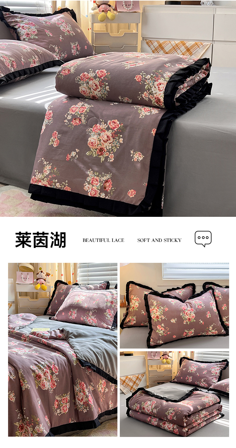 • 91家纺网 家纺一手货源 找家纺 曼璐家纺 2025新款赫本风黑色花边单夏被韩版荷叶边夏被四件套 莱茵湖