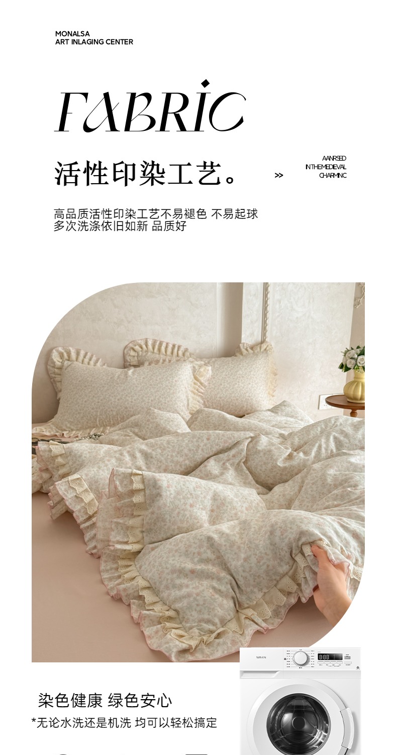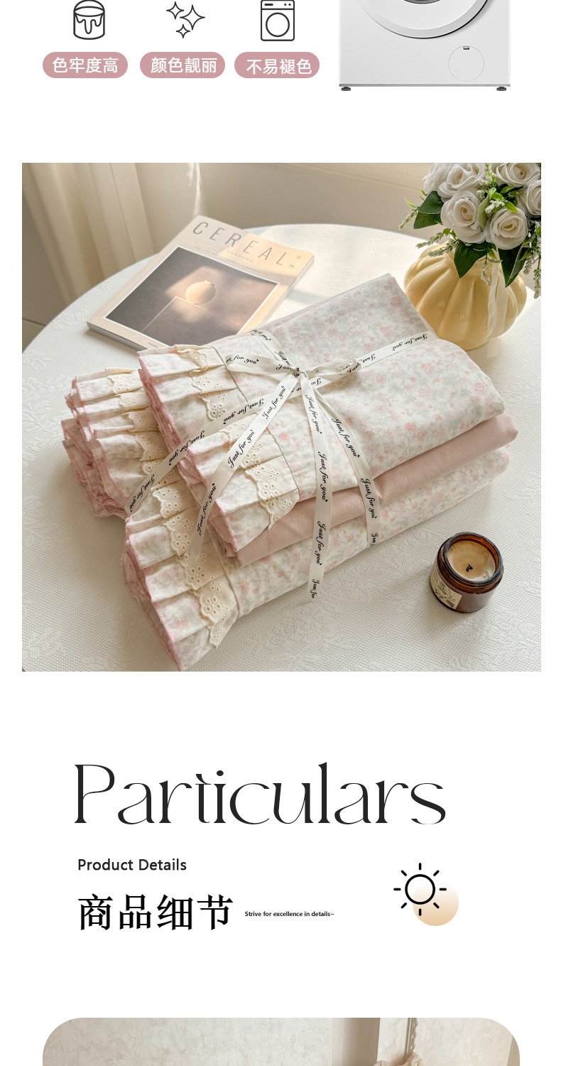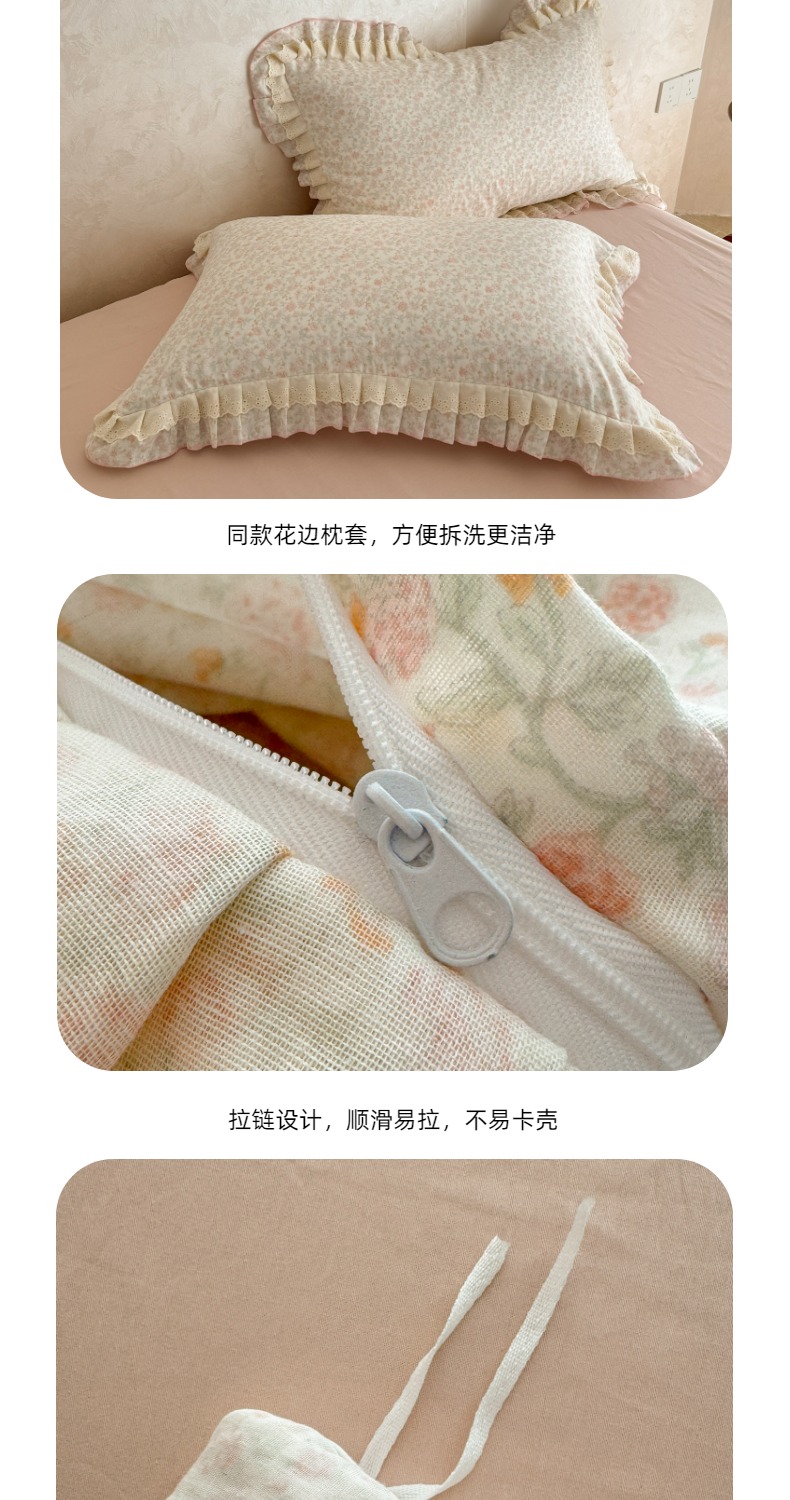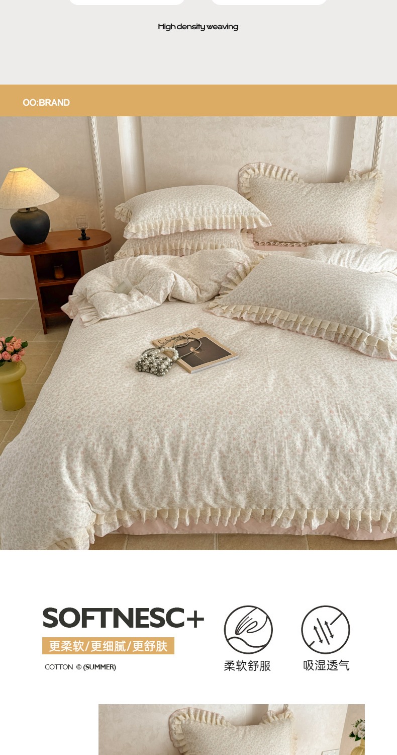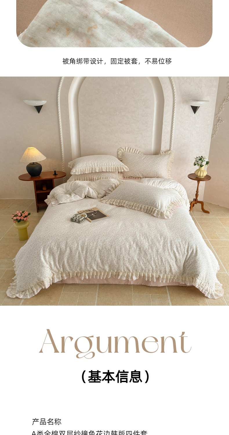 商品名称:简宜家居(朝初家纺) 2025新款40s全棉纯棉双层纱撞色蕾丝花边四件套 琼花粉絮