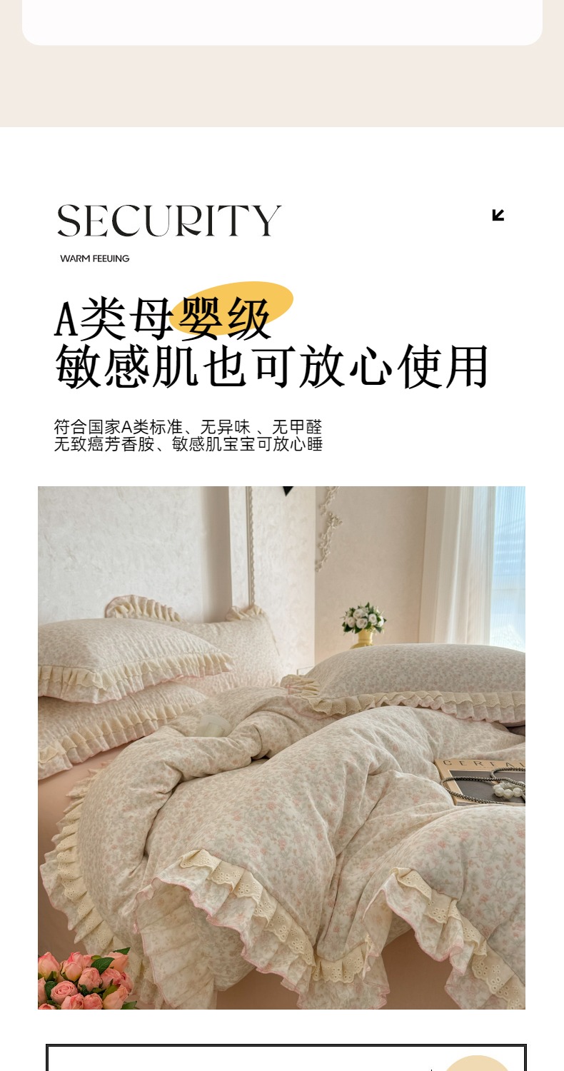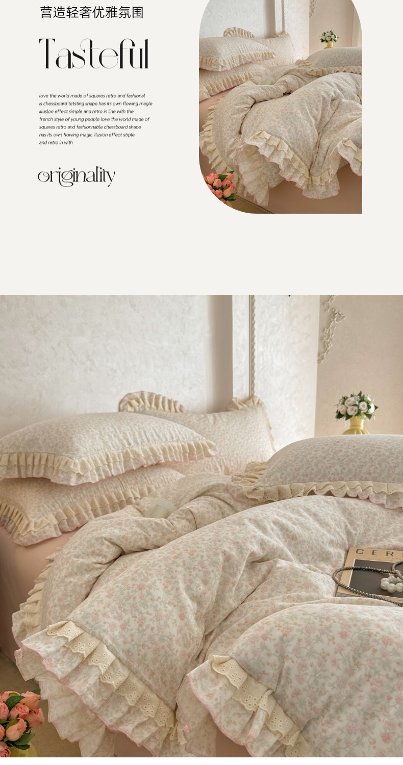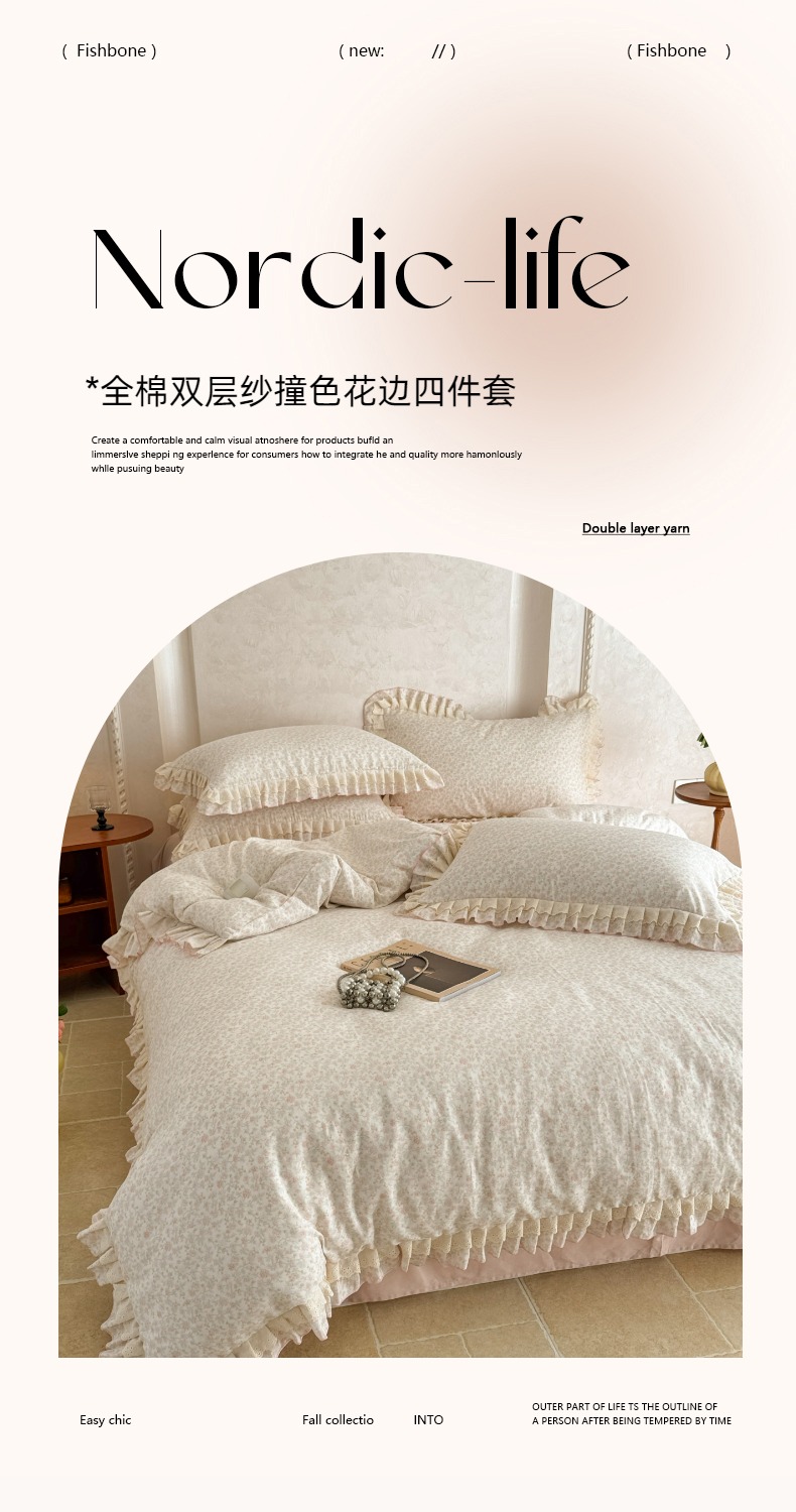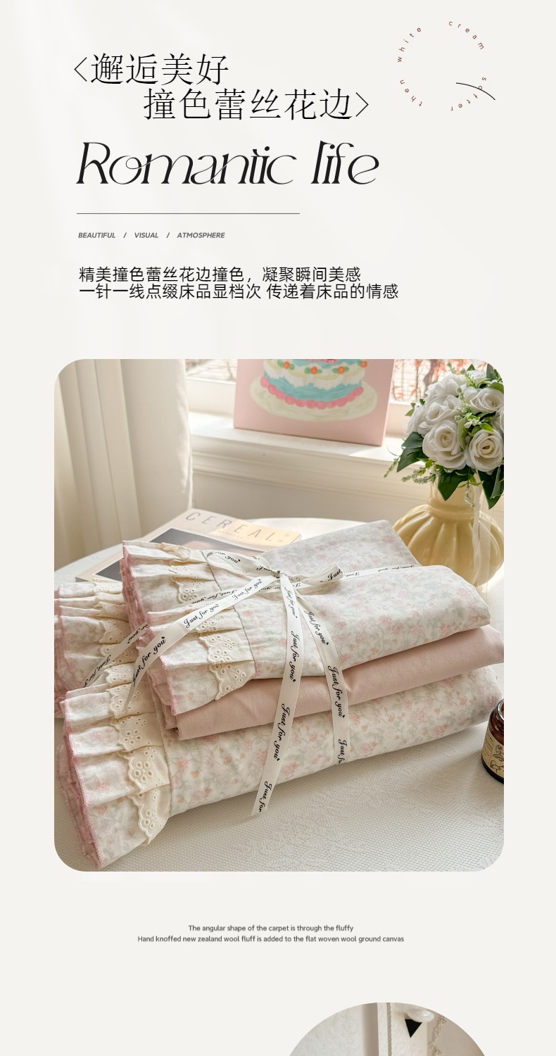 简宜家居(朝初家纺) 2025新款40s全棉纯棉双层纱撞色蕾丝花边四件套 琼花粉絮