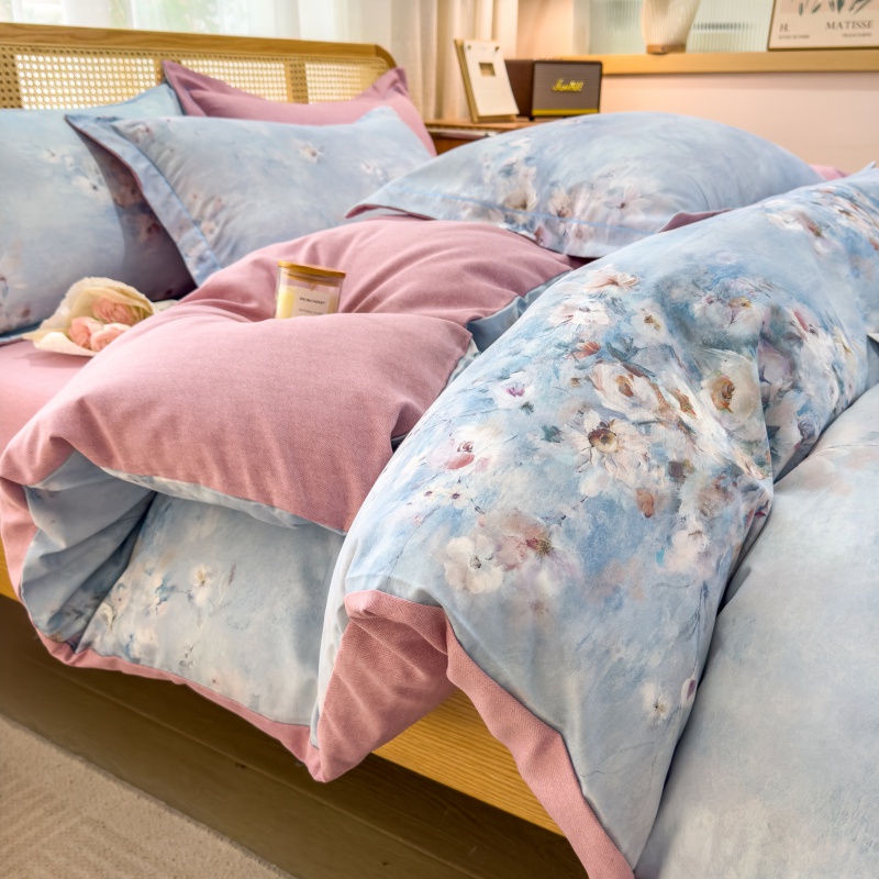 (总)鸿森林 2025新款全棉纯棉磨毛印花四件套,德芙-粉,花吟-黄,浪漫花舞-兰,露西-灰,律动-粉,落樱-粉,曼城-蓝,莫奈-灰,莫奈-咖,沙慕-蓝