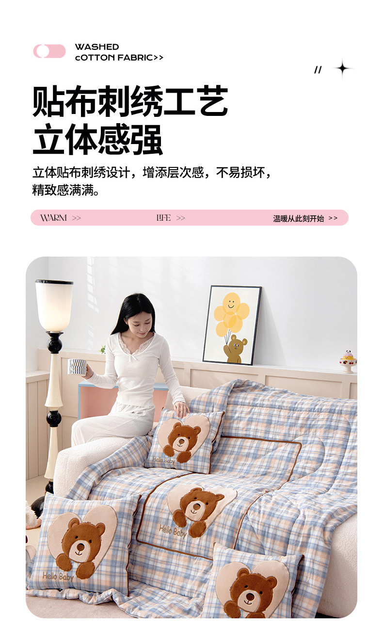 (总)阳光依佰 2024新款四季款全棉贴布绣华夫格抱枕被--元气熊系列,元气熊-冰川蓝,元气熊-橄榄绿,元气熊-奶昔灰,元气熊-青柠,元气熊-樱花粉