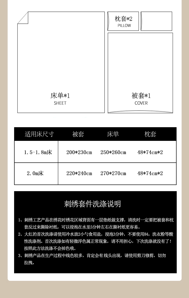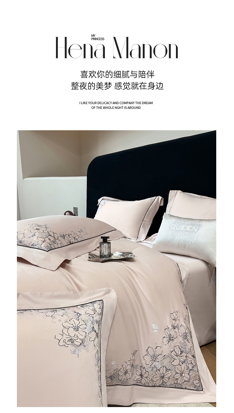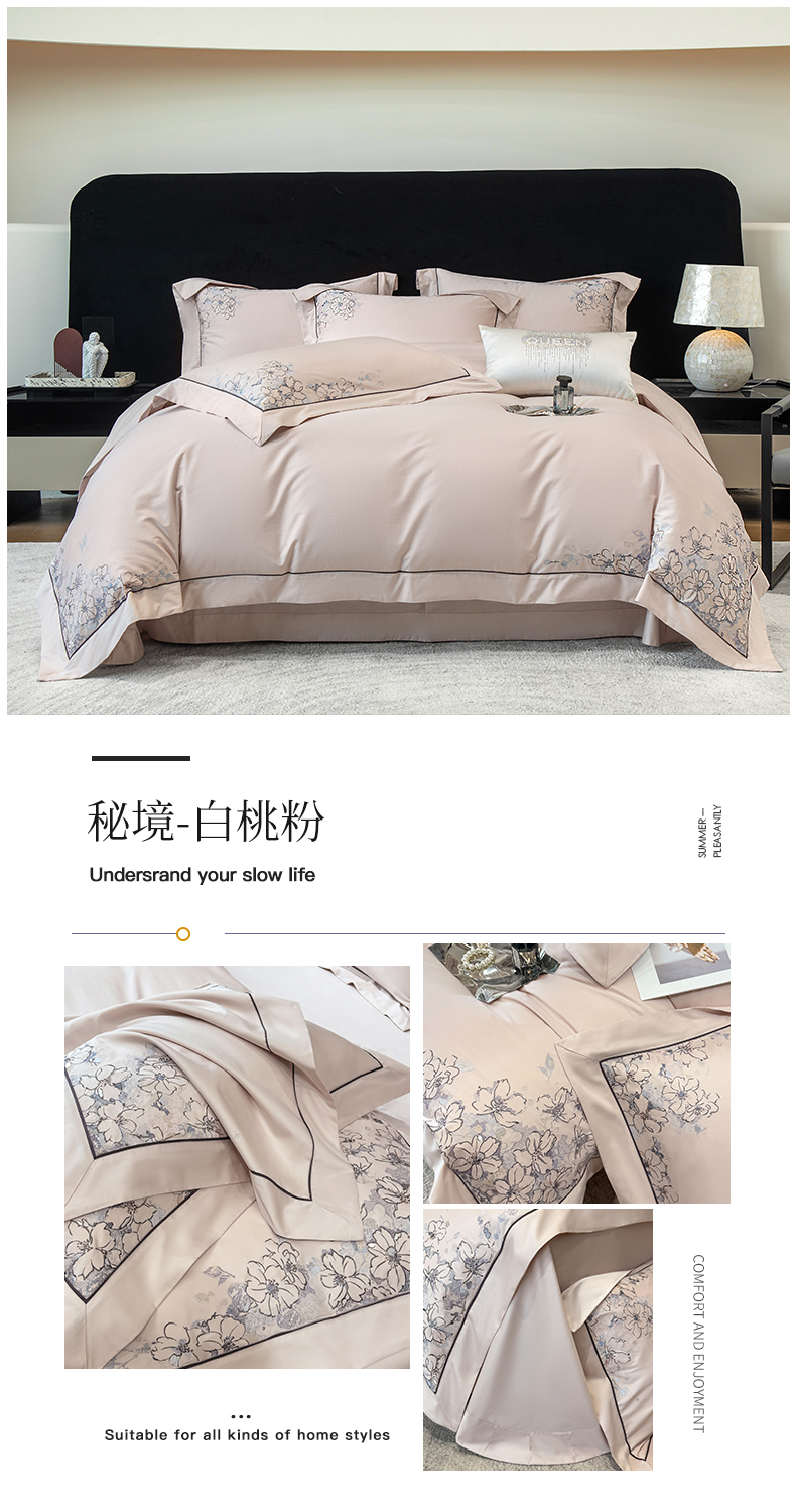 商品名称:张公子婚庆馆 2025新款140支新疆长绒棉纯棉居家绣花拼角工艺系列四件套—秘境 秘境-白桃粉