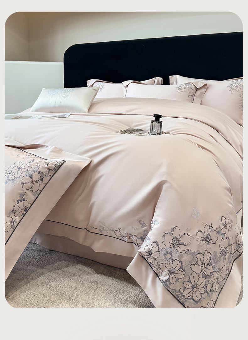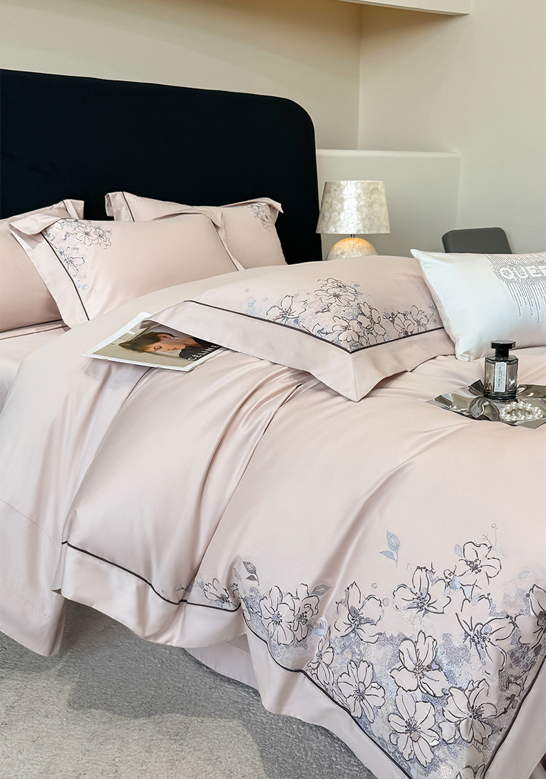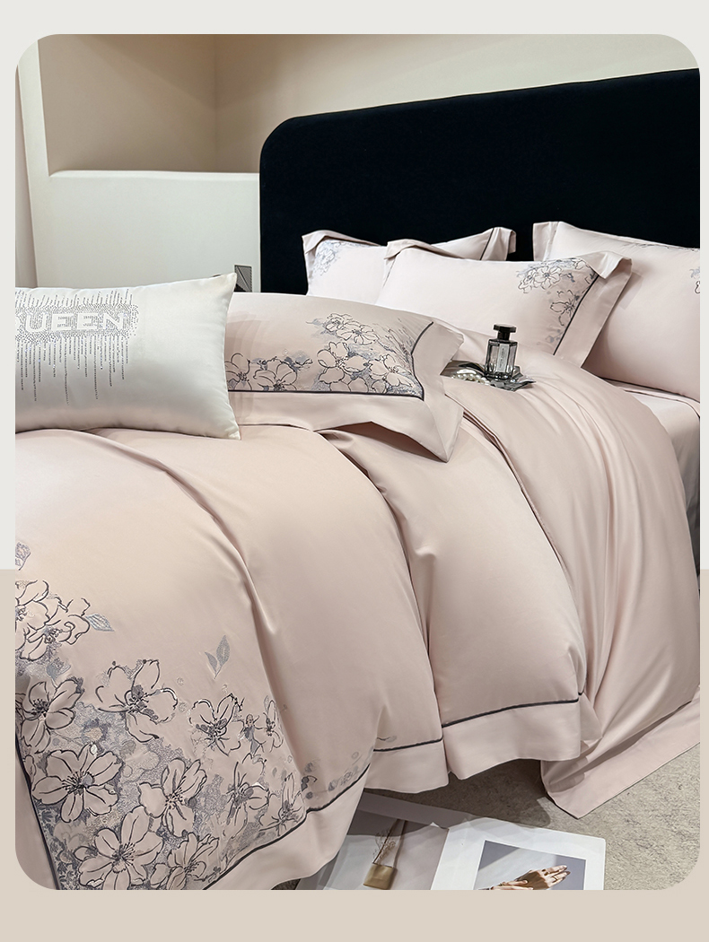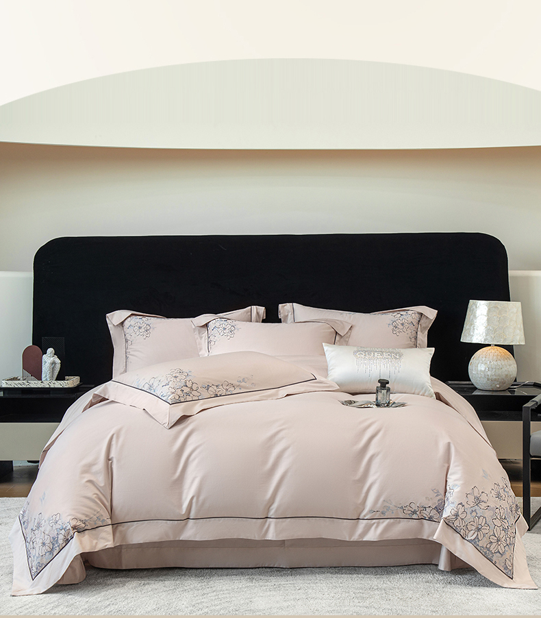 张公子婚庆馆 2025新款140支新疆长绒棉纯棉居家绣花拼角工艺系列四件套—秘境 秘境-白桃粉