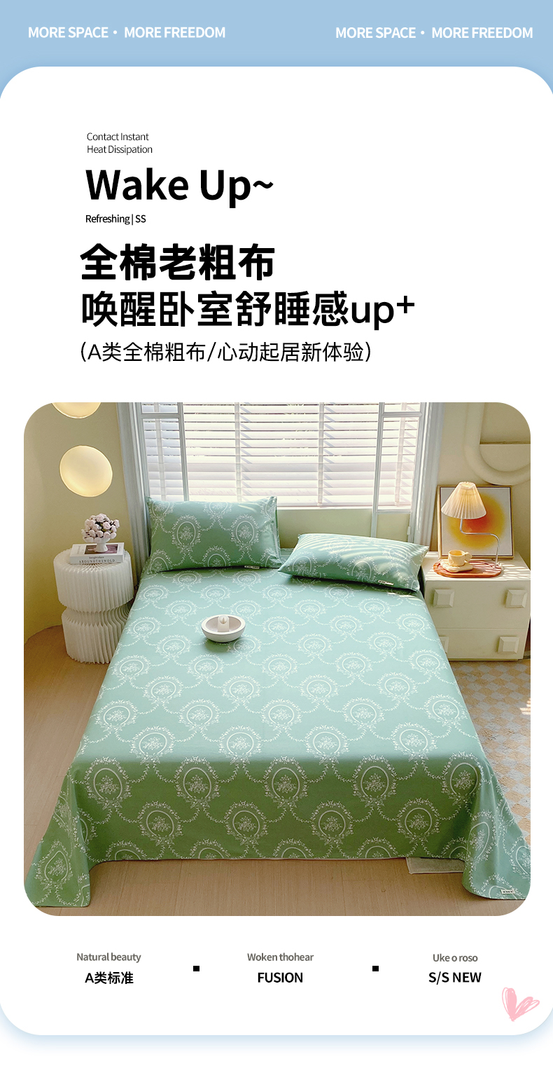 (总)金鑫汇家纺 2026新款全棉印花小清新单品床单系列-可露丽,海盐可露丽,浅咖可露丽,浅绿可露丽,月下花影-桔,月下花影-蓝,月下花影-绿