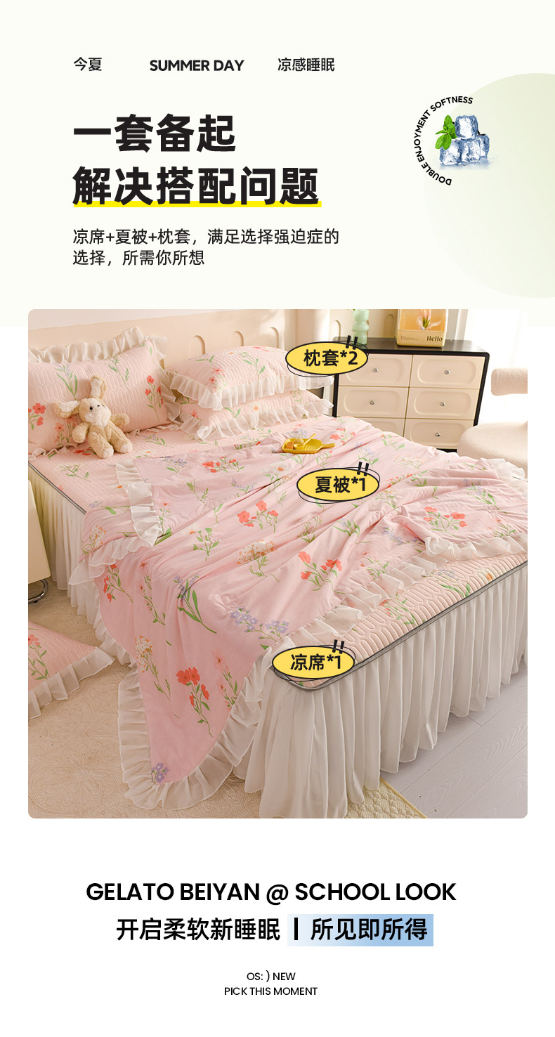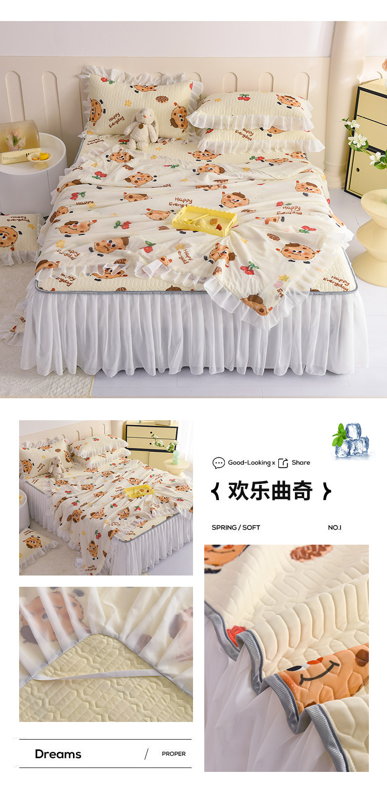 当前位置: 91家纺网 > 商品网购 > 床品套件 > 四件套 > 夏被四件套 > 悦织湾家纺 2025新款A类凉感丝床裙款乳胶凉席席子夏被夏凉被空调被四件套 欢乐企鹅