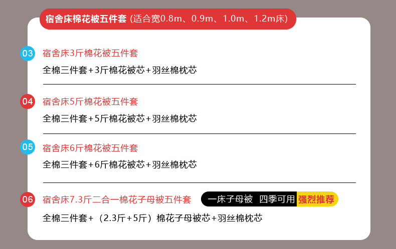 【床单款】0.9m床7.3斤棉花子母被五件套 | ¥202.00 |