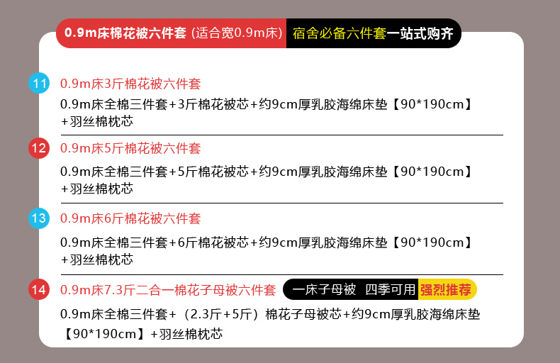 【海绵床垫床单款】0.9m床7.3斤羽丝棉子母被六件套 | ¥261.00 |