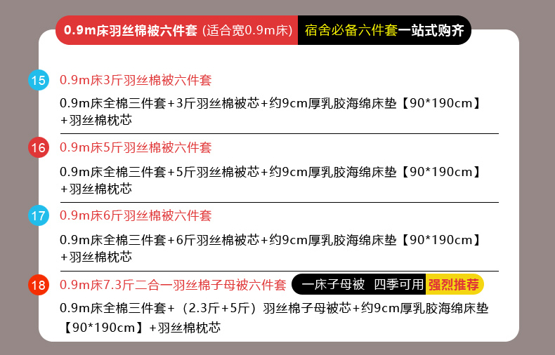 【海绵床垫床单款】0.9m床5斤羽丝棉被六件套 | ¥217.00 |