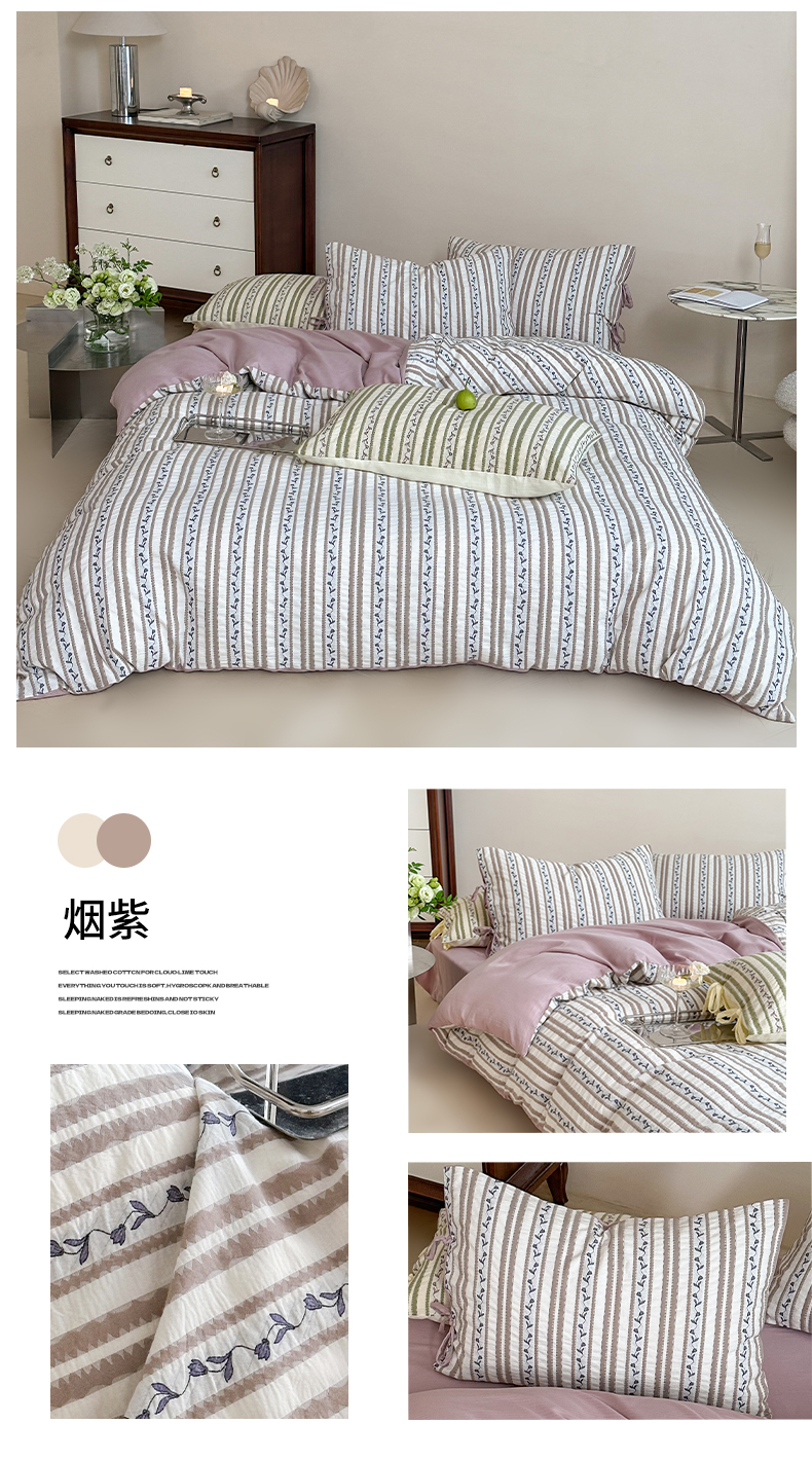当前位置: 91家纺网 > 商品网购 > 床品套件 > 四件套 > 色织四件套 > 圆岛家纺 2025新款清新全棉色织三层纱提花四件套 烟紫