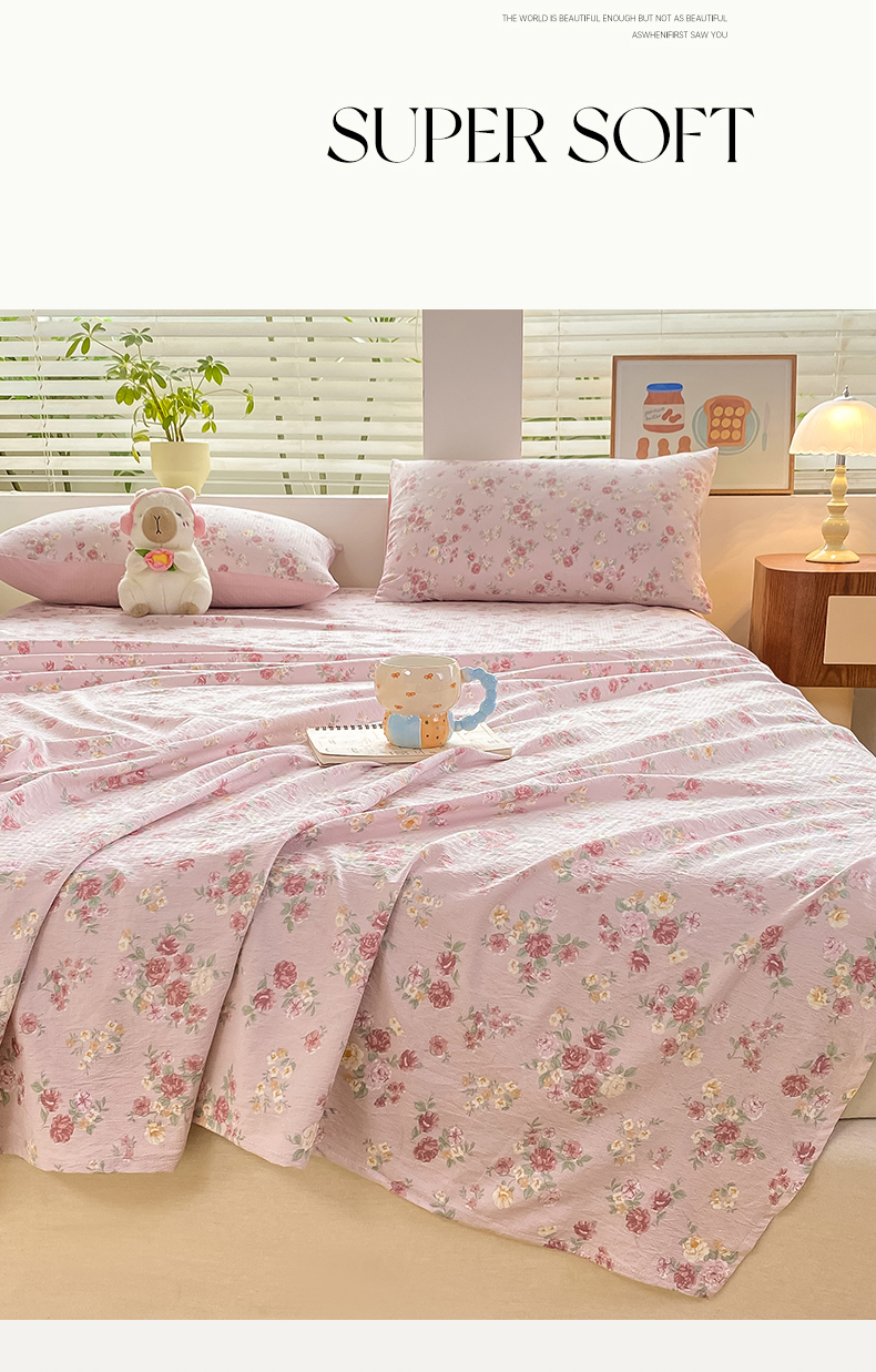商品名称:雅阁尔家纺 2025新款直播小红书ins风针织提花双层纱美式碎花简约床单单品单床单+枕套 玫瑰物语