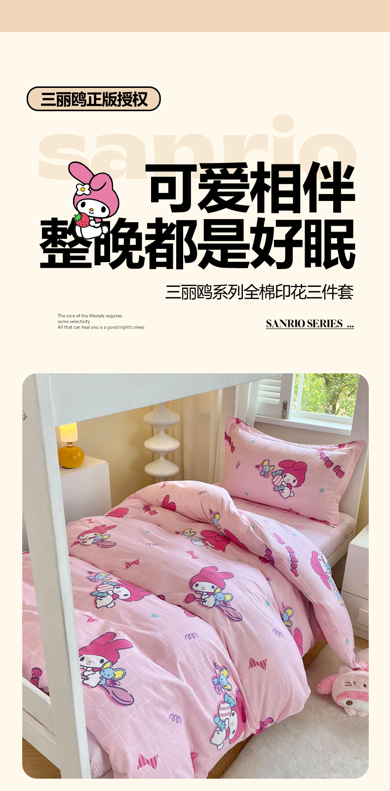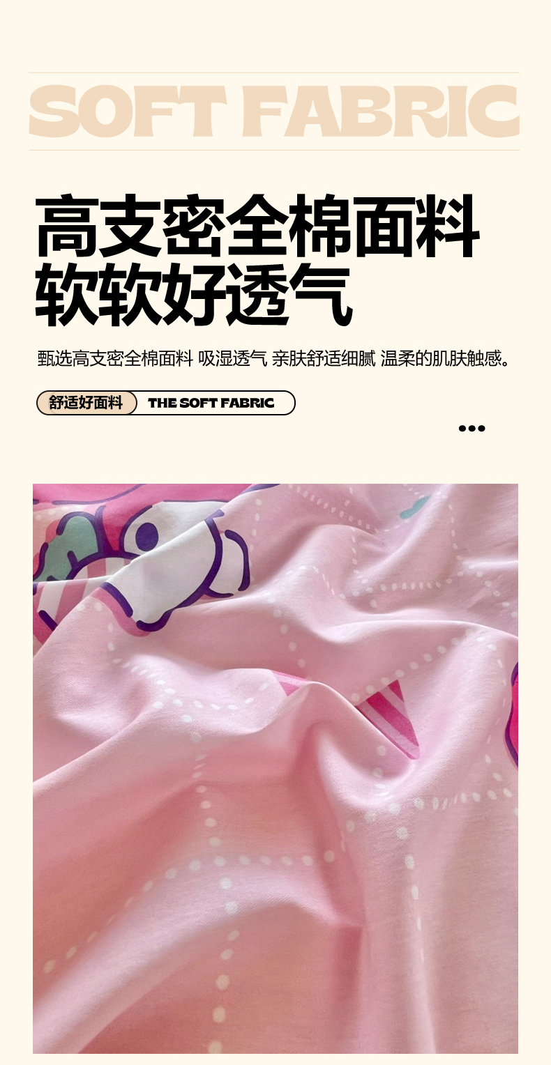 当前位置: 91家纺网 > 商品网购 > 床品套件 > 三件套 > 蘭菲家纺 2025新款三丽鸥系列全棉印花三件套、四件套 美食家