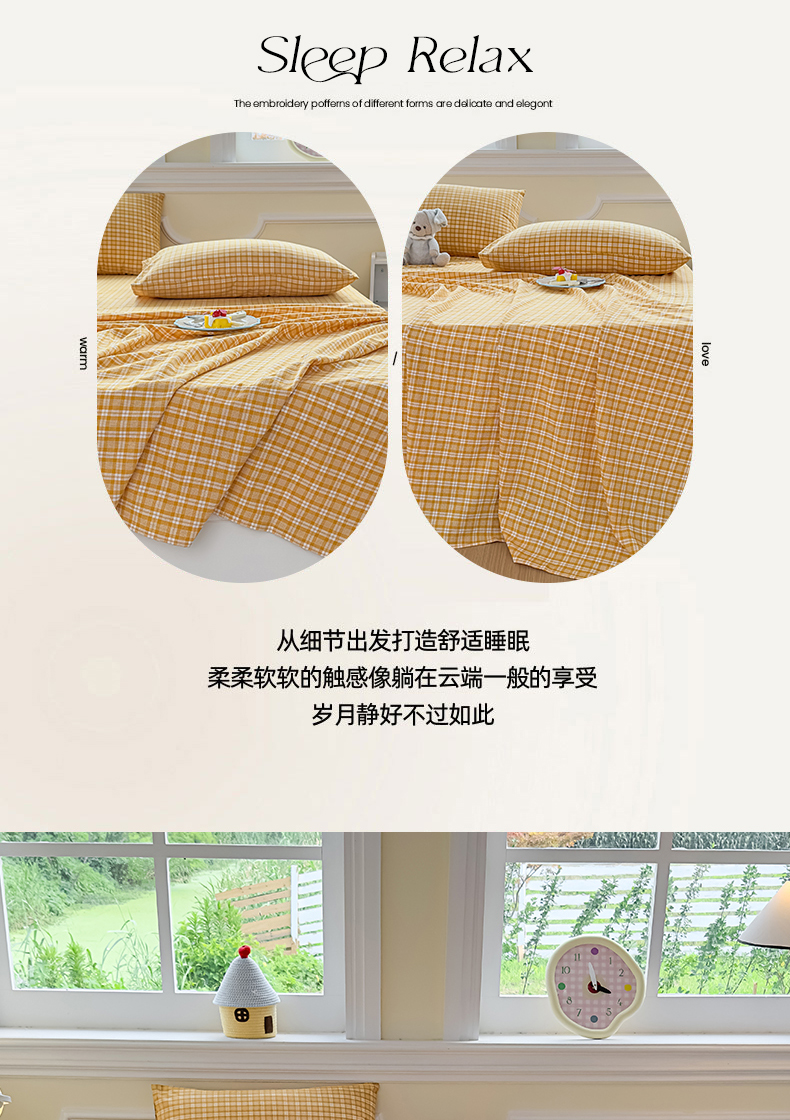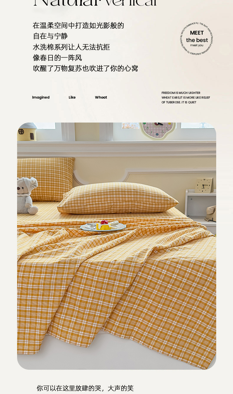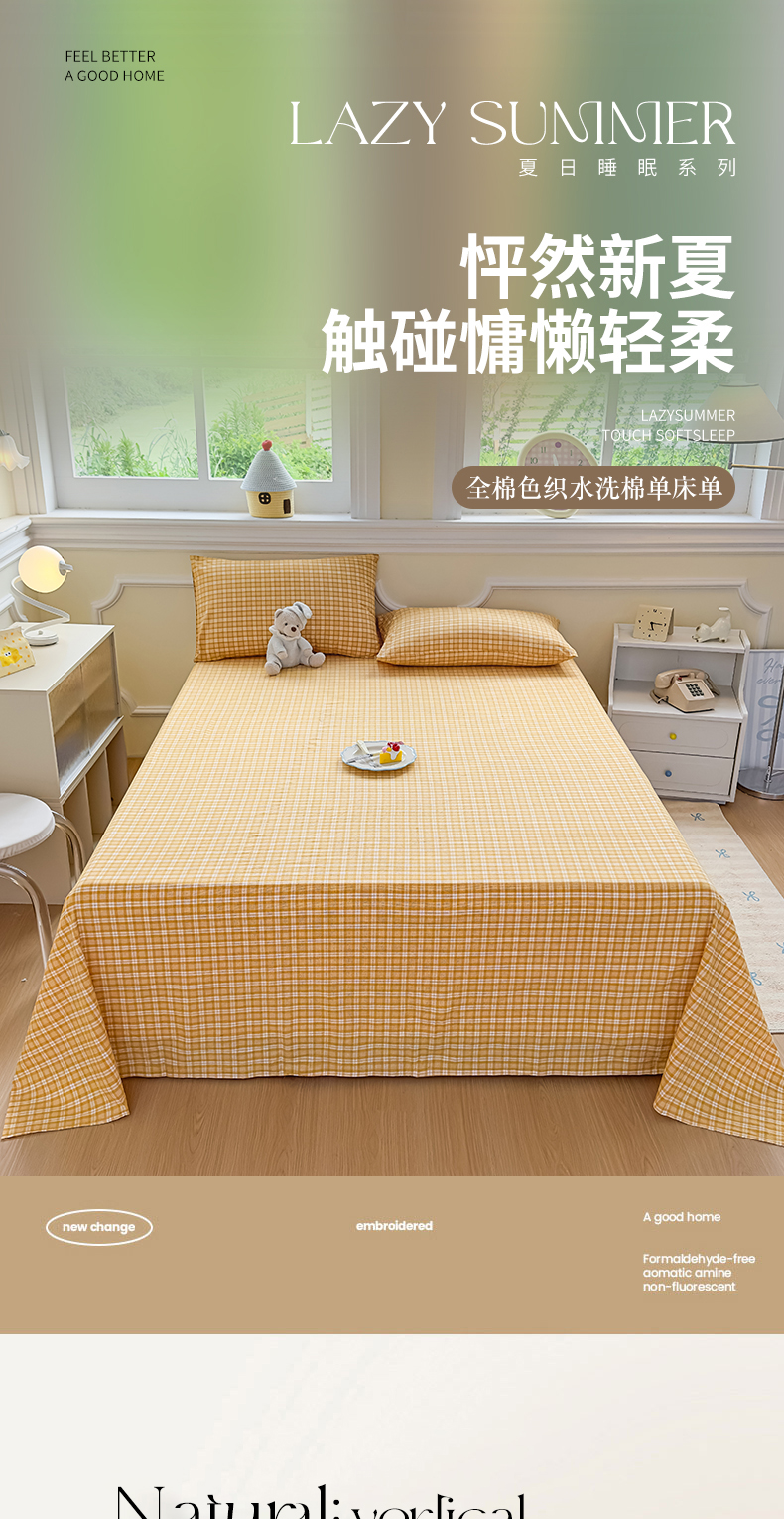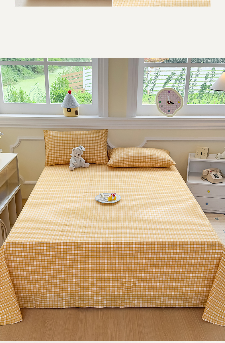 菡宝 2025新款全棉纯棉色织水洗棉单床单 黄格调