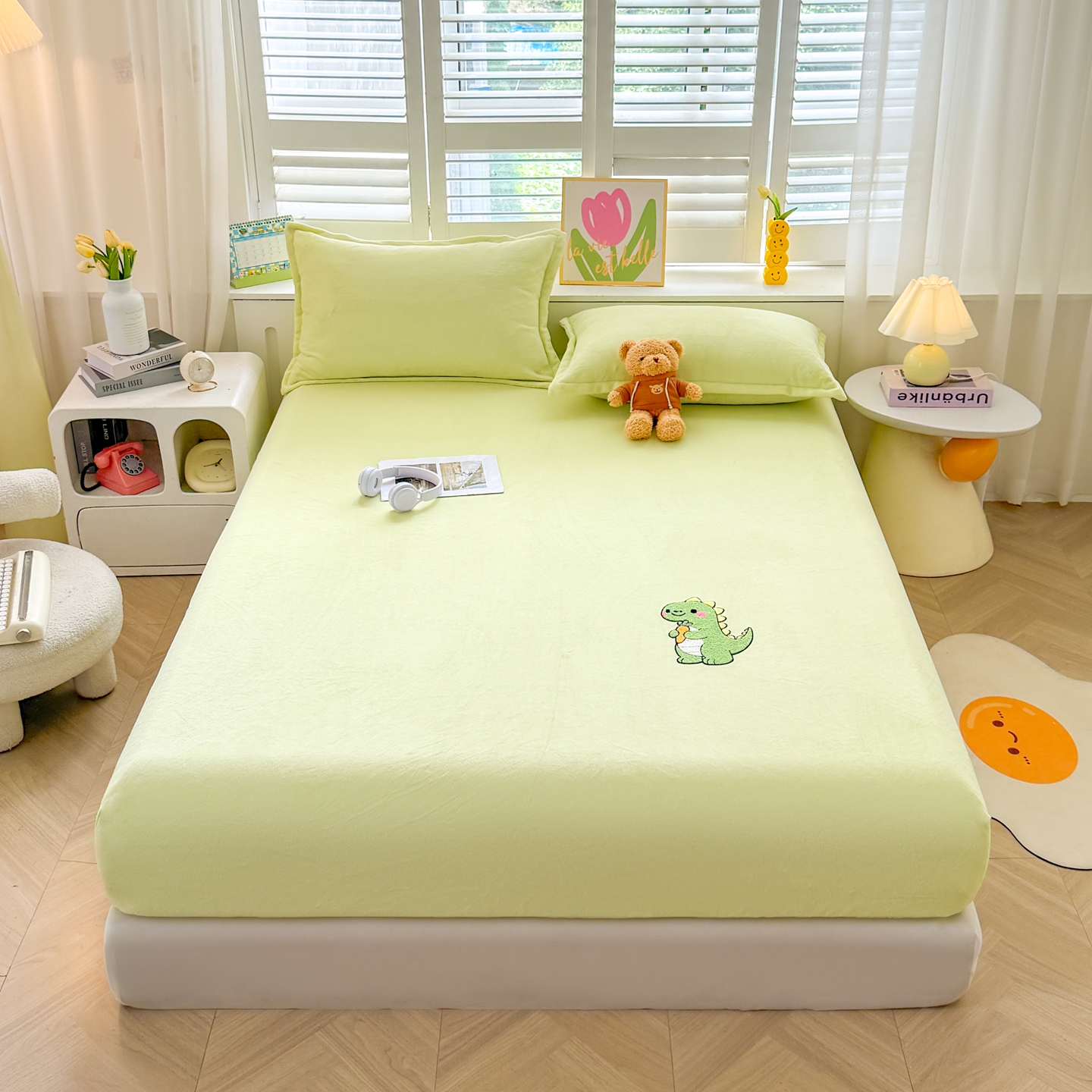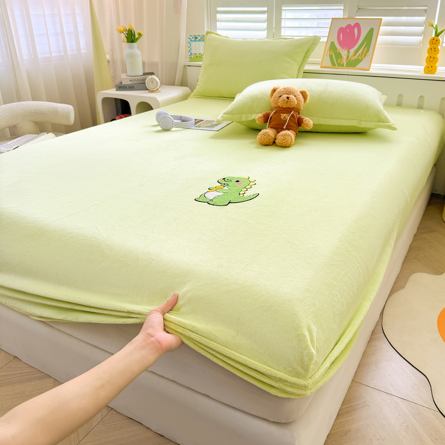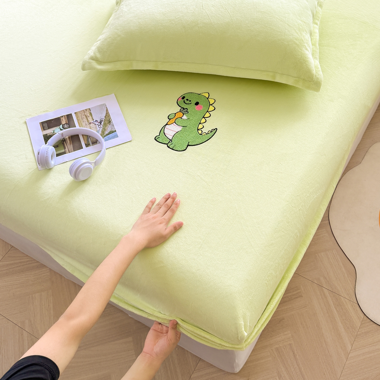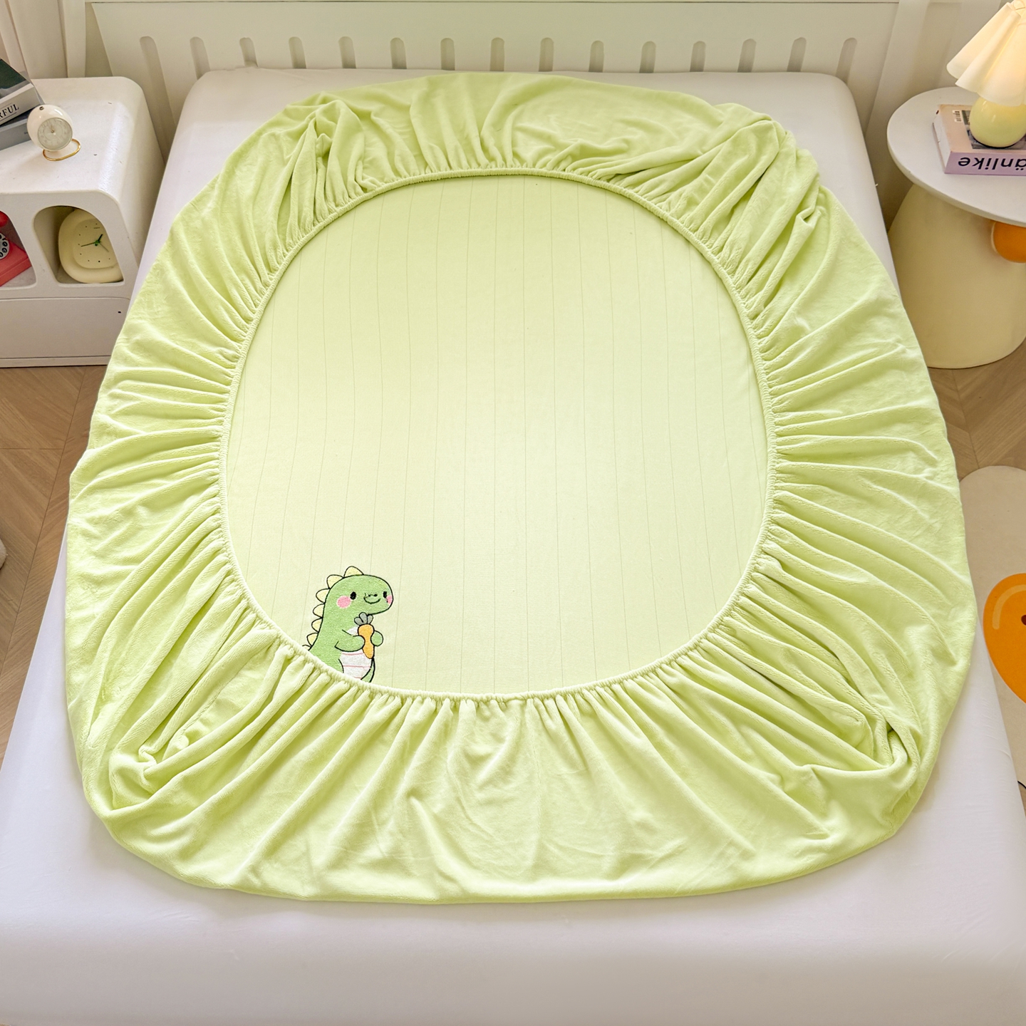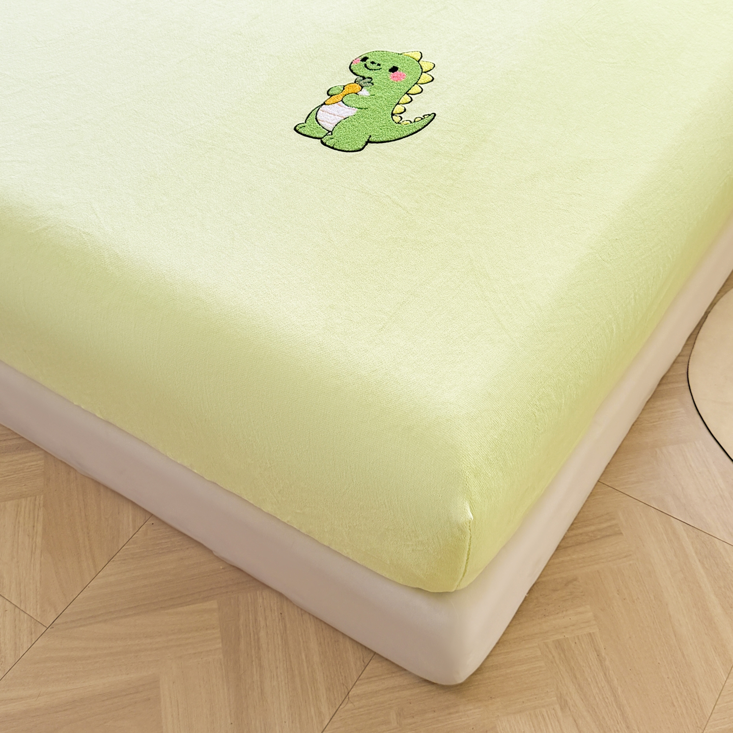 湘之帛 2025新款牛奶绒印花床笠 小恐龙-浅绿
