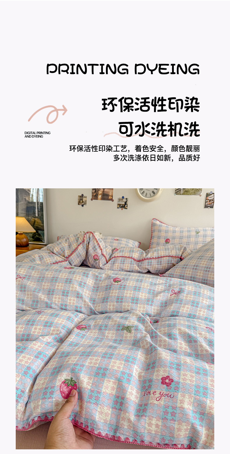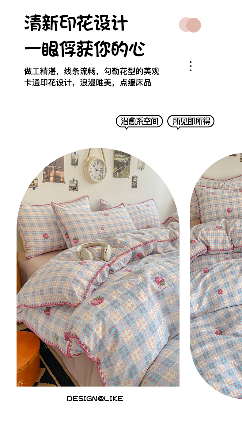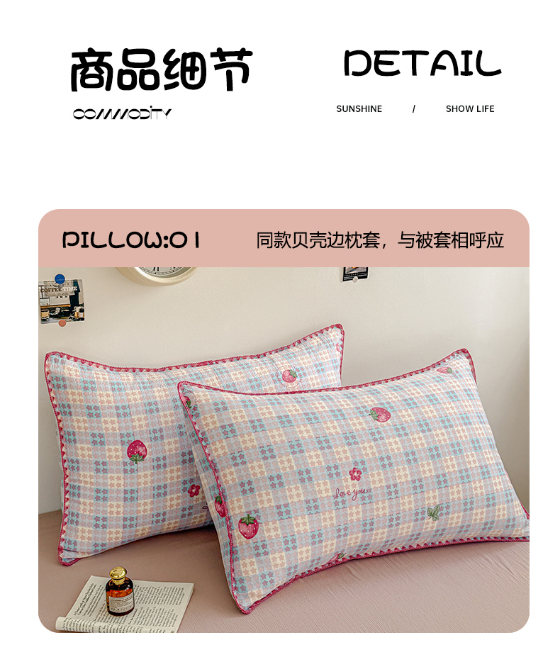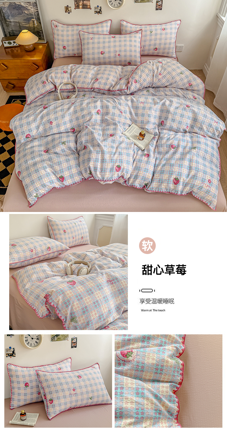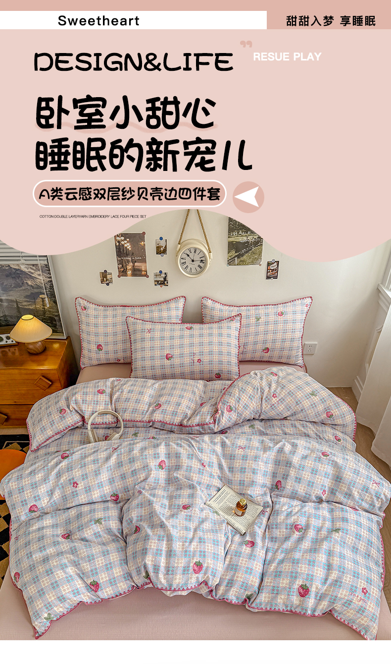 商品名称:晚爱家纺(原晚安家居) 2025新款云感双层纱贝壳边三角针工艺卡通小清新小碎花四件套 草莓甜心