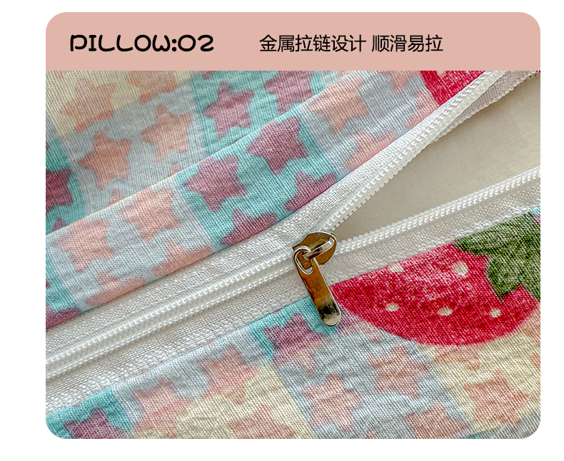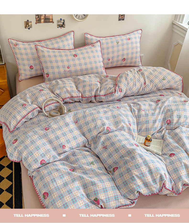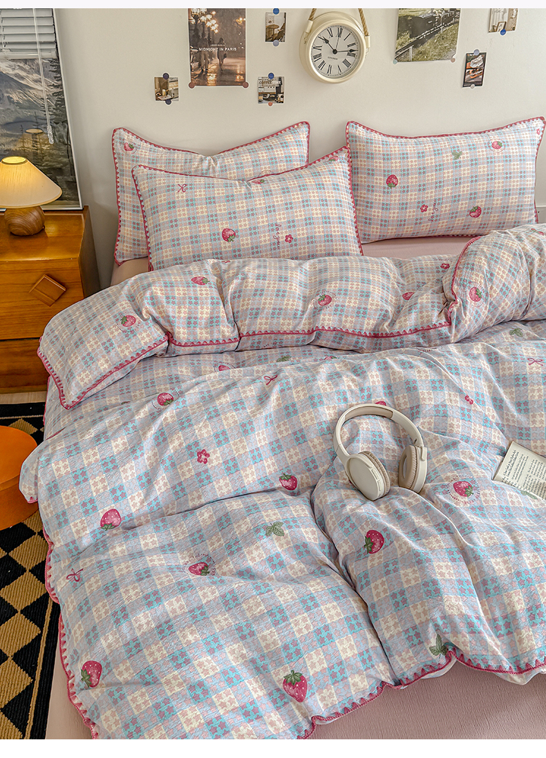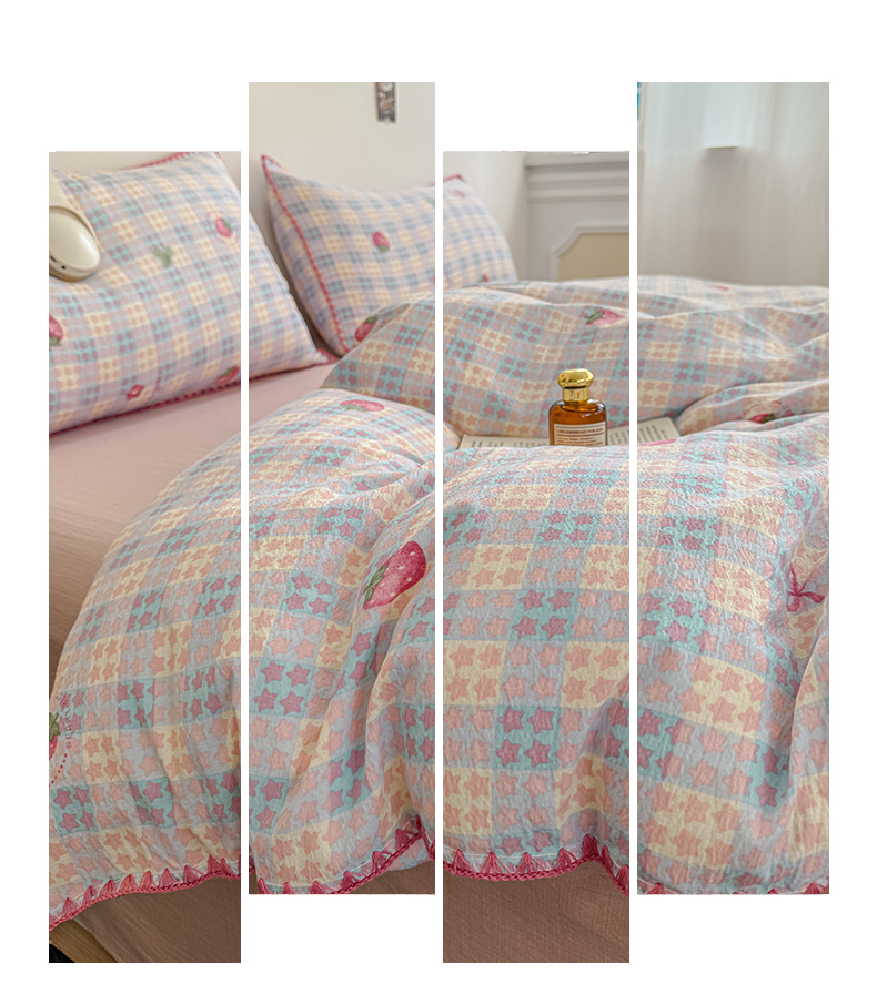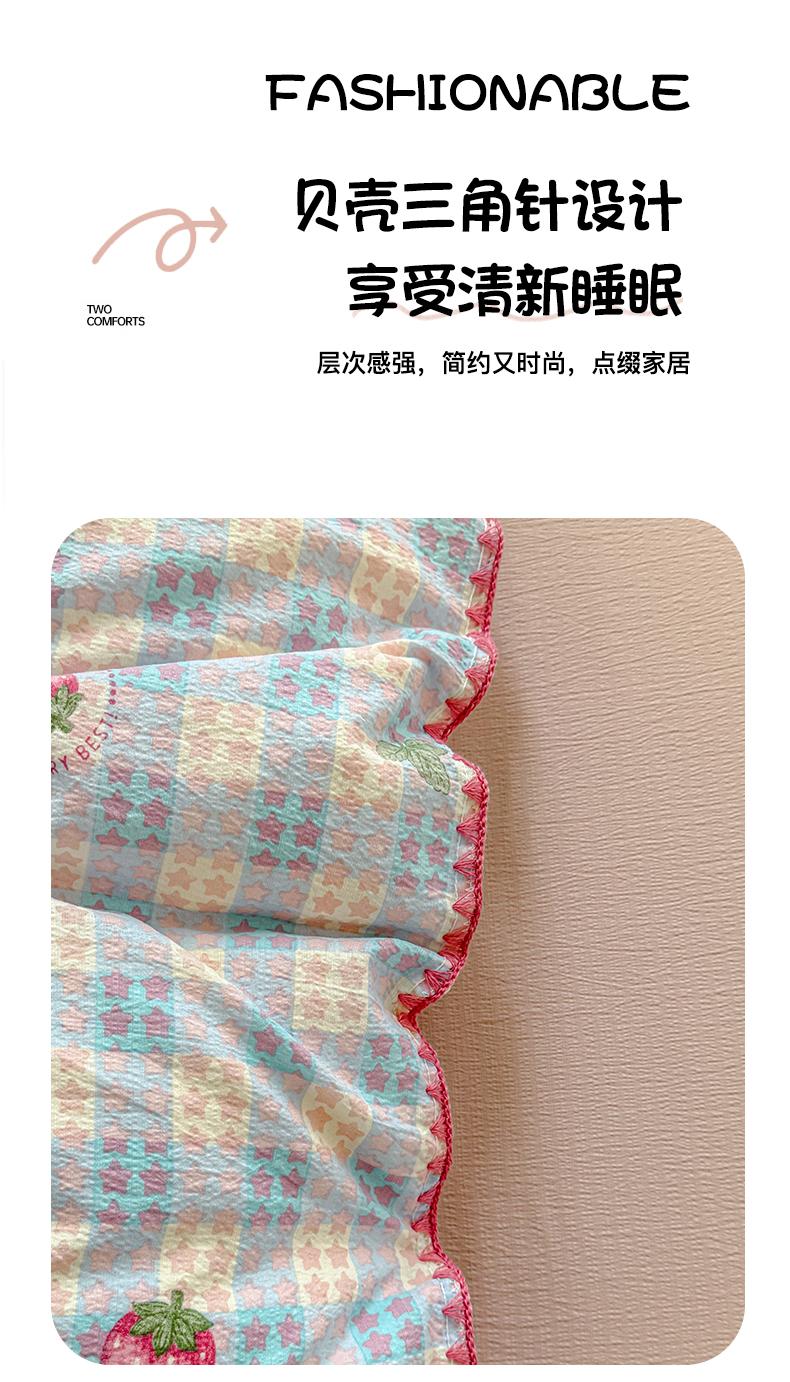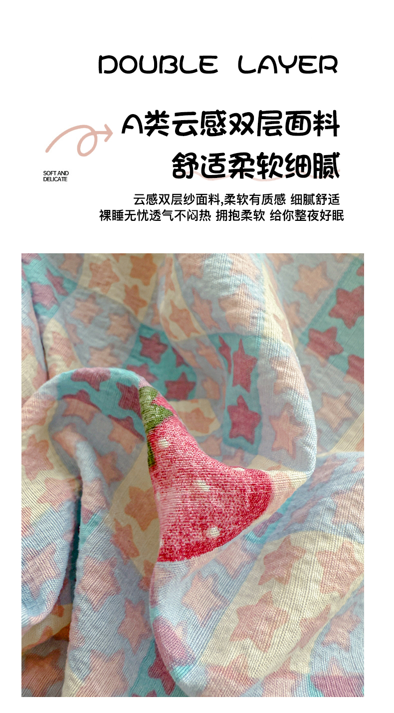 商品名称:晚爱家纺(原晚安家居) 2025新款云感双层纱贝壳边三角针工艺卡通小清新小碎花四件套 草莓甜心