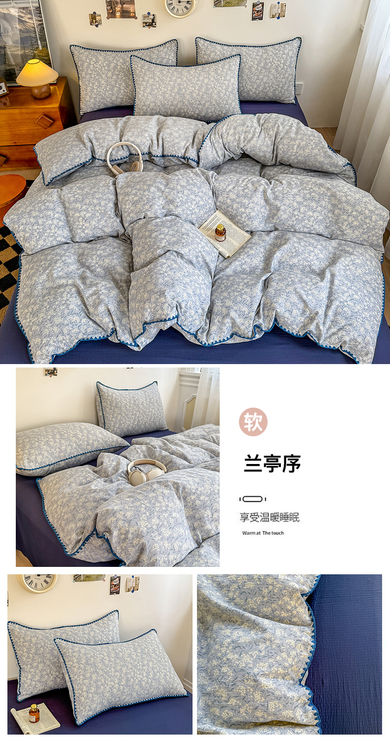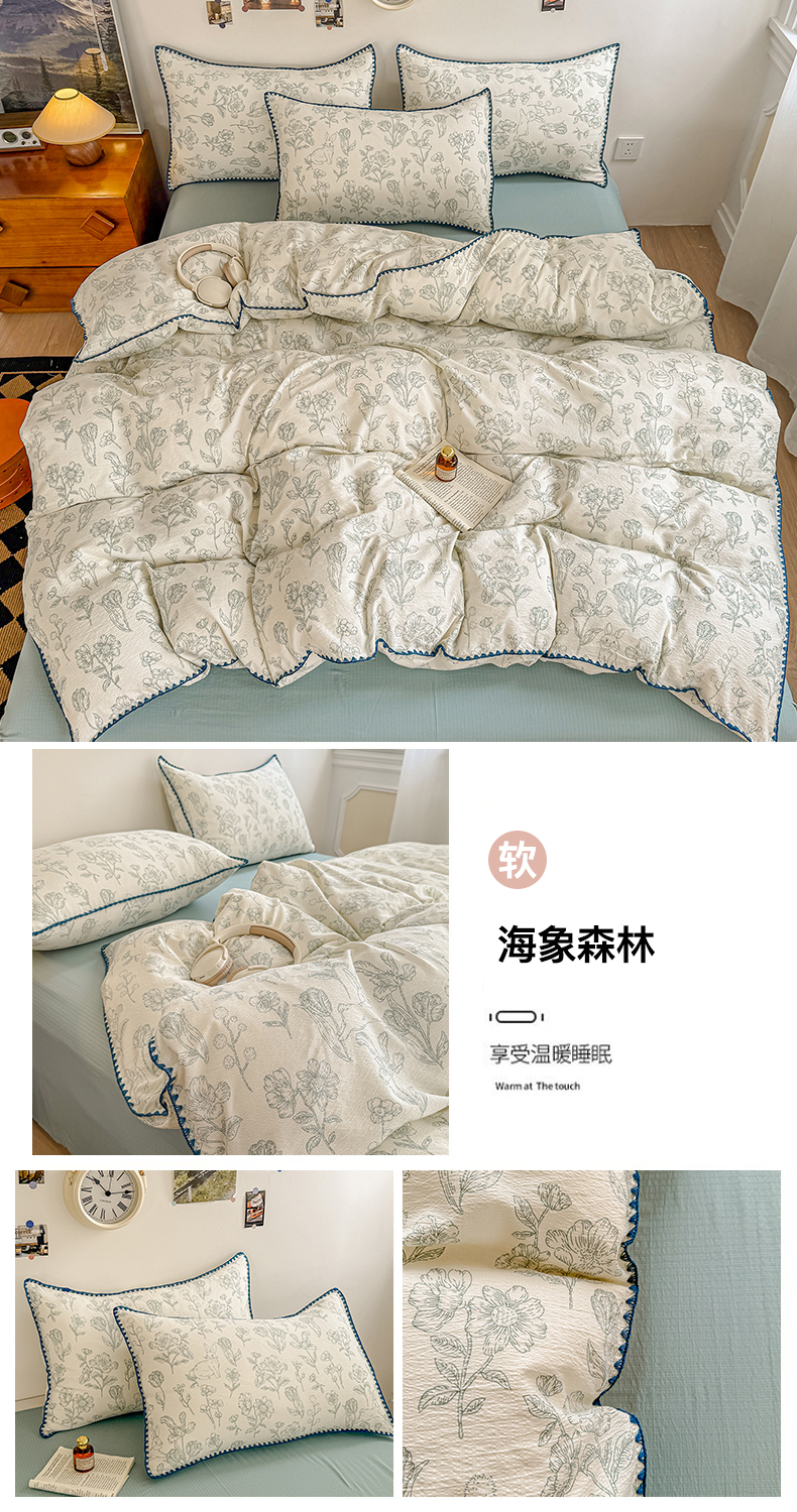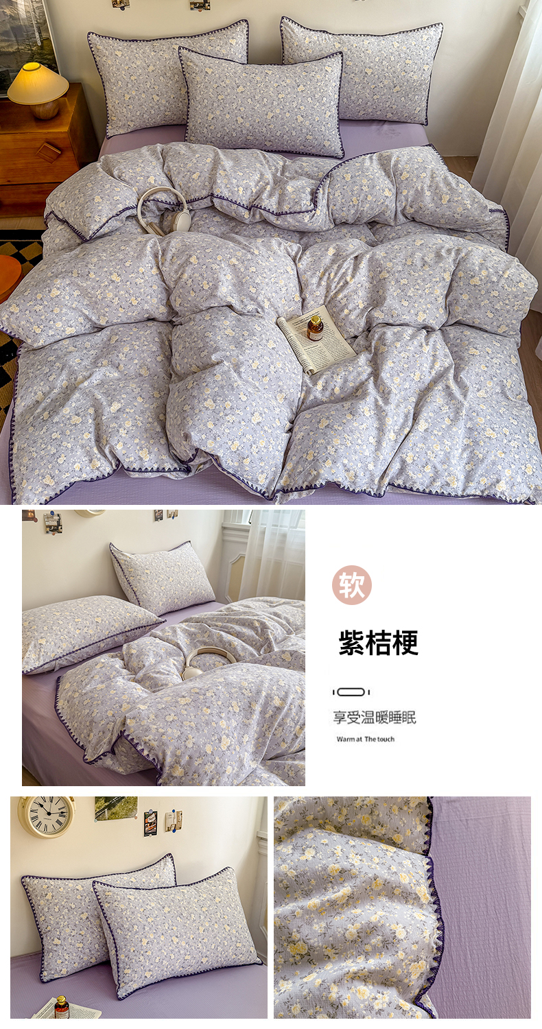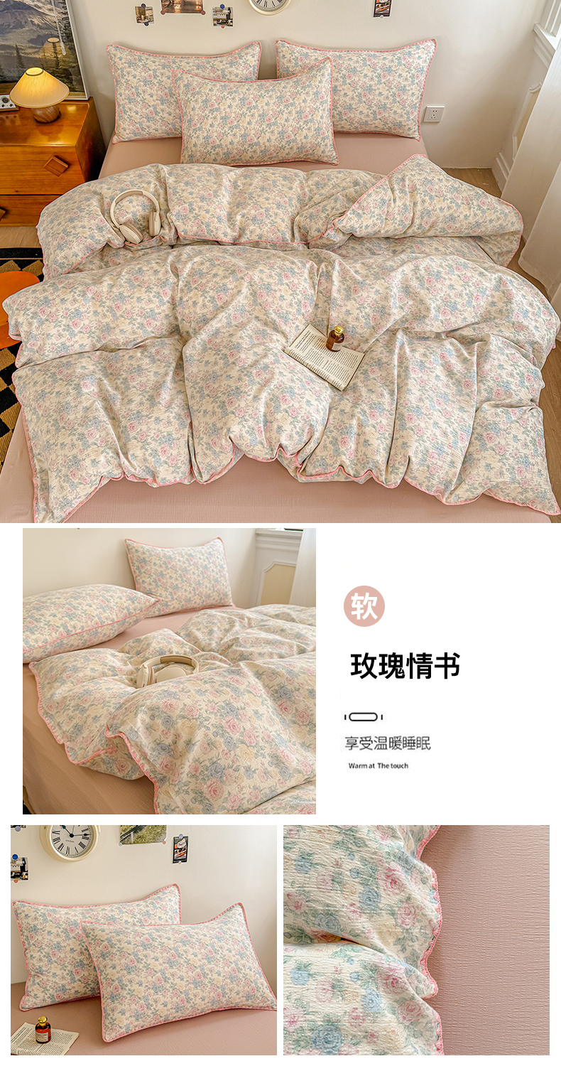 (总)晚爱家纺(原晚安家居) 2025新款云感双层纱贝壳边三角针工艺卡通小清新小碎花四件套,爱如星辰,波点黄,草莓甜心,粉色玫瑰,风铃,海象森林,花语蓝,兰亭序,蓝色蝴蝶结,玫瑰情书,奇妙小熊,倾心咖,小爱心,紫菊梗,紫色小兔