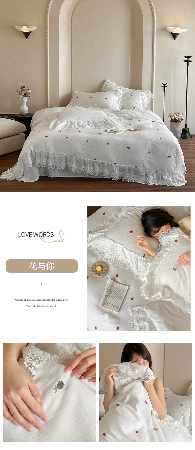 商品名称:(总)玛奇朵 2025新品法式蕾丝花边款双层纱提花四件套-花与你